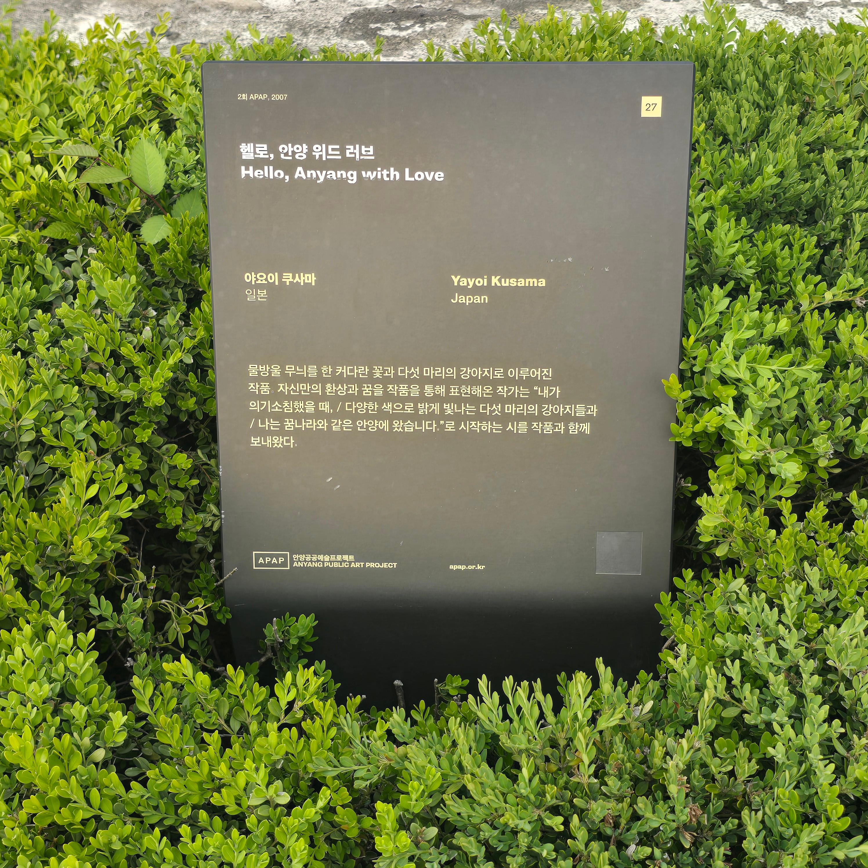 특히 평화공원에는 안양공공예술프로젝트(APAP2007)작품이 설치돼 있는데 일본의 세계적인 작가 야요이 쿠사마의 '헬로, 안양 위드 러브'라는 작품이다. 작품 설명으로는 작가가 '의기소침했을 때 다양한 색으로 밝게 빛나는 다섯 마리의 강아지들과 꿈나라와 같은 안양에 왔다'라는 내용의 시와 함께 작품을 보내왔다고 설명되어 있다. 아이들과 작품 구경하면 좋아할듯한 형상이다.