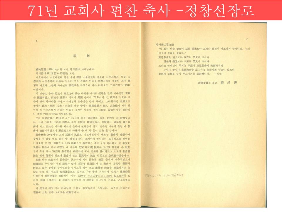 115년전 옛 부림말 교회의 뿌리를 잇는 현 동은교회는 안병인 사무장 등 원로 교인들과 기록의 중요성을 알고 계시는 분들의 관심과 노력으로 발견한 초창기 부림말교회의 당회록, 영수증 등 옛 문건을 잘 보관해왔으며 지금도 교회의 역사와 뿌리찾기 계속하고 있다. PDF자료 작성 및 제공: 안양 동은교회