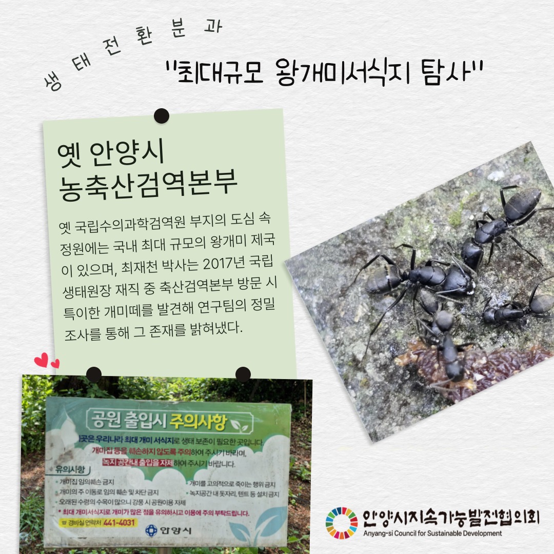 이날 국내 최대규모의 안양6동 옛검역원 정원의 왕개미 서식지 모니터링에 나선 어른들은 동심으로 돌아간듯 왕개미 관찰에 푹 빠졌다. 왕개미 탐사에서는 왕개미 사진 콘테스트도 개최됐다. 과연 누구의 사진이 뽑힐 것인가~🏆🐜
