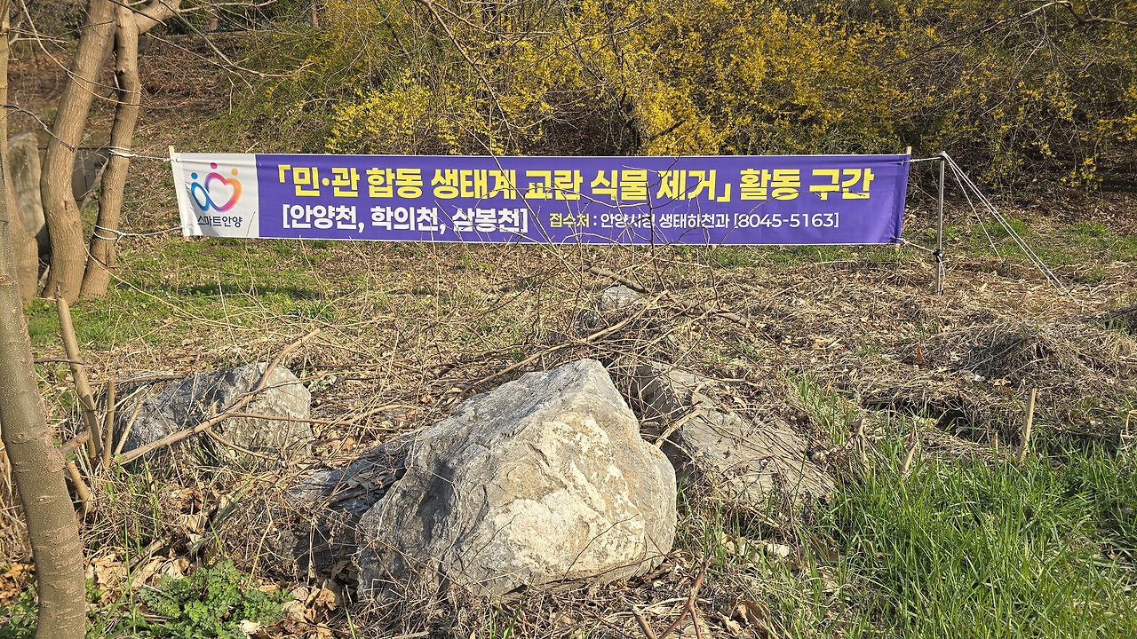 힌편 안양시는 지난 4월부터 관내 (주)동아오츠카 등 기업을 비롯 주민자치협의회, 시민 정원사회, 해병대 전우회, 안양시지속가능발전협의회, 안양·군포·의왕환경운동연합, 안양시자원봉사센터 등 각종 단체와 시민들이 환삼덩굴과 단풍잎 돼지풀, 가시박 등 생태계 교란 식물의 어린 개체를 뿌리 뽑는 작업에 시작했으며 이후로도 지속적으로 실시할 예정이다.