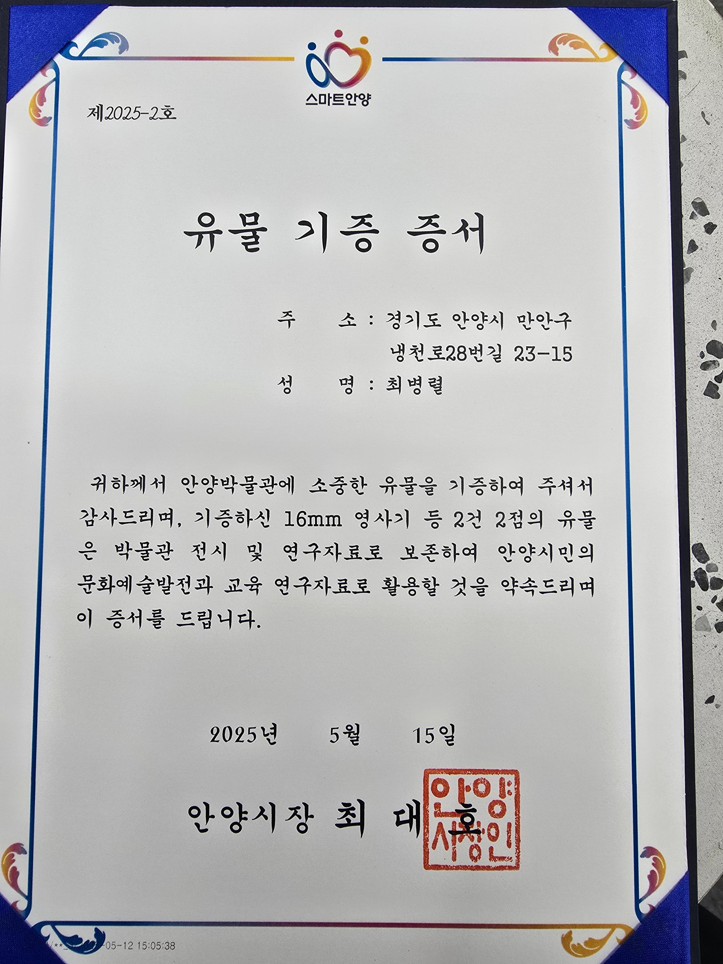 [20250518]안양박물관에 16mm 영사기 기증 감사패 받다