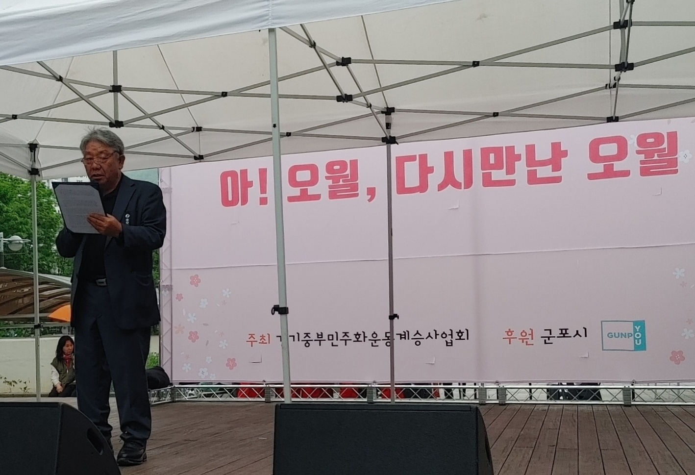 이어 오후 5시부터 군포YMCA 이현정 사무국장 사회로 진행된 기념식은 군포시장, 이학영 국회부의장, 정윤경 경기도의회 의장, 최효숙 경기도의원, 성복임 더불어주당 경기도의원, 김귀근 군포시의회 의장, 이동환 더불어민주당 군포시의원, 이길호 더불어민주당 군포시의원, 이우천 더불어민주당 군포시의원, 신금자 군포시의원과 경기중부민주화운동계승사업회 및 시민단체 회원 등 100여명이 참석한 가운데 쏟아지는 빗속에 기념사, 연대사, 공연, 기념사진 촹영 등의 순으로 진행됐다
