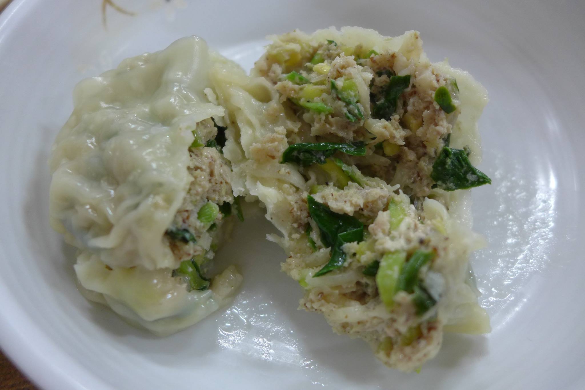 만두전골에는 만두에 숙주나물, 느타리버섯, 그리고 부추도 있고, 2인분을 기준으로 만두전골 안에 만두는 고기만두 두 개, 김치만두 두 개 들어있다. 육수는 약간 붉은색이지만 생각보다 맵지 않다.
