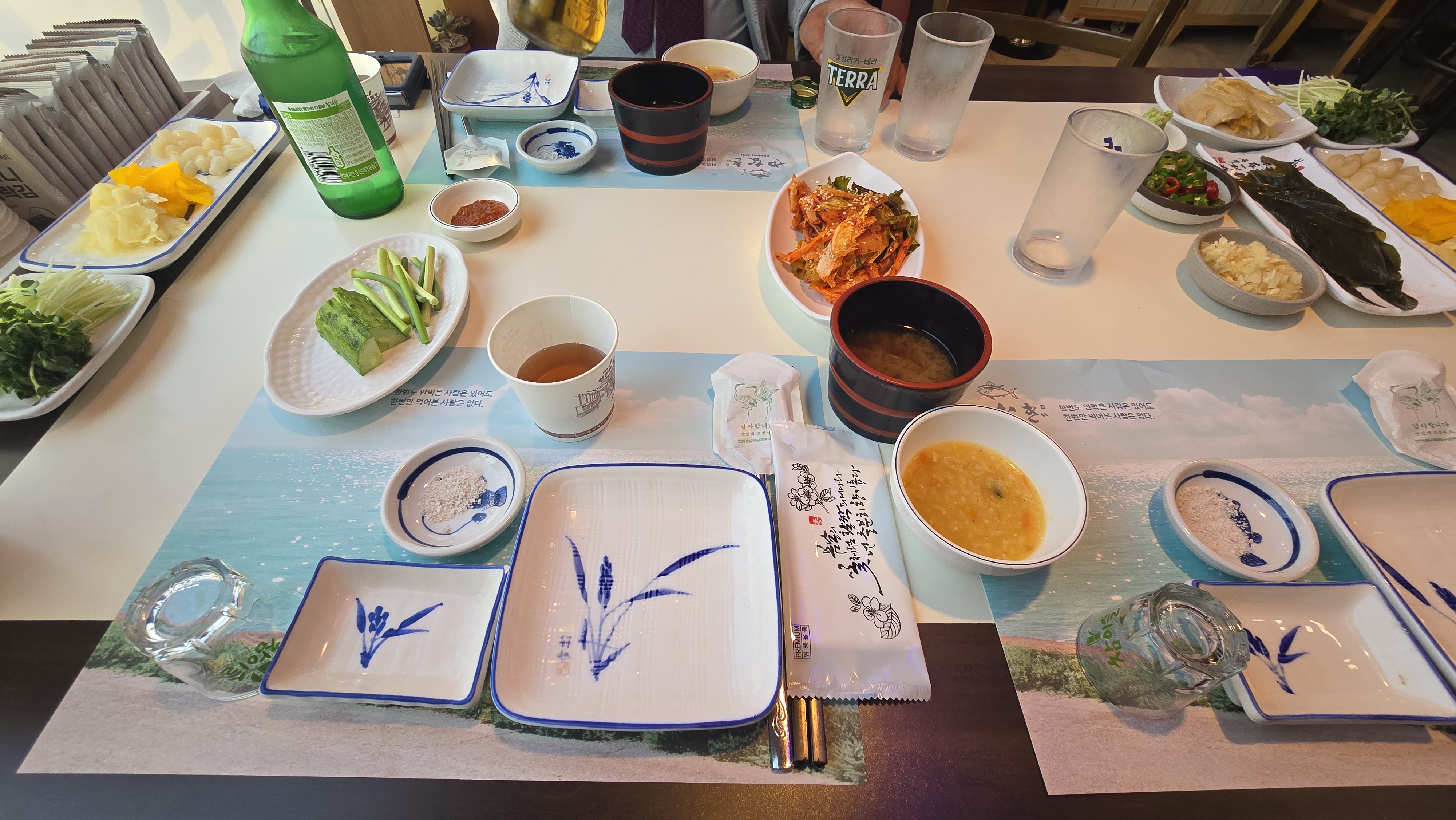 처음 나오는 참치죽이 깔끔하면서 고소한 맛이 입맛을 돋굽니다. 이어 식틱위에 명이나물, 백김치, 특별소금이 들어간 참기름과 막장 등이 등장하는 걸 보니 이 집 주인장 내공이 예삿 솜씨가 아님을 느끼게 합니다.