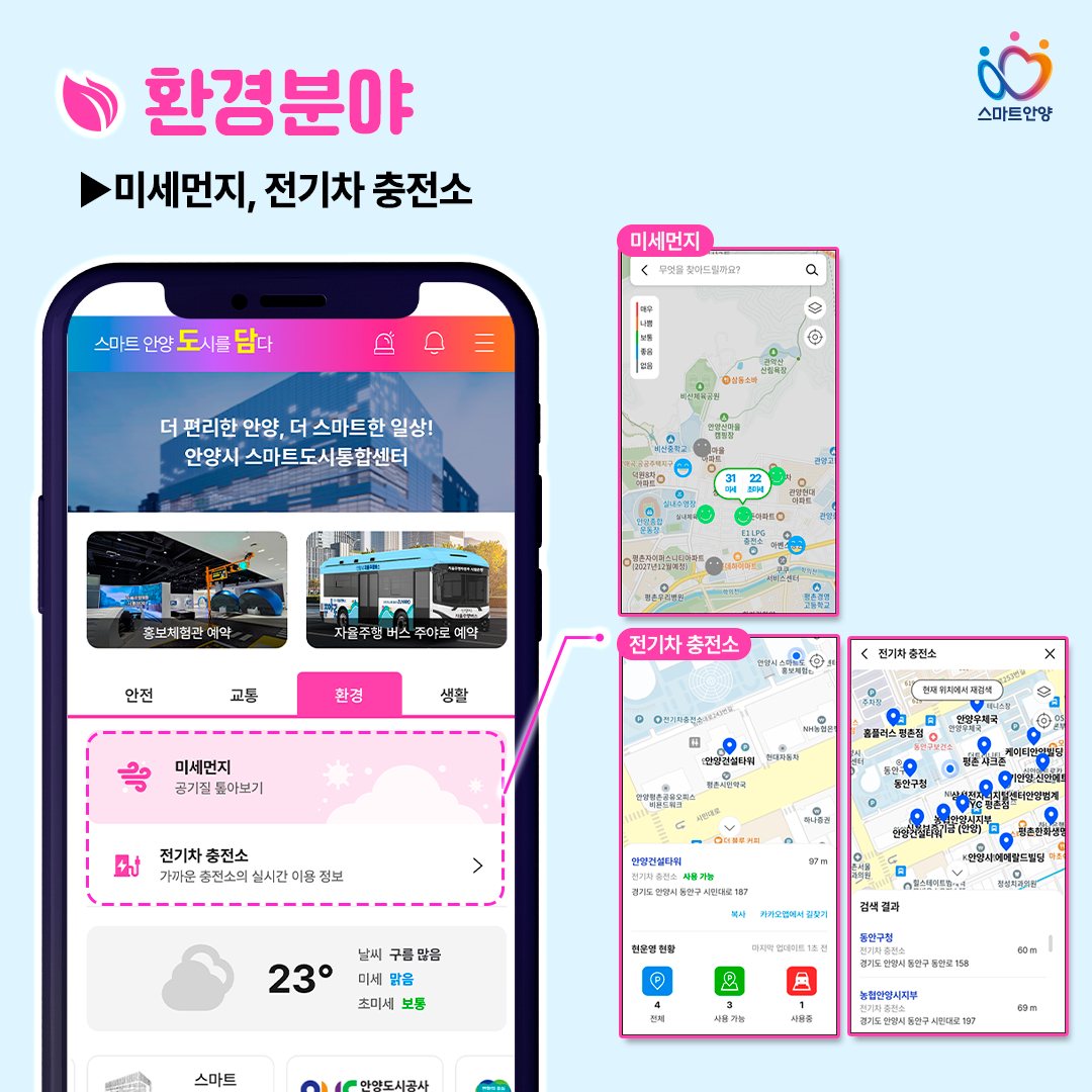 아울러 환경 정보에서는 안양시가 자체적으로 운영하는 미세먼지 센서에서 수집한 세밀한 지역별 대기질 정보, 전기차 사용자들을 위한 전기차 충전소의 위치와 사용가능 여부 실시간 정보 등을 확인할 수 있다.