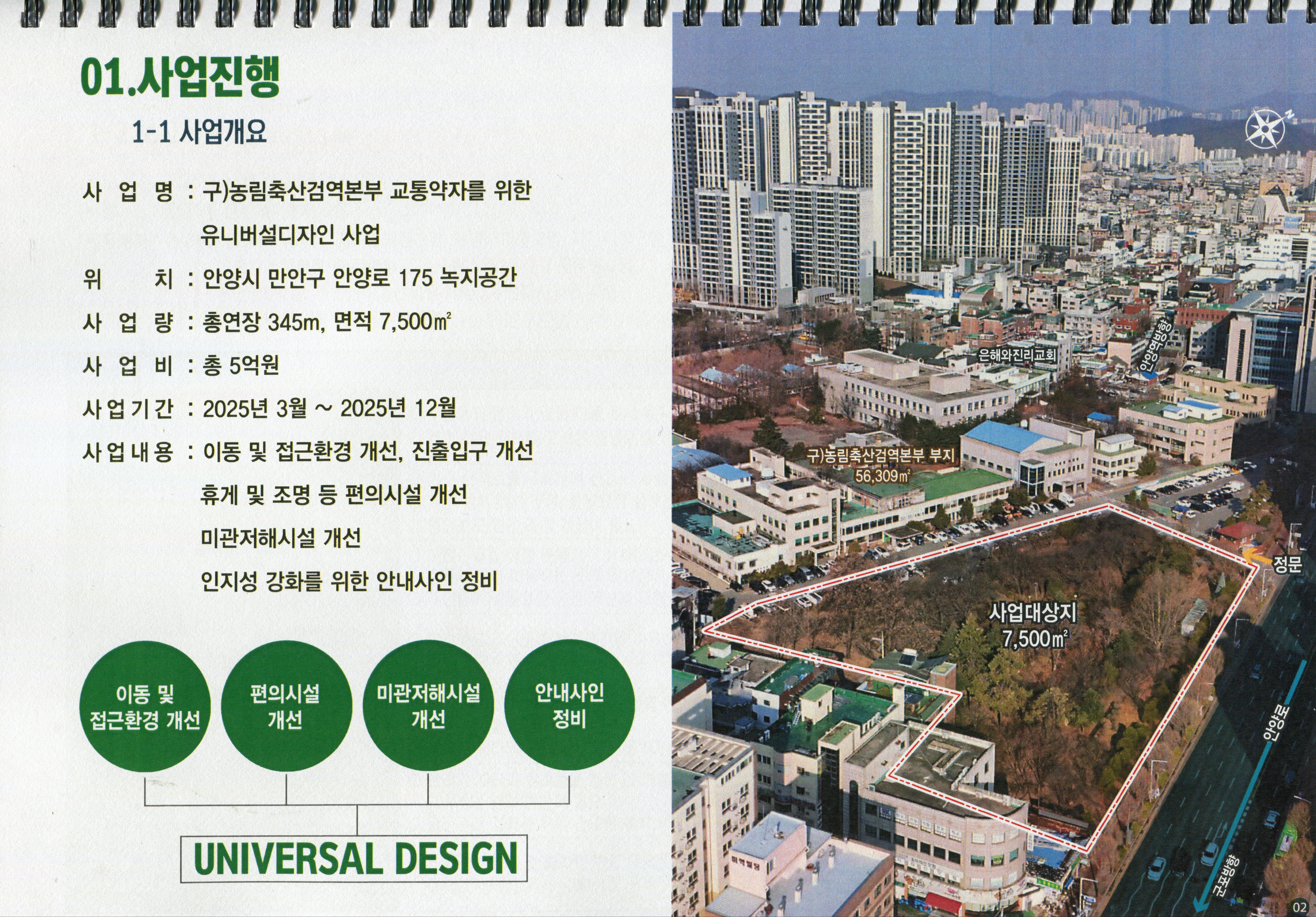 안양6동 옛 검역원의 유니버설디자인 사업은 경기도 공모사업에 선정되면서 확보한 도비 1억5,000만원을 포함한 총 5억원의 사업비를 투입해 옛 농림축산검역본부 부지 내 녹지공간(7,500㎡)을 장애인, 고령자, 영유아 동반자 등 모든 사람이 차별받지 않고 이용할 수 있도록 진ㆍ출입로와 편의시설을 개선하고, 생태 산책로 등을 조성하는 사업이다.