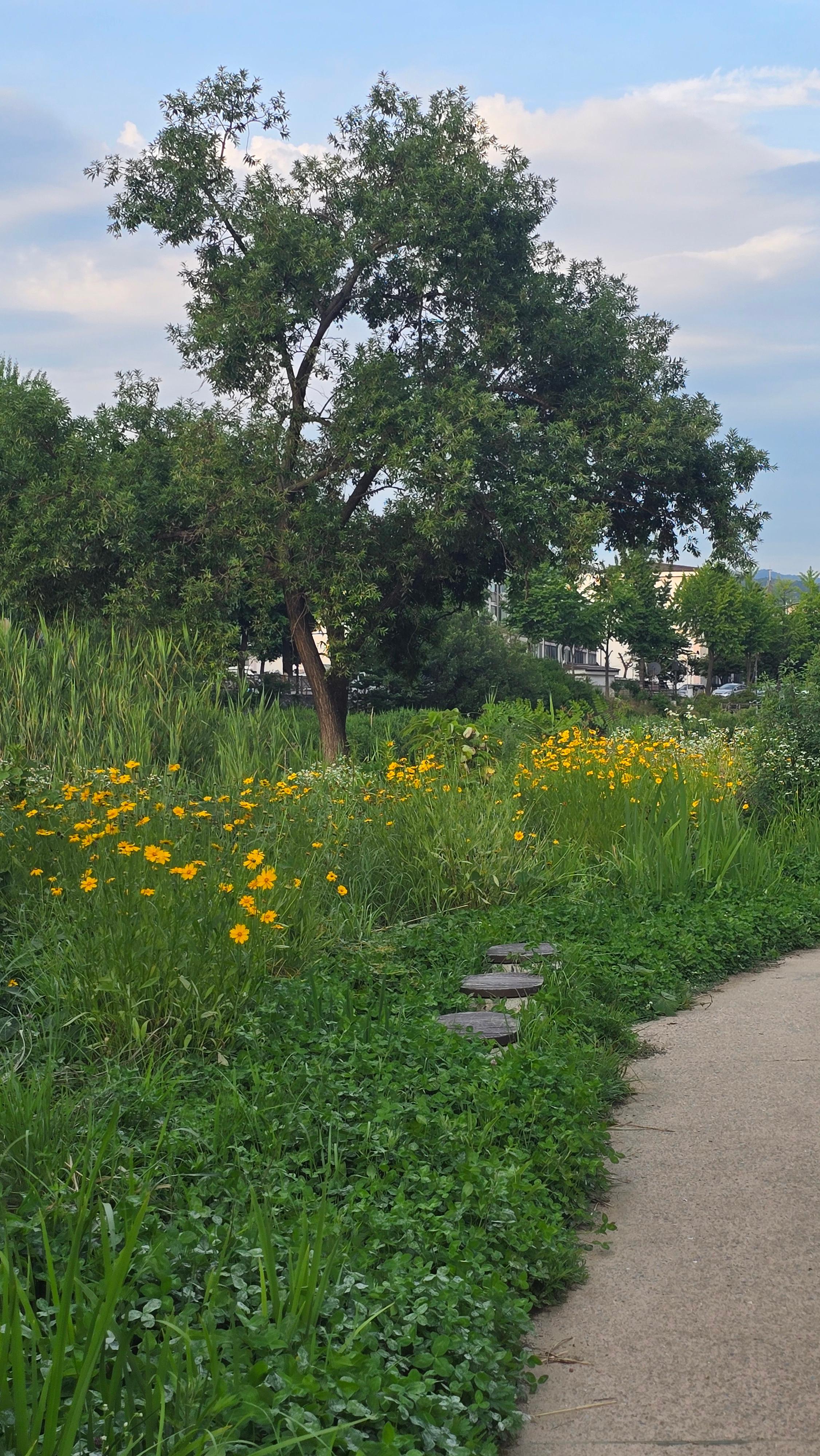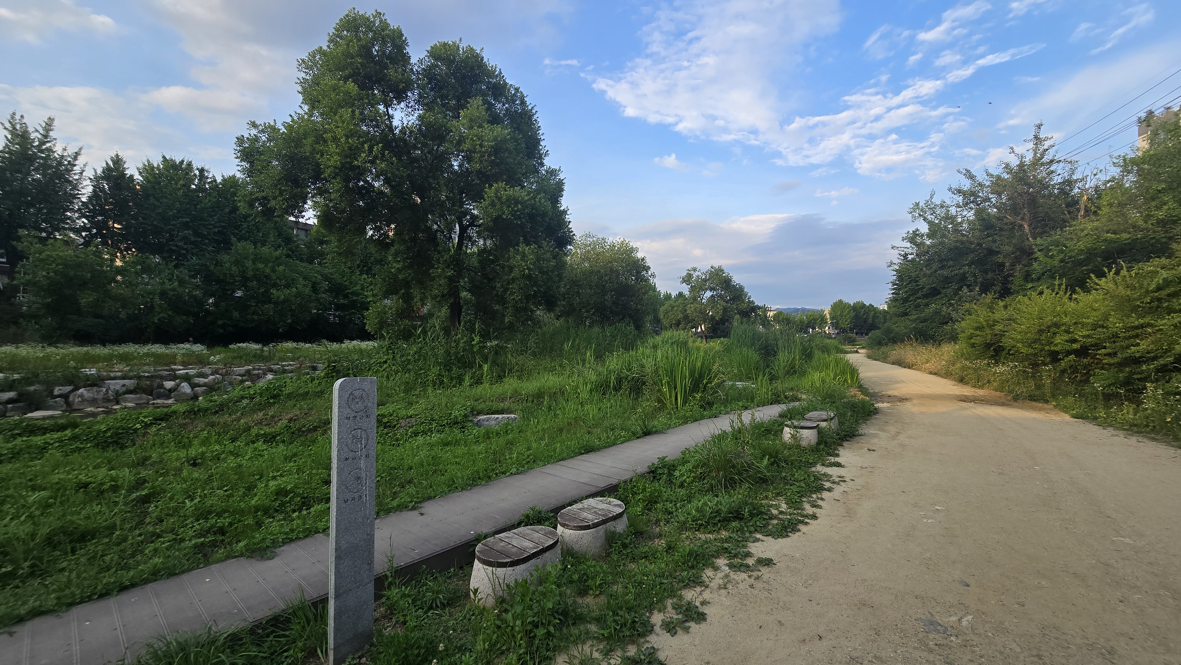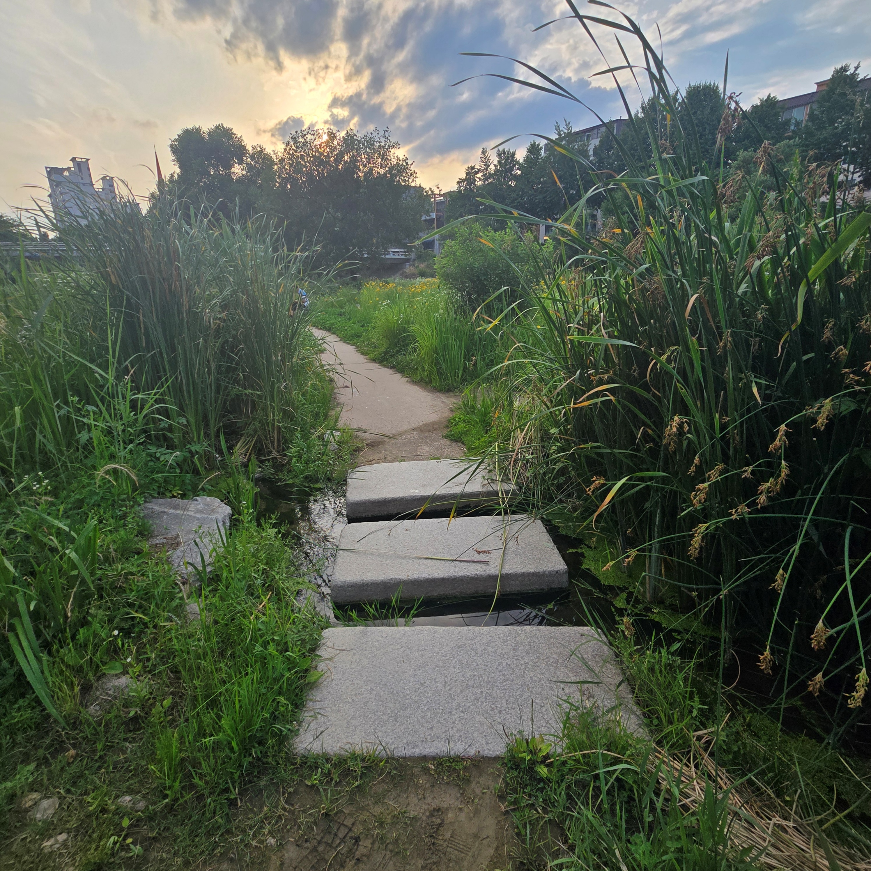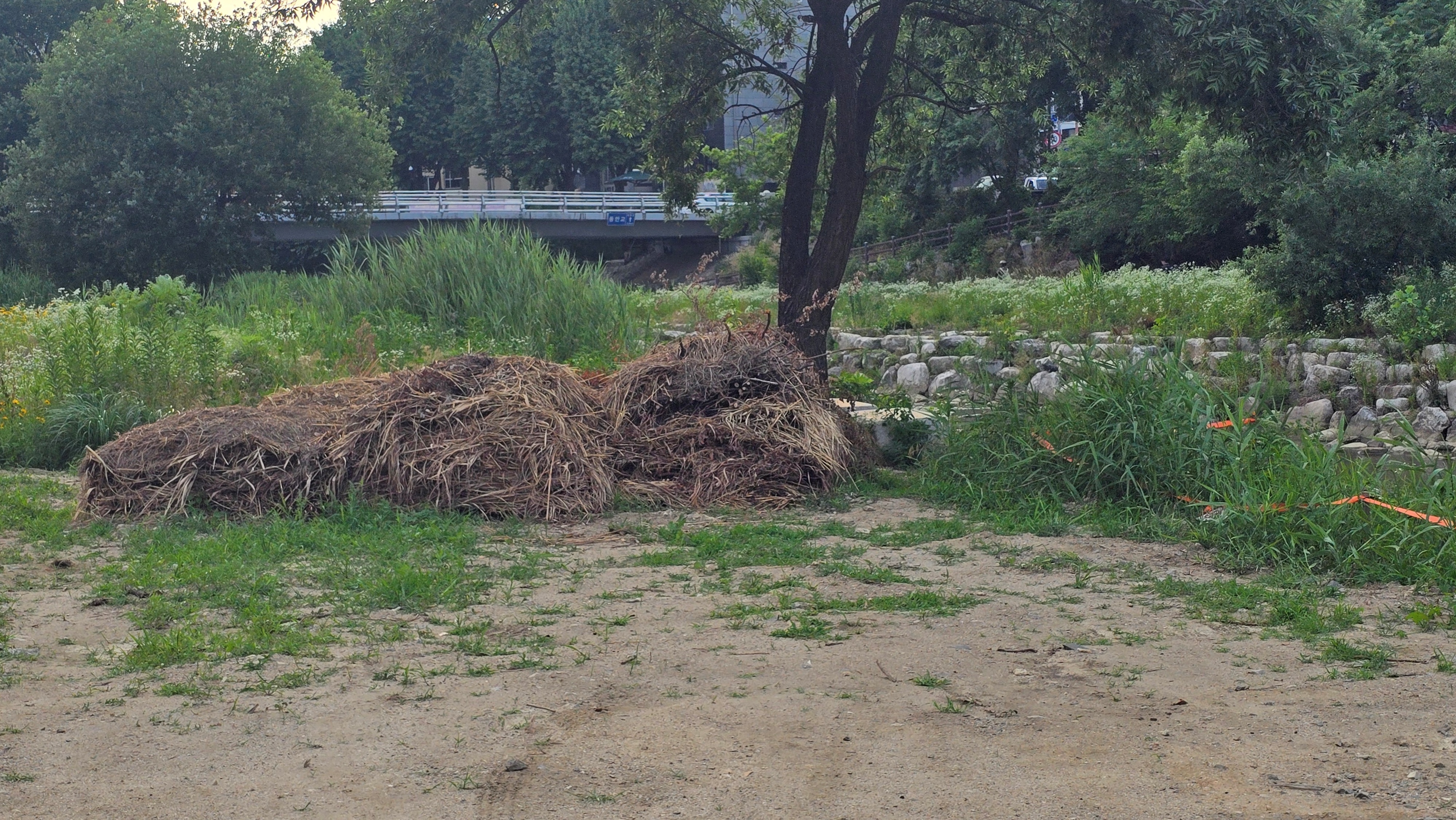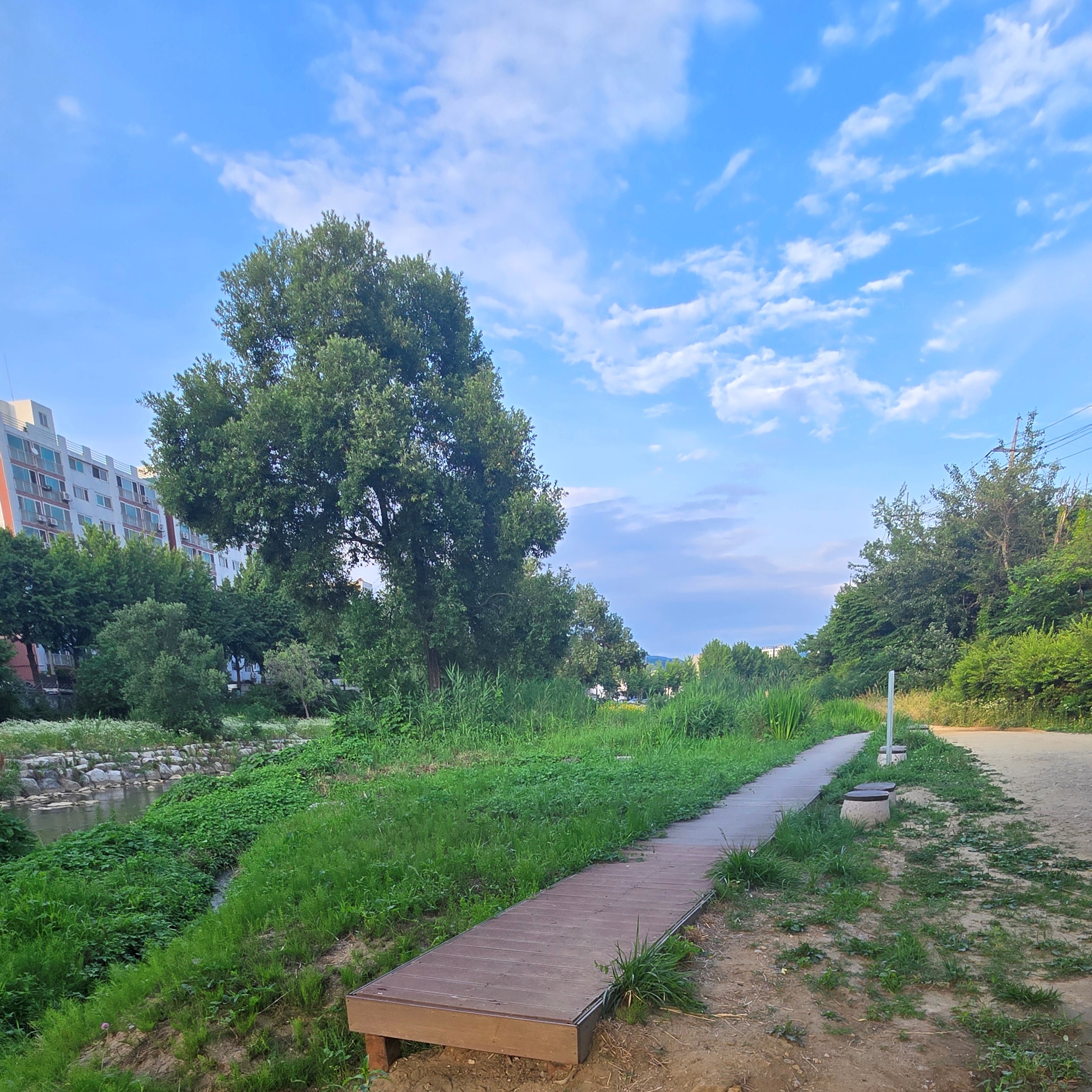 2026.06.19/ #도시기록 #안양 #학의천 #동안습지 #쉼터/ 안양 학의천 동안교옆 동안습지. 나무 그늘이 없어 쉼터로는 취약하다.