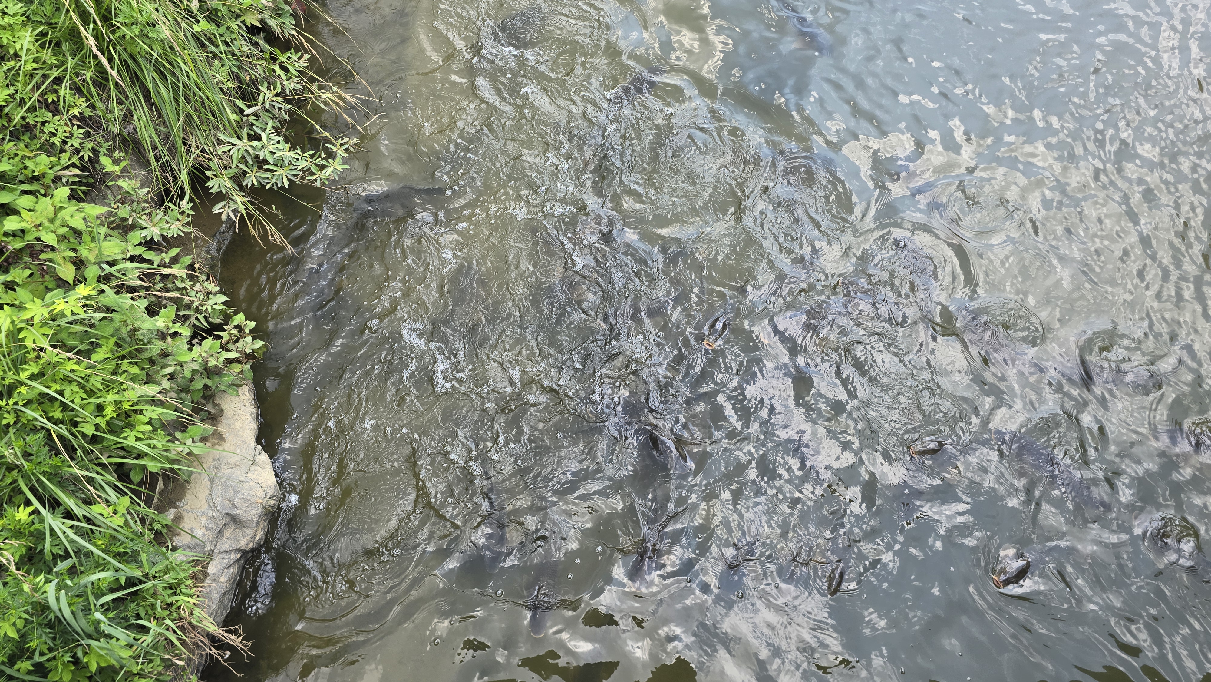 2025.06.23/ #도시기록 #안양 #생태모니터링 #학의천/ 안양 학의천 대한교와 동안교 중간에 있는 평촌더샵 세월교 밑에는 어른 팔뚝만한 크기의 커다란 잉어들이 노니는 놀이터다. 이곳에는 붉은 무뉘가 멋진 비단잉어와 또다른 비단잉어 두마리도 함께 살았는데 2024년 여름 이후 어디론가 사라진후 아직까지 보이지 않는다. 어디로 갔을까.