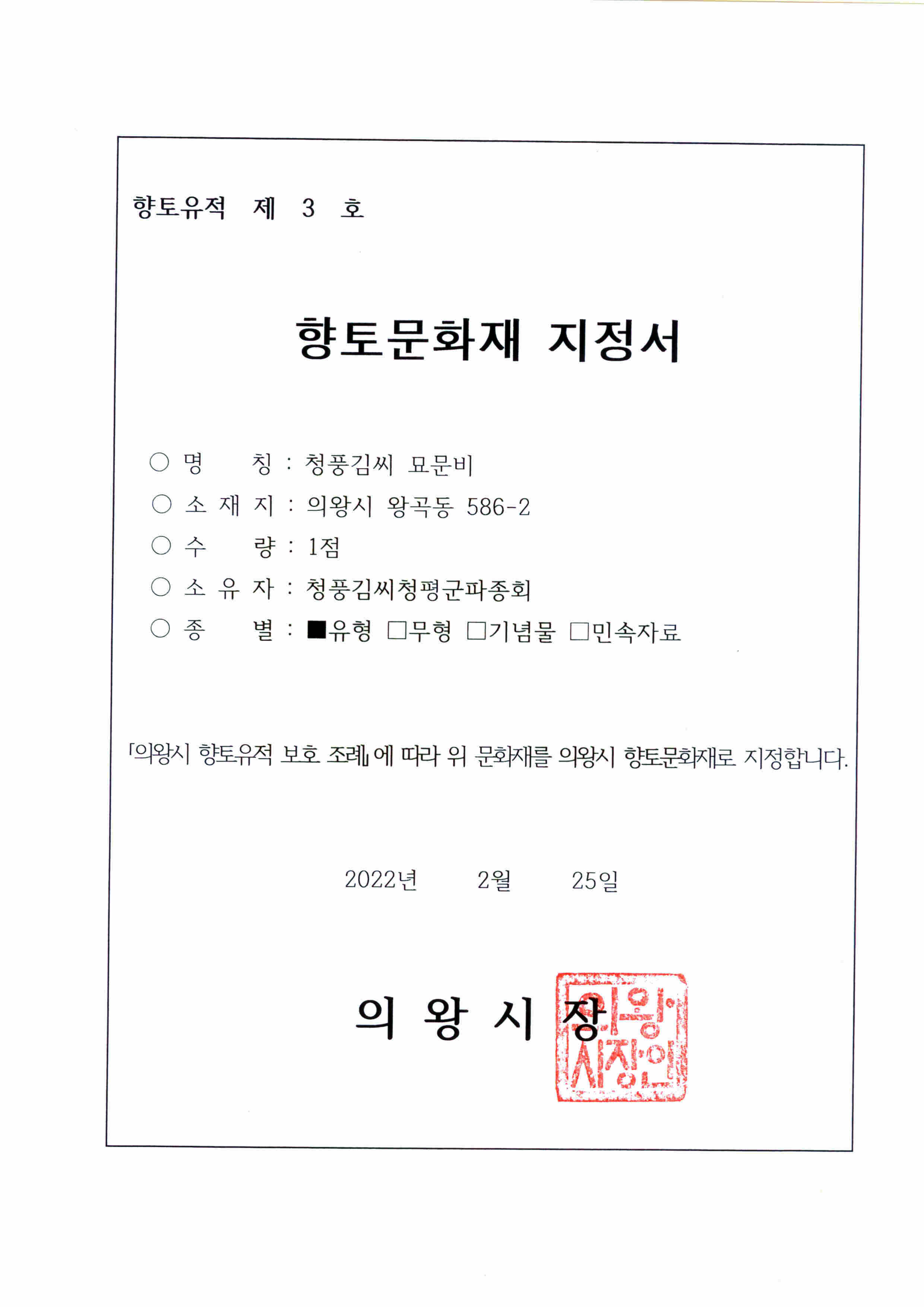 의왕 왕곡동 입구에 있던 청풍김씨 묘석으로 청품 김씨는 이 곳에서 4대에 걸처 6명의 정승, 2명의 대제학을 배출하고, 삼대정승, 부자영상이란 희대의 명문거족으로서, 선영의 묘문비를 노방에 세워, 삼남도백을 위시하여 대소관원들이 부임인사나, 노재상 문후와 묘소참배 때에 노변 하마석에서 필히 하마하고, 도보로 마을 안으로 진입하게 하는 표석이기도 하다.