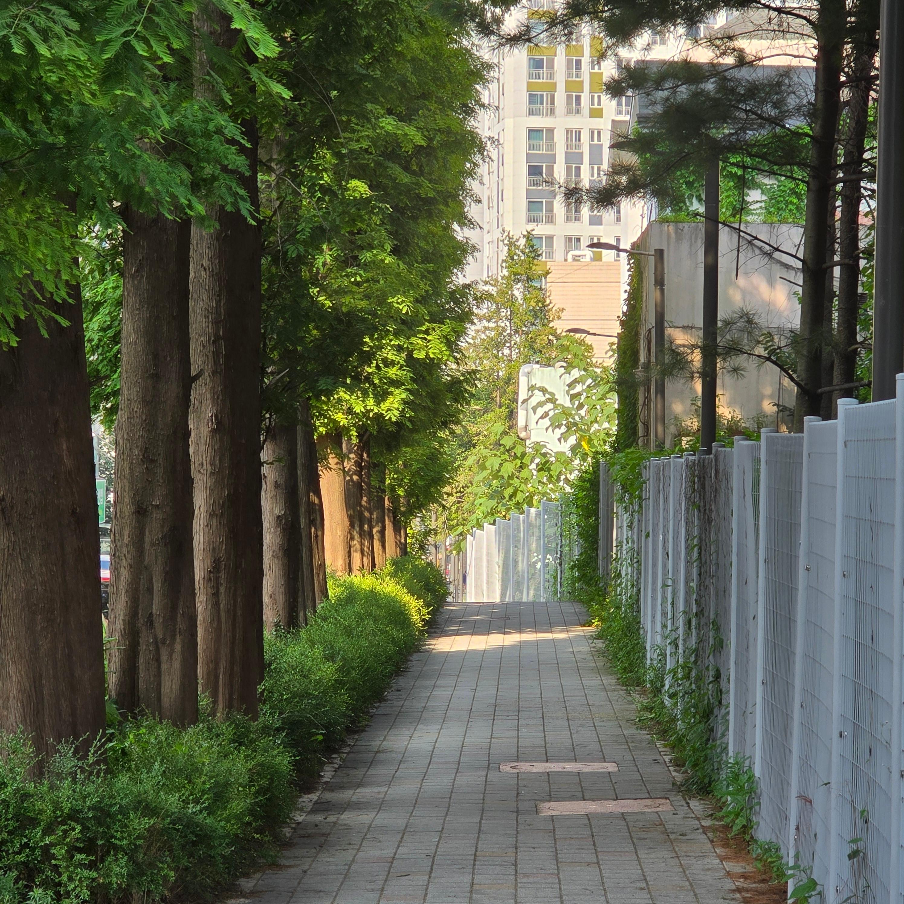 2025.07.24/ #도시기록#안양#안양6동#소곡로#통학로/ 안양6동 소곡로의 옛검역원 북쪽 담장을 부지 안쪽으로 셋백시켜 조성한 보행로(인도). 안양세무서 끝자락에서 중앙로(은혜와진리교회 남쪽사거리)와 연결되는 이 도로는 소곡천을 복개하여 만든 길로 길폭이 좁아 인도가 없었다. 안양시는 검역원 담장을 허물고 부지 안쪽으로 보행로를 만들었다. 담장을 허문 일부 구간에는 기존에 심어져있던 메타쉐콰이어 가로수가 자라고 있어 나무숲 그늘이 생겨 땡볕 여름철 그늘 사이로 쾌적하게 다닐 수 있는 걷고싶은 그늘길이다.