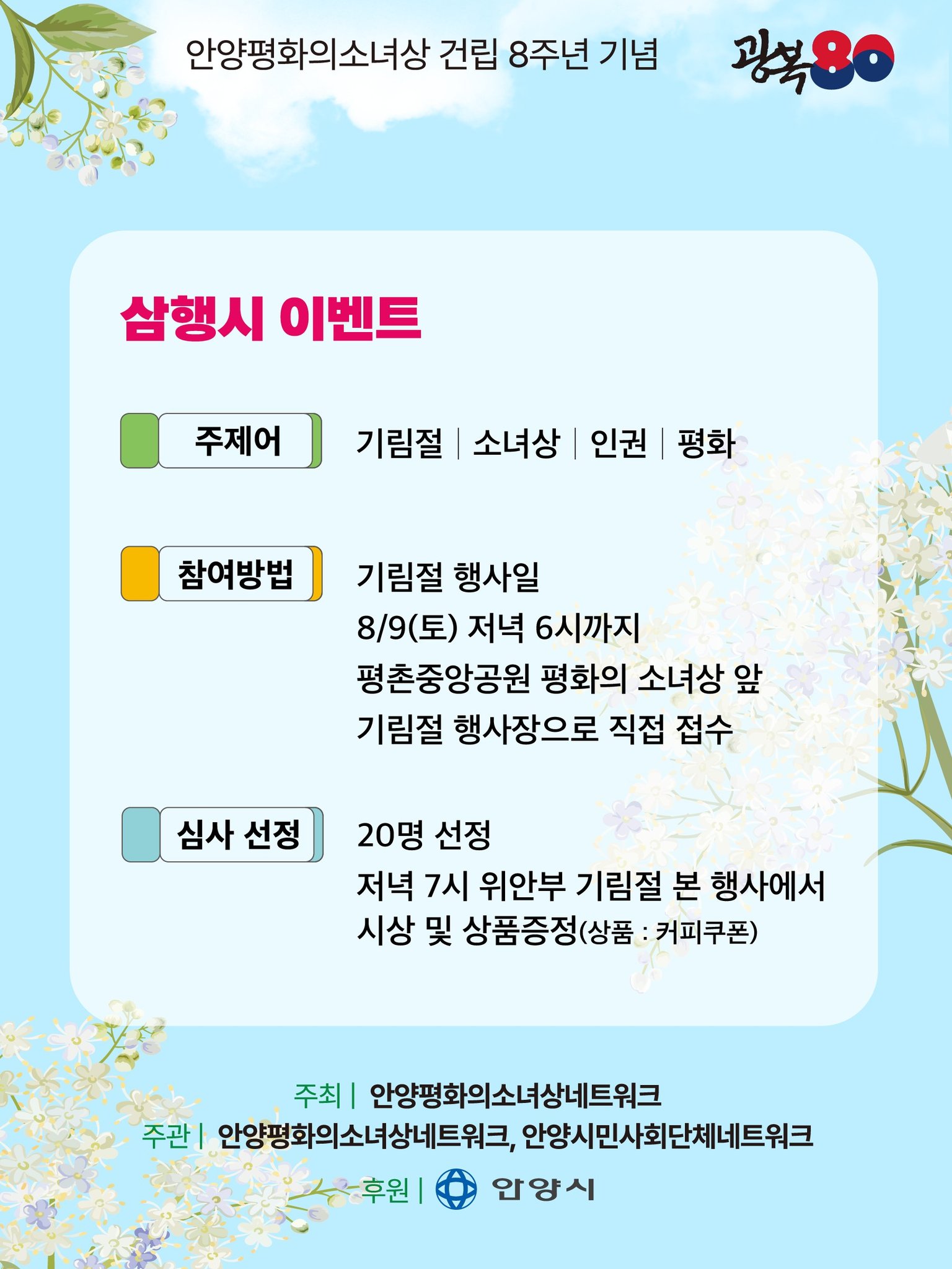 위안부 피해 할머니의 아픔을 기억하고, 평화와 인권의 중요성을 다함께 되새기기 위해 마련된 이날 기념행사는 안양평화의소녀상네트워크(상임대표 국상표)가 주최하고 안양평화의소녀상네트워크와 안양시민사회단체네트워크가 주관하고 안양시가 후원하는가운데 이날 기념식에서는 ‘기림절, 소녀상, 인권, 평화’를 주제로 삼행시 작품 공모전에 대한 시상식과 작은 평화 음악회가 열린다.