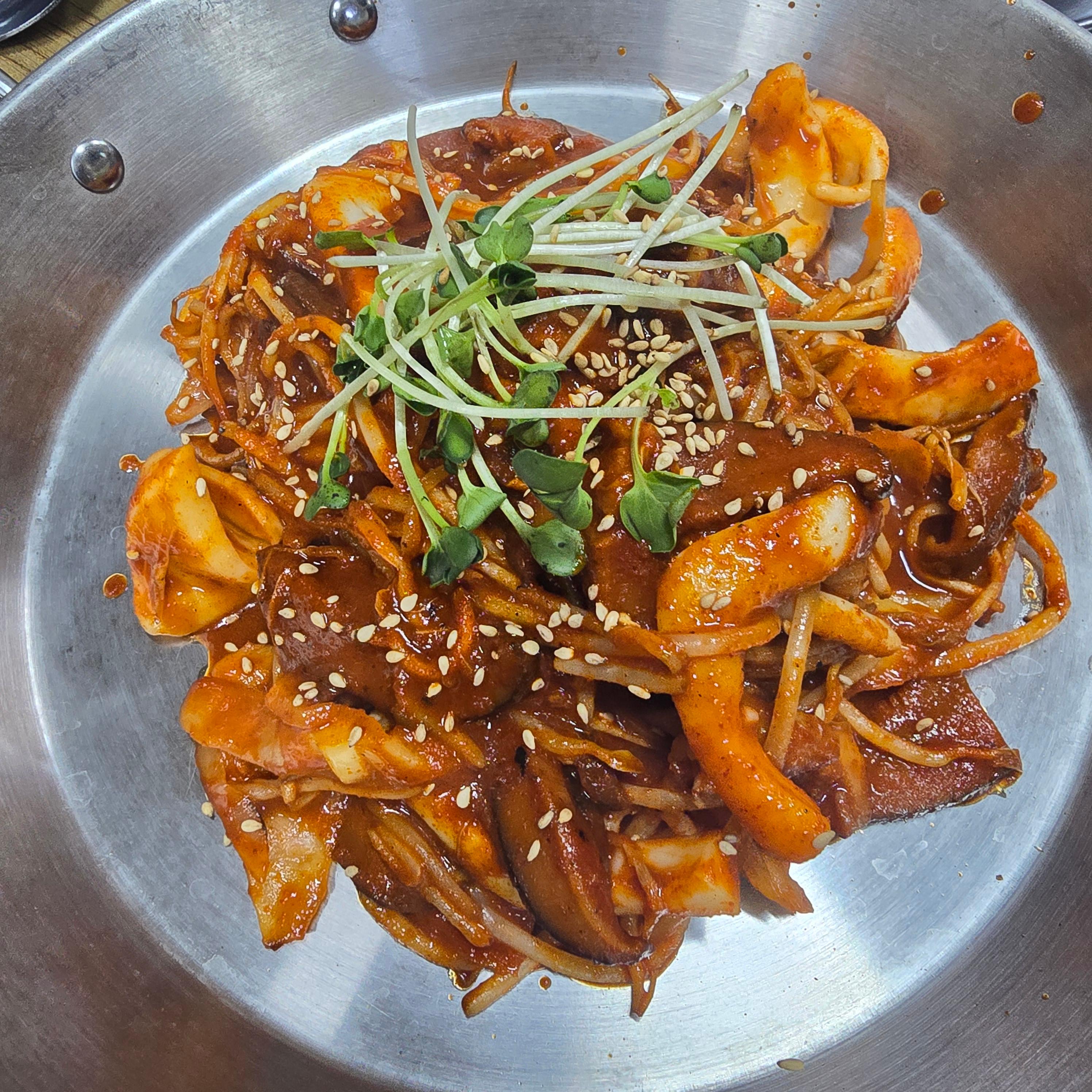 두 번째 음식은 세 번째로 나온것은 철판갑오징어볶음 구운김이랑 날치알과 함께 싸먹으라고 추천해주셨다