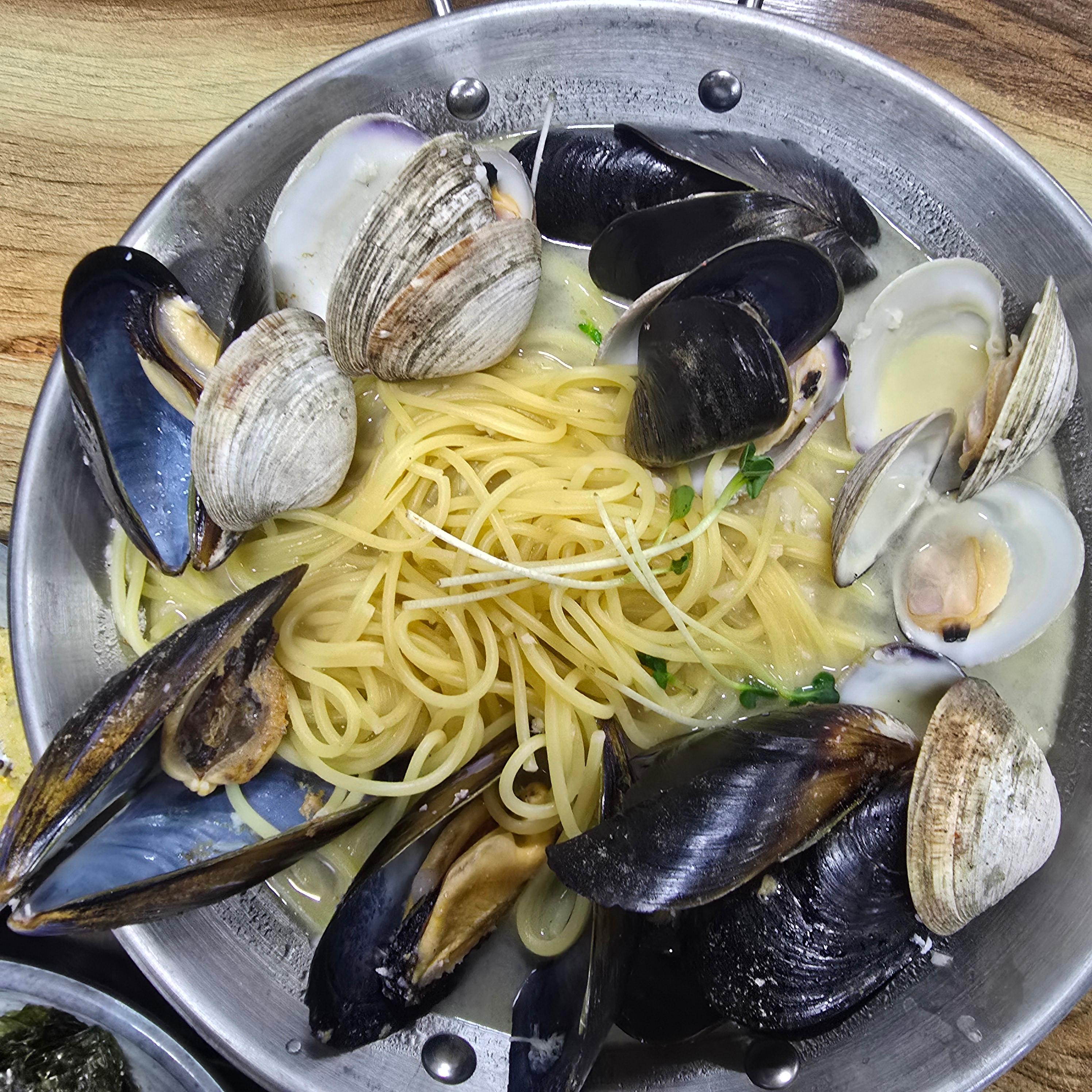 세번재 음식은 조개 술찜. 비주얼이 그저 그랬다. 스파게티 면이 덜 삶아졌고, 해감이 제대로 안 된 조개도 몇 개 있었으나, 국물 맛은 특이하게도 정말 깊고 진하다. 국몰의 양이 적은 것이 아쉬웠다.