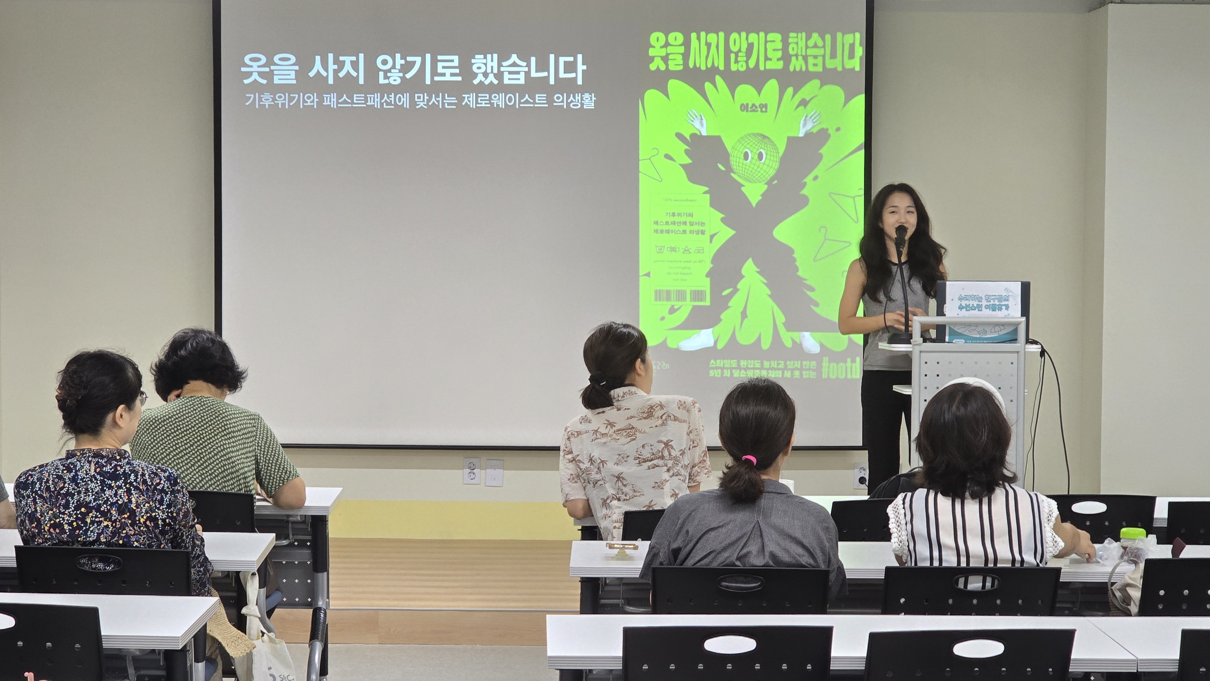 먼저 이날 오전에는 『옷을 사지 않기로 했습니다』의 저자 이소연 작가의 강연이 진행되었다. 이소연 작가는 7년째 옷을 사고 있지 않는 환경운동가다. 패스트패션, 그린워싱, 빈티지 소비 등 기후위기 시대 ‘지속가능한 의생활’에 대한 깊이 있는 이야기를 나누며 큰 공감을 얻었다.