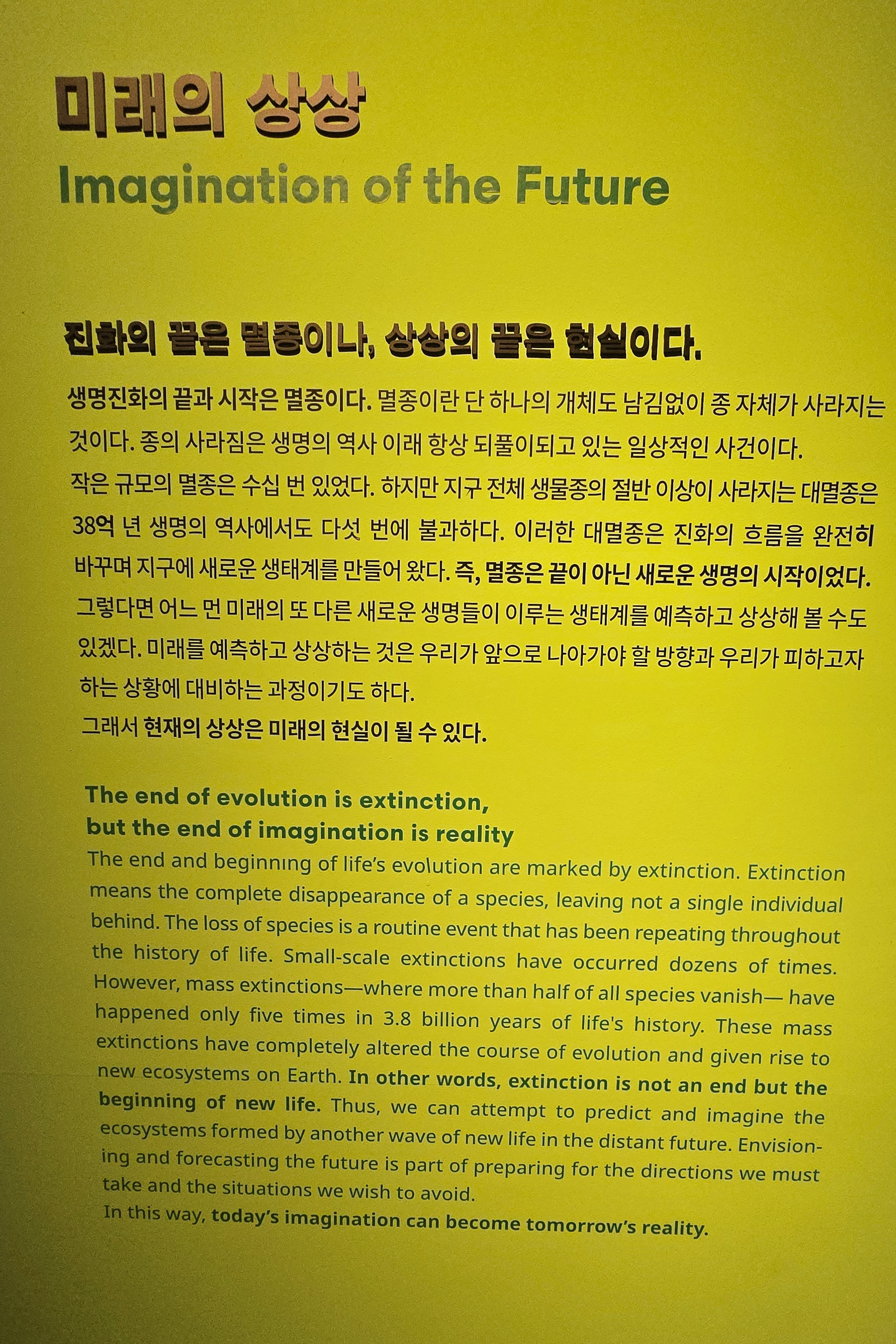 안양지역뉴스/정보 [20250816]국립과천과학관 기획전 <미래동물: 대멸종 너머> 안양똑딱이 2025. 8. 16. 15:35 2025.08.13/ #국립과천과학관 #과천/ 볼거리, 배울거리 풍성한 공간. 다양한 기획전과 상설전 시가 진행중. 광복절 80주년 기념 무료개관 8.9~17일. 안양시지속가능발전협의회 생태전환분과 주관으로 미래동물: 대멸종 너머의 생명 전시 관람. 저작자표시 비영리 변경금지 (새창열림)