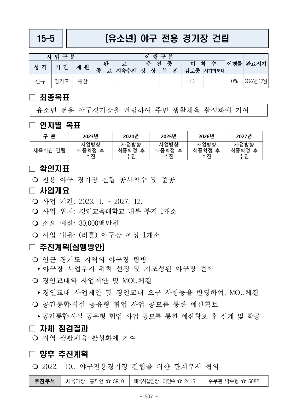 안양시가 만안구 삼막로 경인교육대학교 경기캠퍼스 유휴부지를 활용해 지역 주민을 위한 9천950㎡ 규모의 부지에 체육시설을 신규 조성한다. 이미 야구장과 풋살장을 조성하는 공사가 이달부터 시작됐으며, 연말 준공을 목표로 순항 중이다.