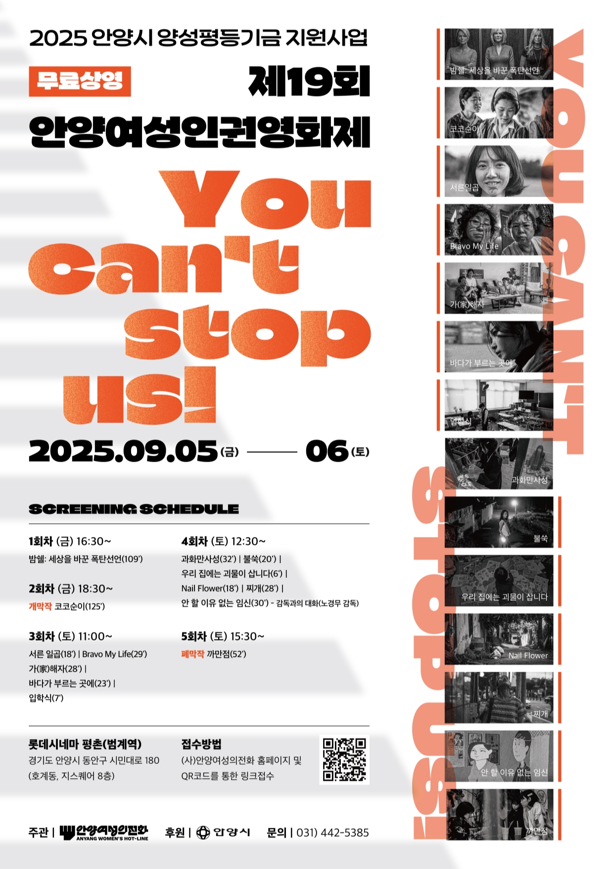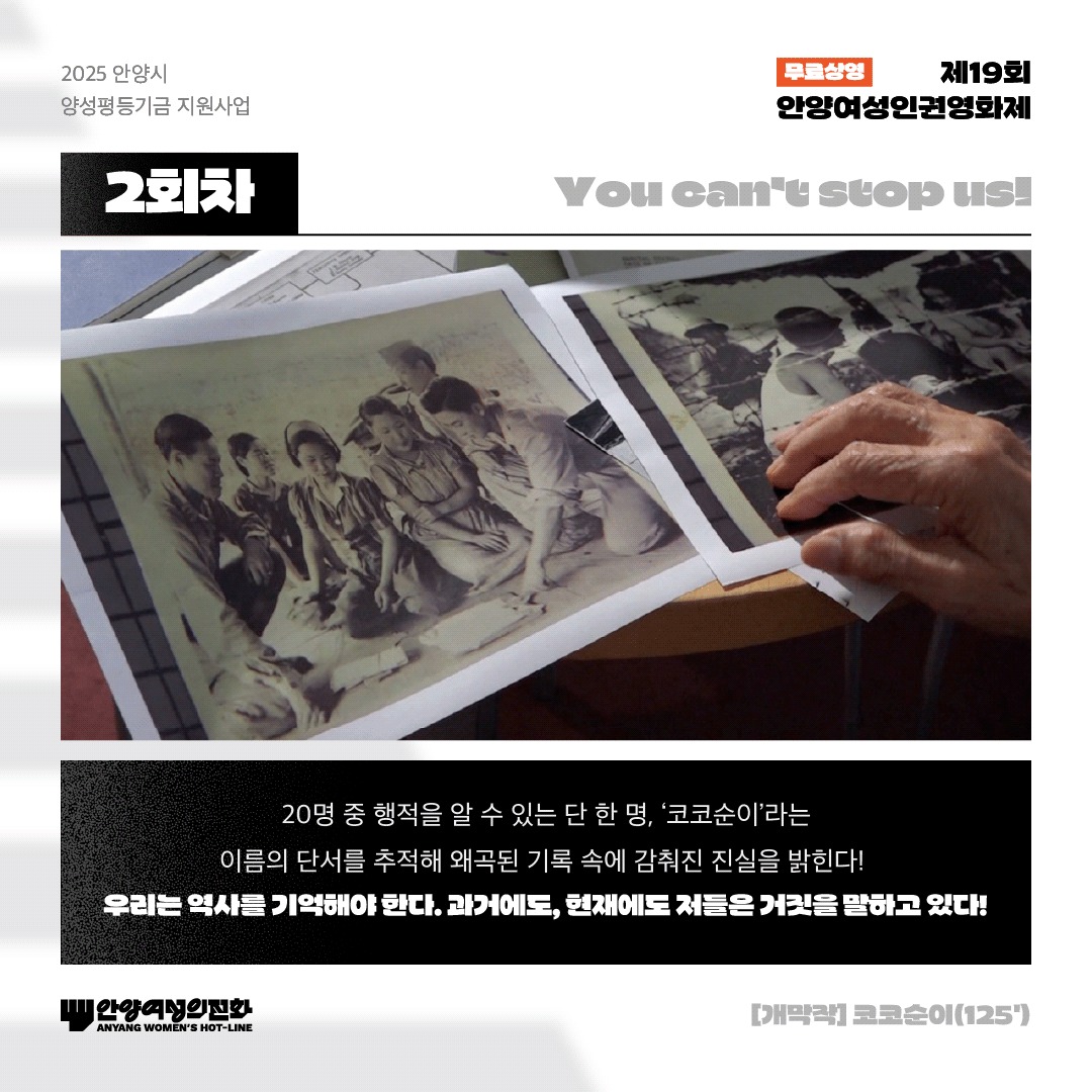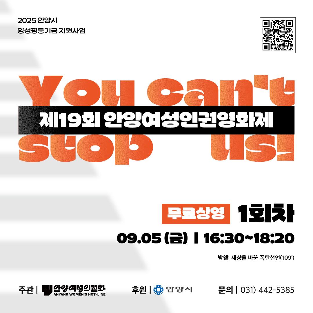 (사)안양여성의전화에서 주관·주최하고, 진행하는 이번 영화제는 제19회 안양여성인권영화제로 “You can’t stop us!”라는 슬로건 아래 폭력적인 사회문제의 피해자, 생존자에서 벗어나 더 나은 미래를 위해 나아가겠다는, 앞으로 나아가는 우리를 막을 수 없다는 의지가 돋보이는 영화제이다. 안양시가 양성평등기금으로 후원하며 총 14편의 장·단편 영화가 상영될 예정이다.