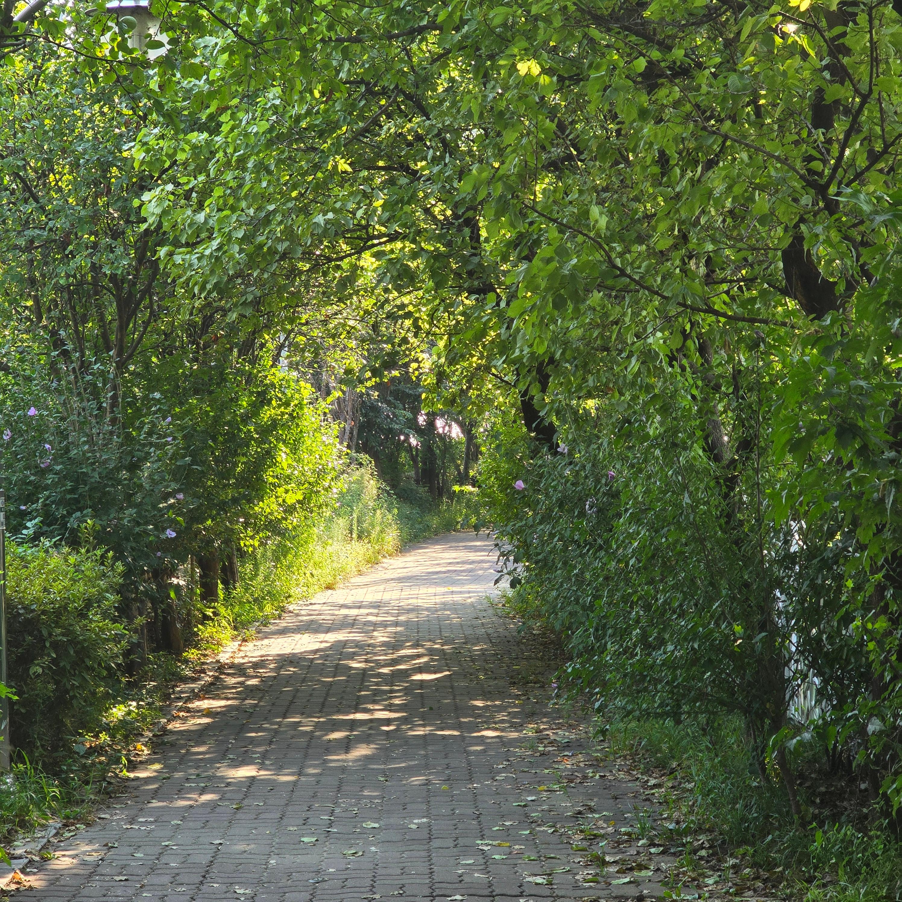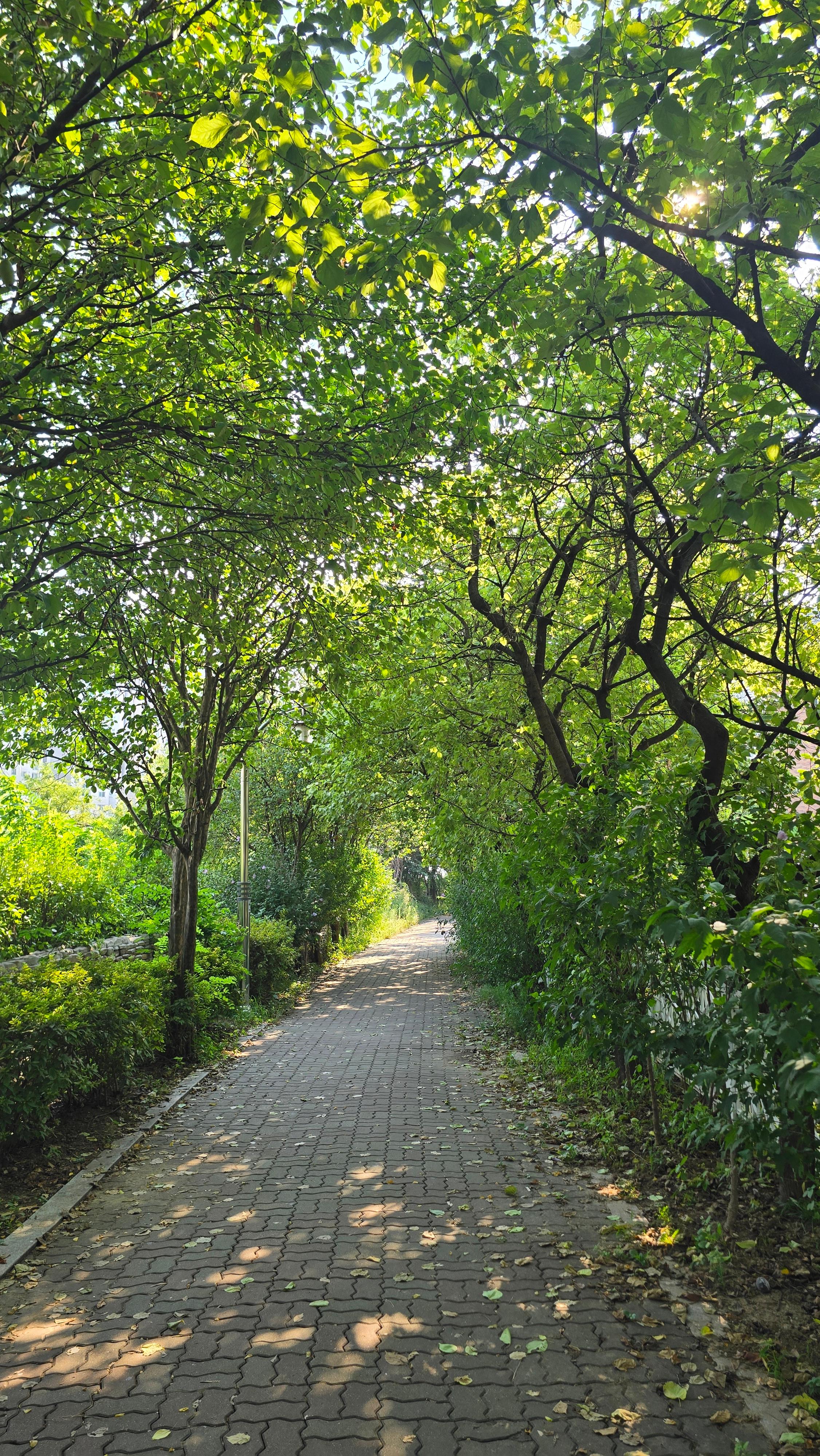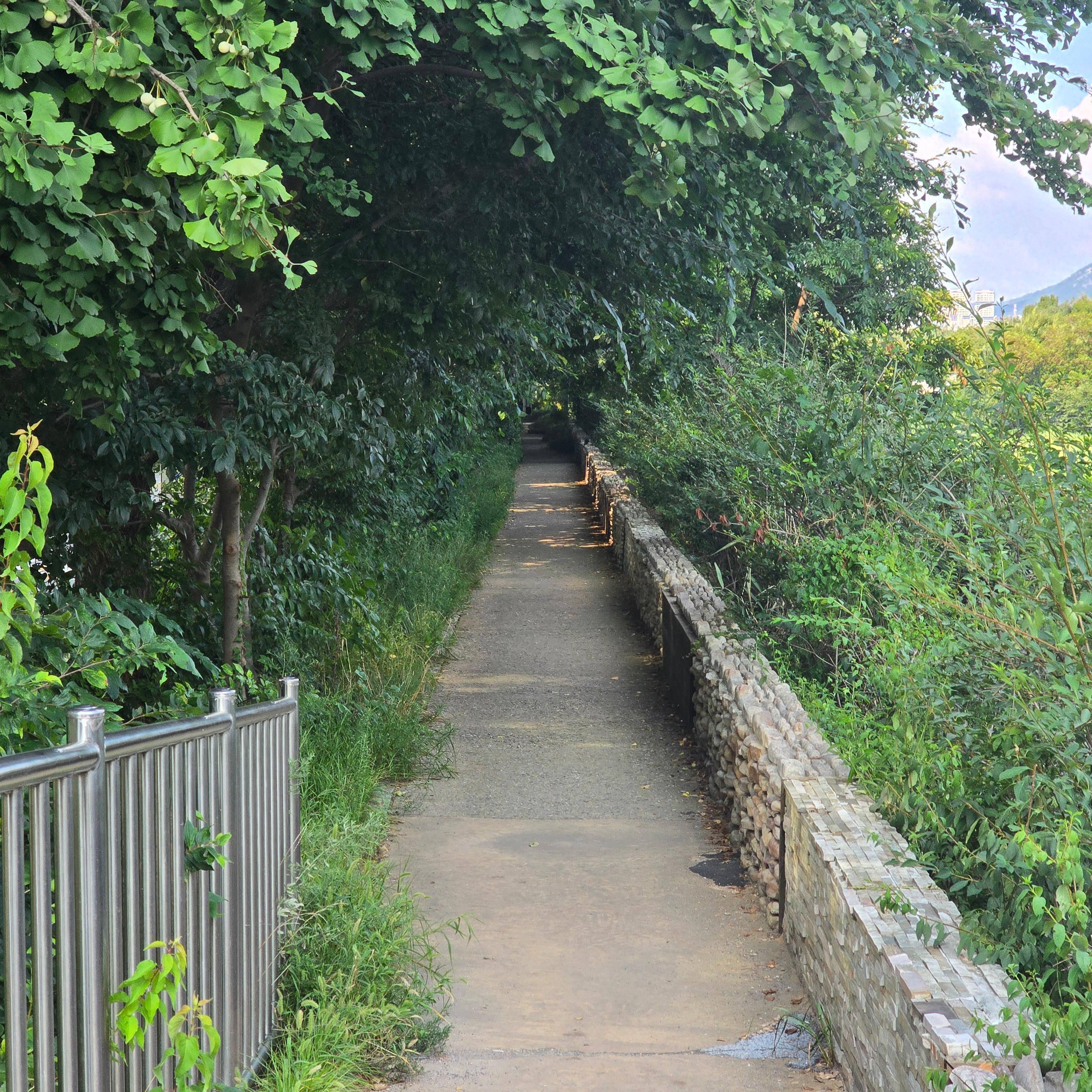 학의천 북쪽 제방위 숲길. 은행나무 가로수길. 그늘 터널길. 바람길