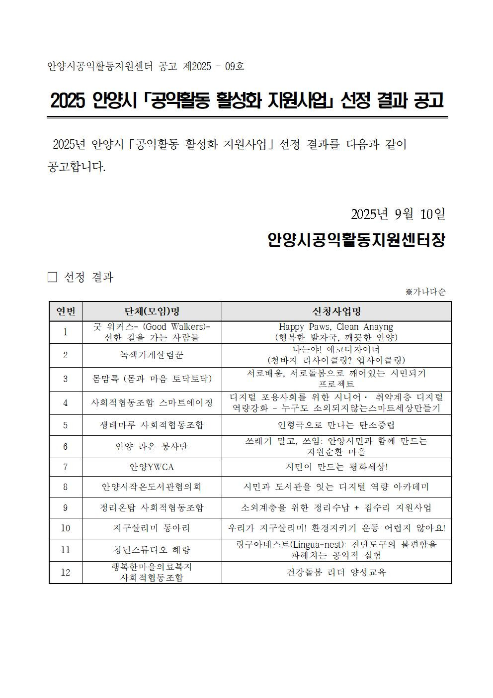 [20250916]안양시공익활동지원센터, 12개 단체와 공모 협약