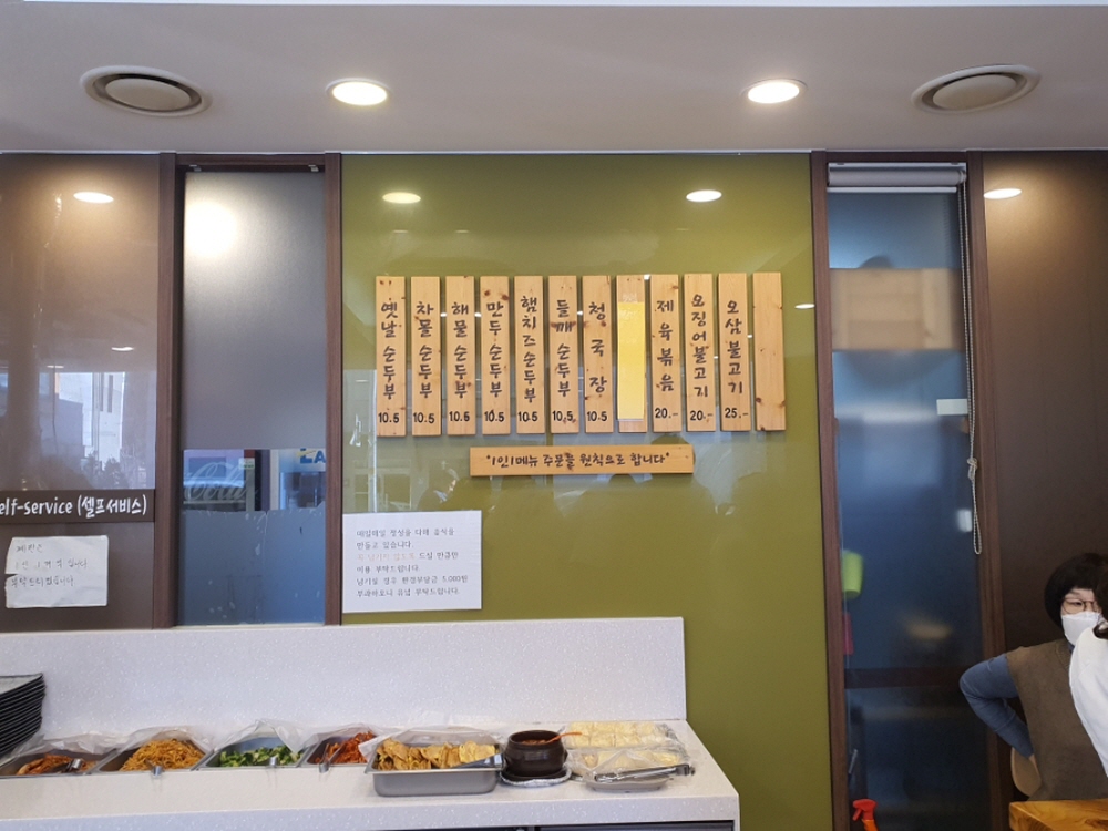 순두부 가격이 1인분에 10,500원으로 1끼 식사 금액으로는 비교적 높은편이나 개별적으로 한사람마다 솥밥이 나오고 셀프코너에 마련된 맛깔스런 찬들이 아주 다양하기에 이를 잘 활용할 줄 알면 가성비 있고 맛잇게 식사를 제대로 즐길 수 있을듯싶다.
