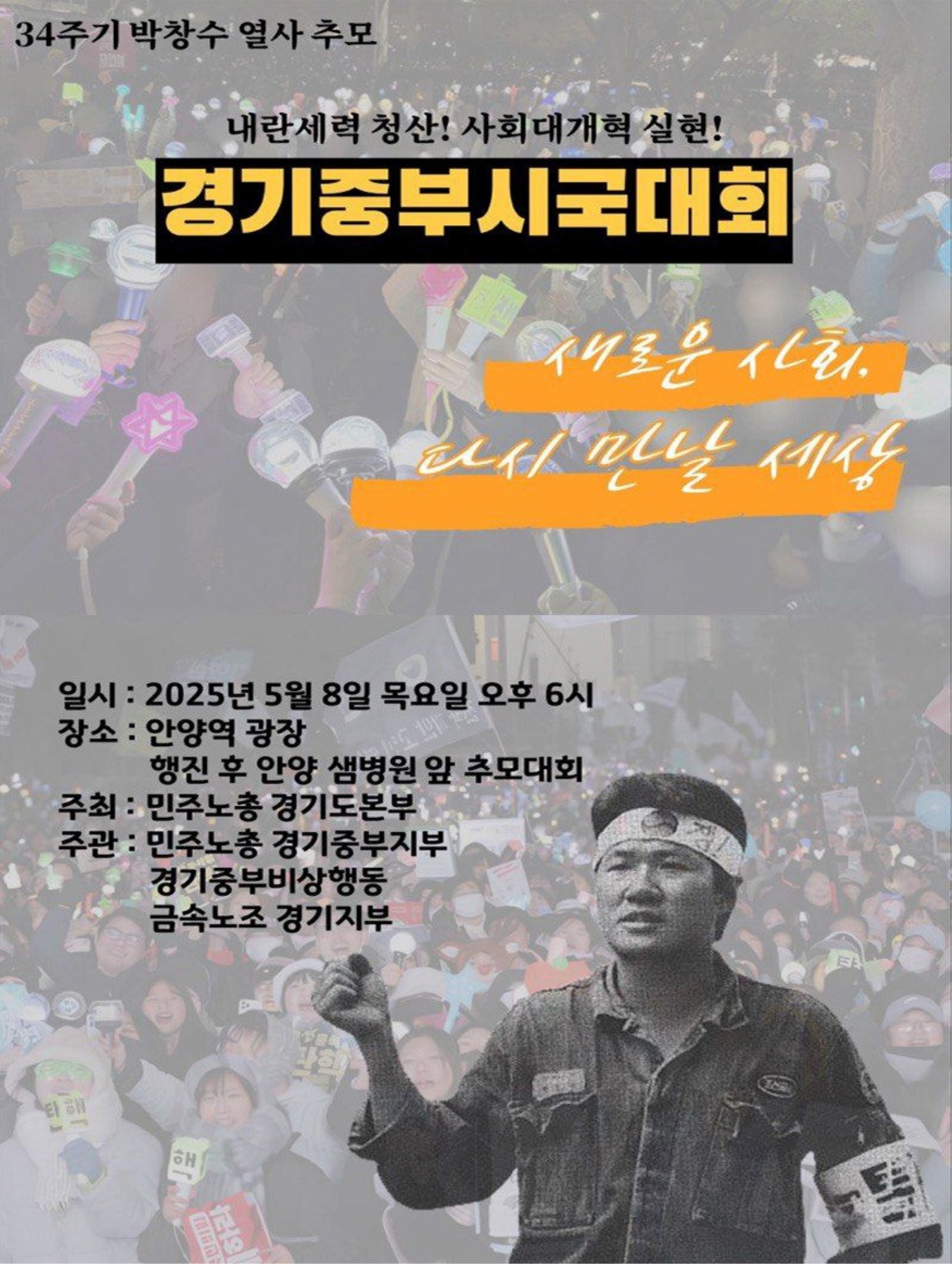 민주노총경기도본부, 민주노총경기중부지부, 금속노조경기지부, 경기중부비상행동이 안양에서 의문사로 숨진 박창수 노동열사의 34주기를 맞아 지난 5월 8일 오후 6시 안양역 광장에서 경기중부시국대회를 개최한후 의문사와 시신 탈취사건의 현장인 안양5동 샘병원까지 거리행진을한후 병원앞에서 ‘故 박창수 열사 추모행사'를 개최했다.