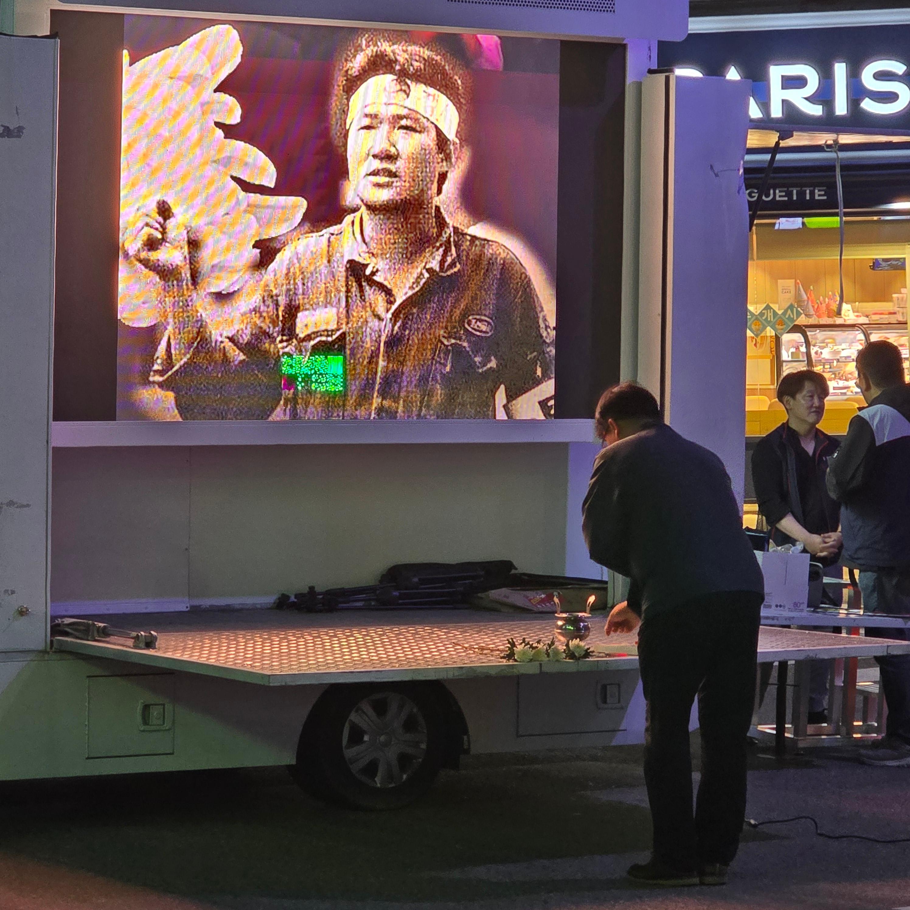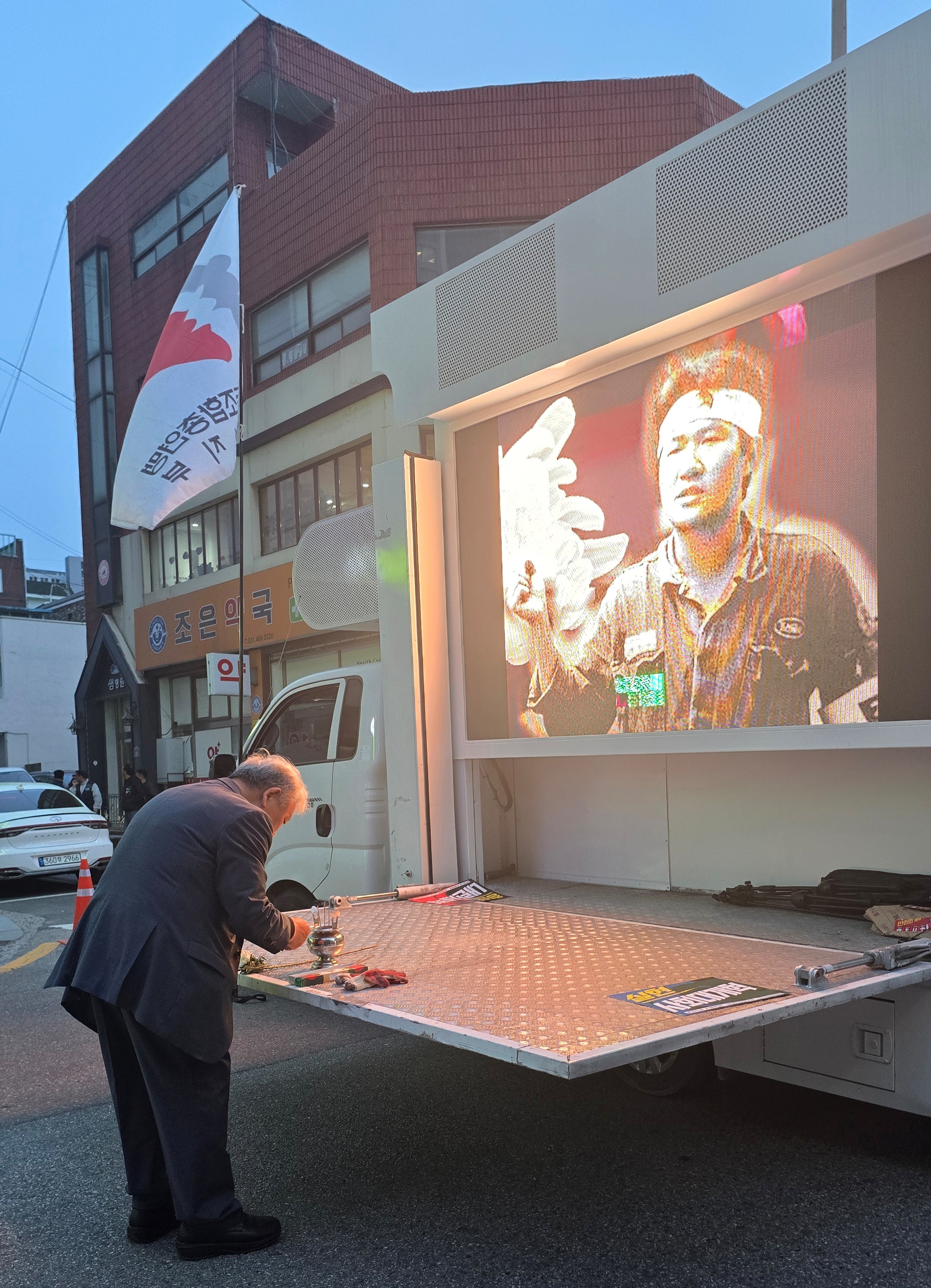 "재벌의 나라에 가난한 노동자로 태어나/인간답게 살기를 염원하던 사람/폭압의 세월에 목숨 바쳐 '전노협'을 지키고/죽어서도 투쟁의 깃발 높지 않은 노동자/살아오라 열사여!/천만 노동자의 가슴 속 노동해방의 불꽃으로."