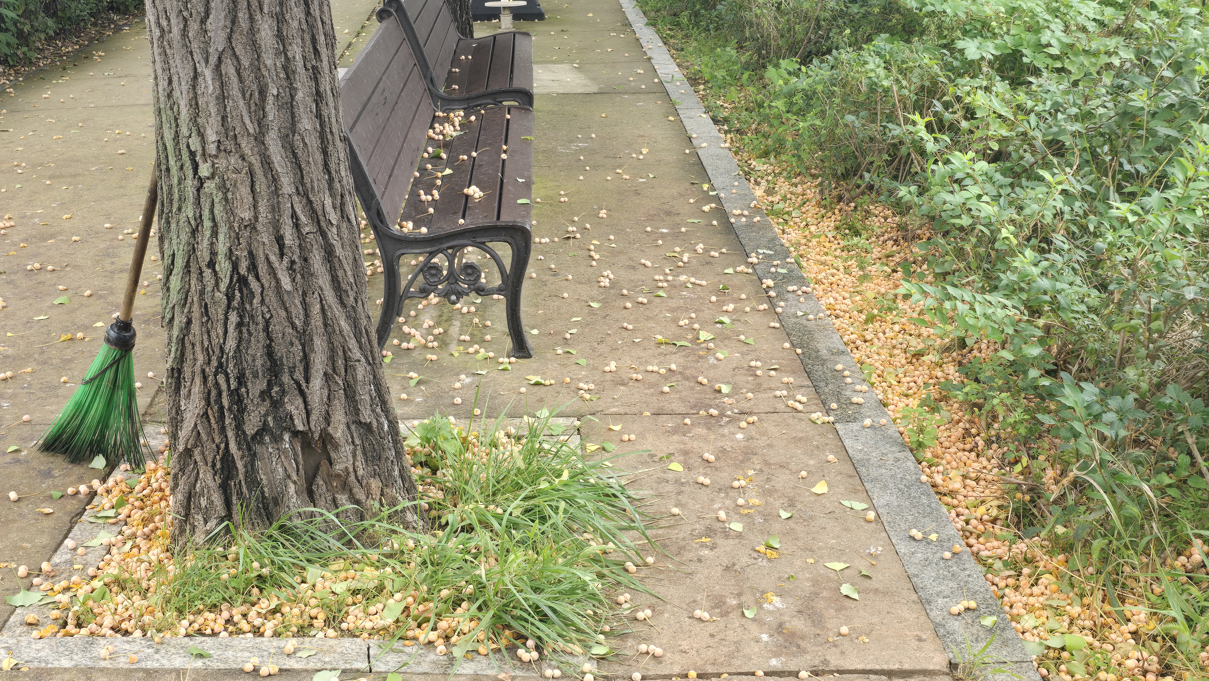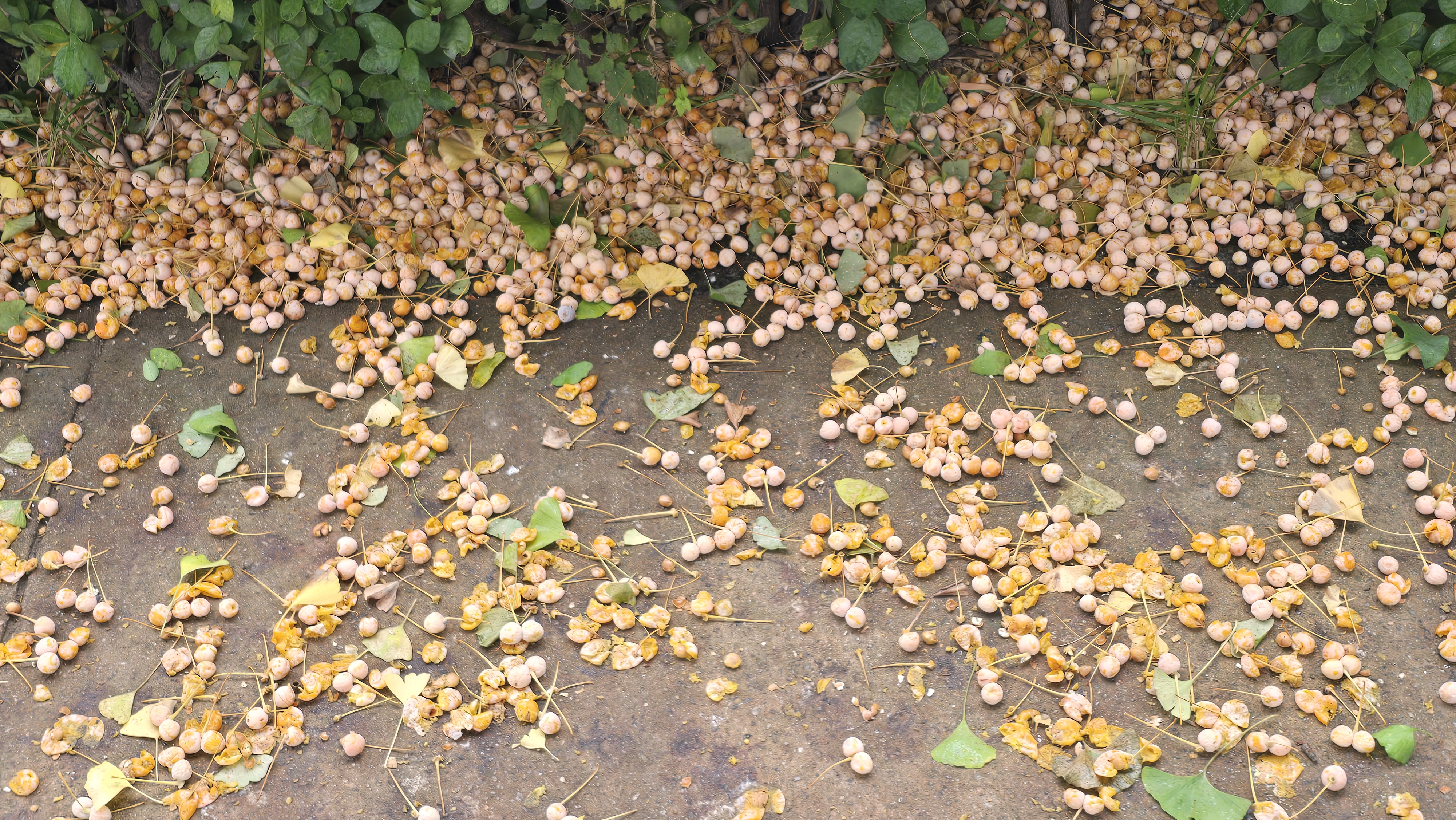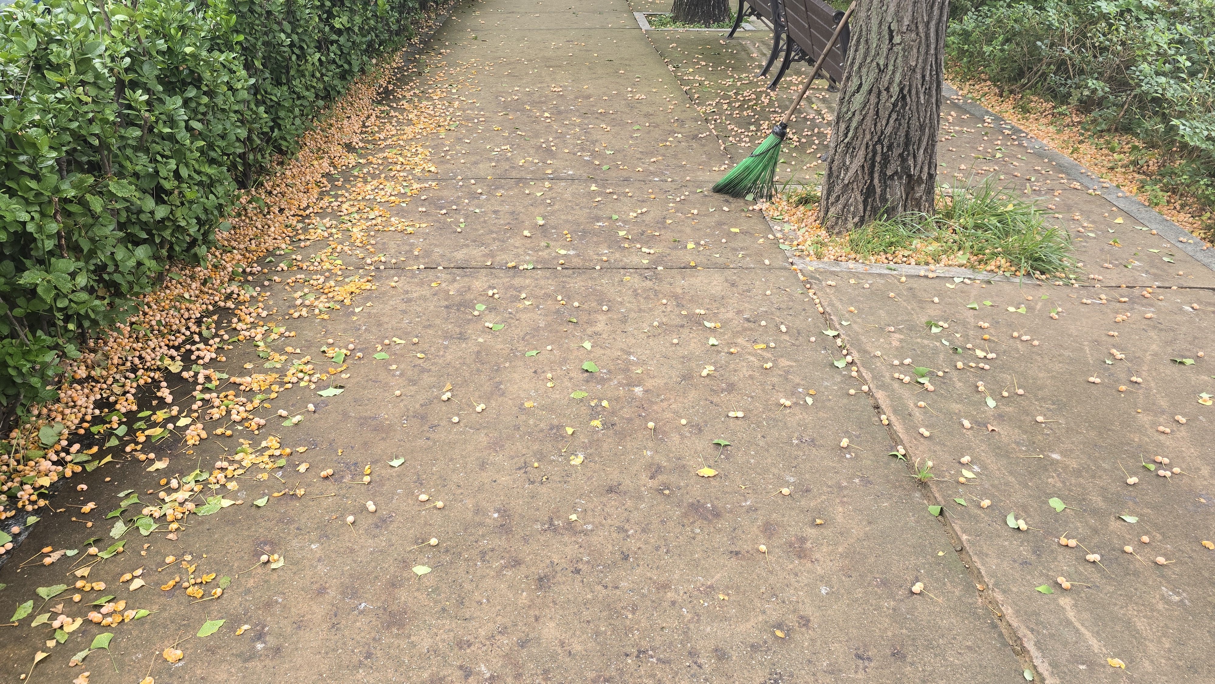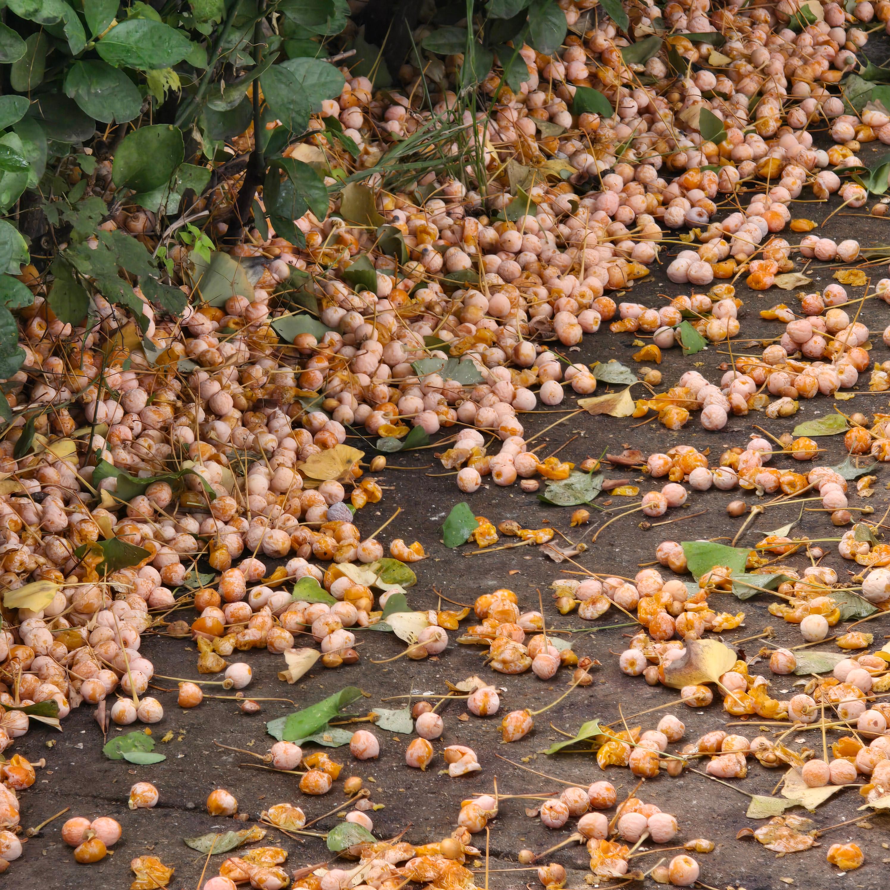 2025.10.05/ #도시기록 #안양 #은행/ 밟으면 터지고 신발에 고약한 냄새를 묻히고 다녀야 하기에 사람들이 마치 위험한 지뢰를 피하듯 기피하는 은행열매들. 안양 학의천 북단 뚝방길에 지천으로 깔렸다. 예년보다 더 많아진듯 싶다.