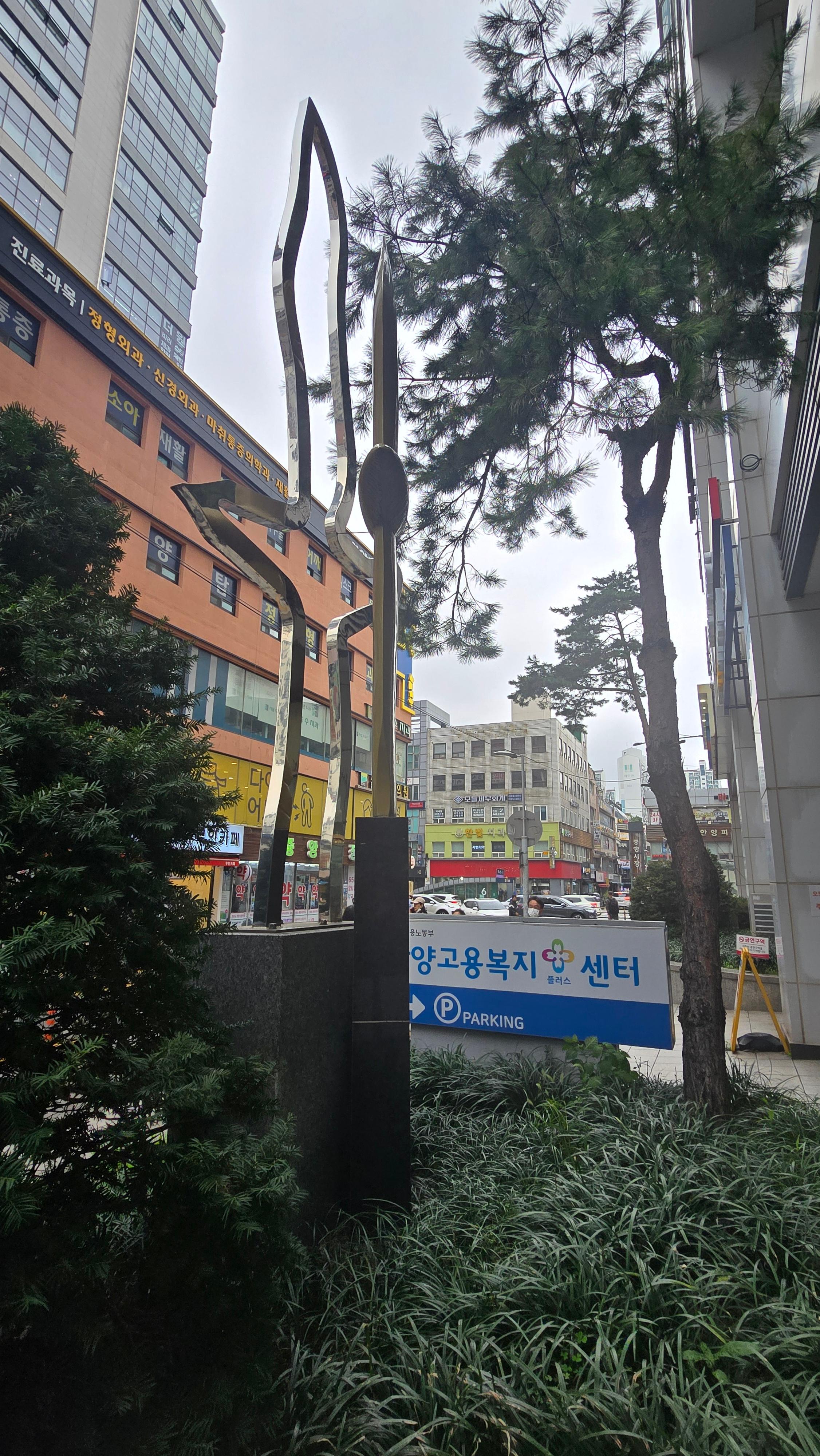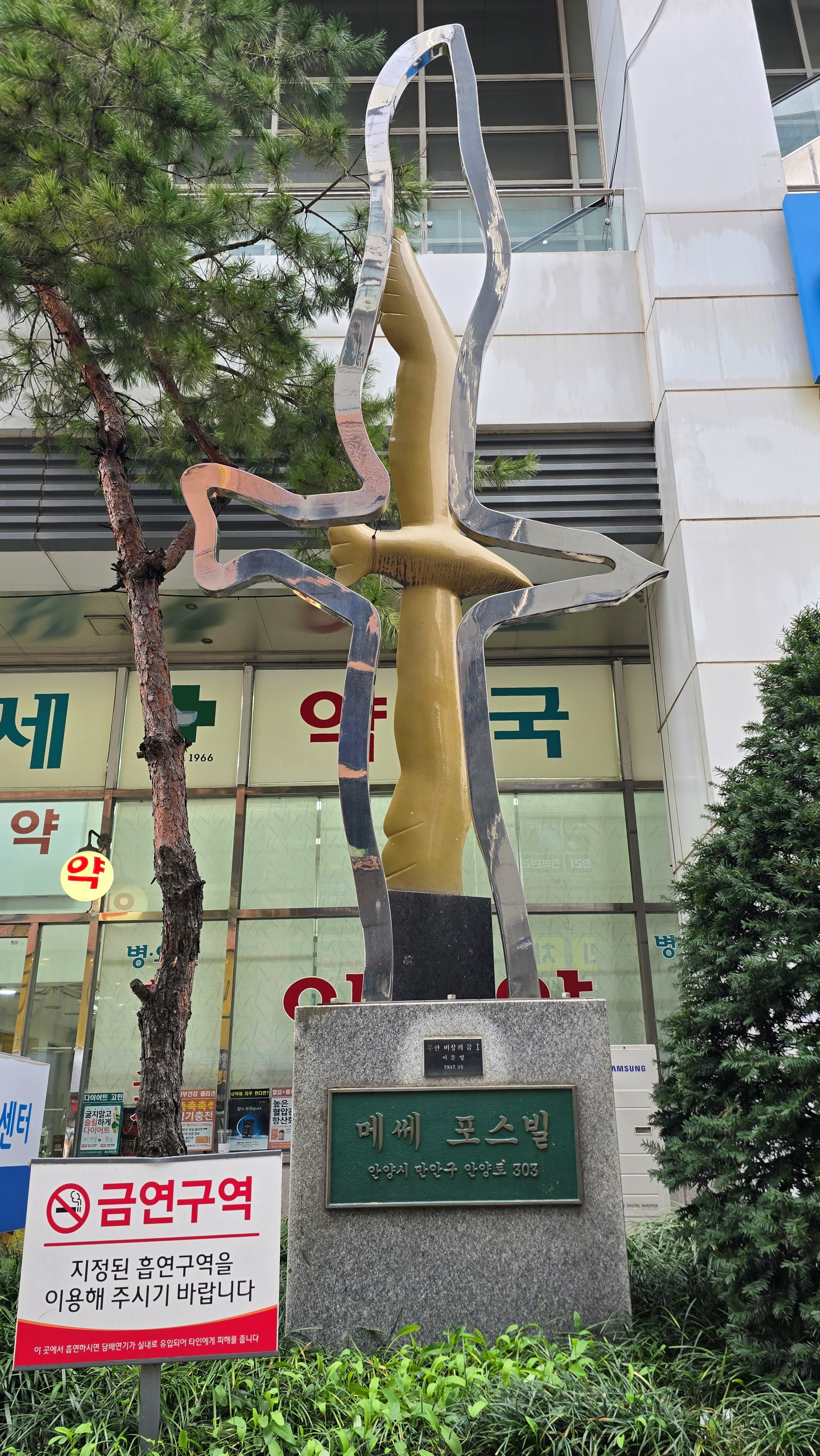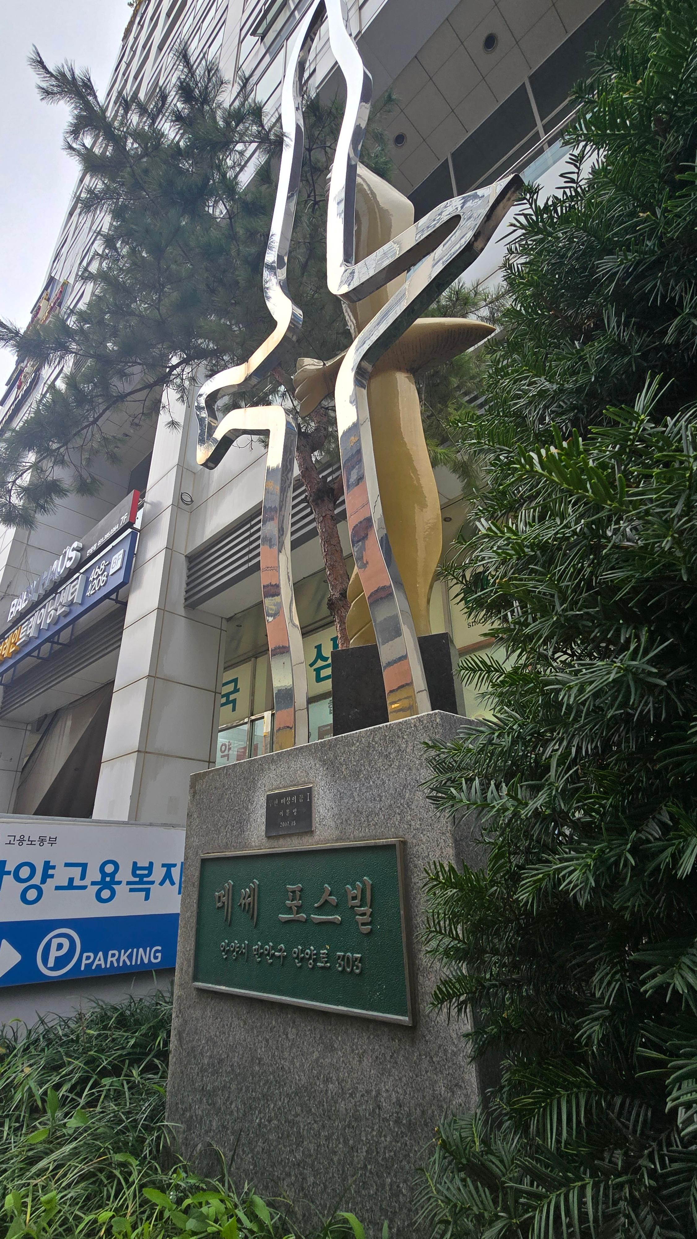 2025.10.18/ #안양 #건축 #조형물 #미술작품 #메쎄 포스빌/ 안양시 만안구 안양로 303 메써 프스빌 빌딩앞. 조형물 작가: 이문영 작품명: 무한 비상의 꿈 1/ 설치: 2007년 5월