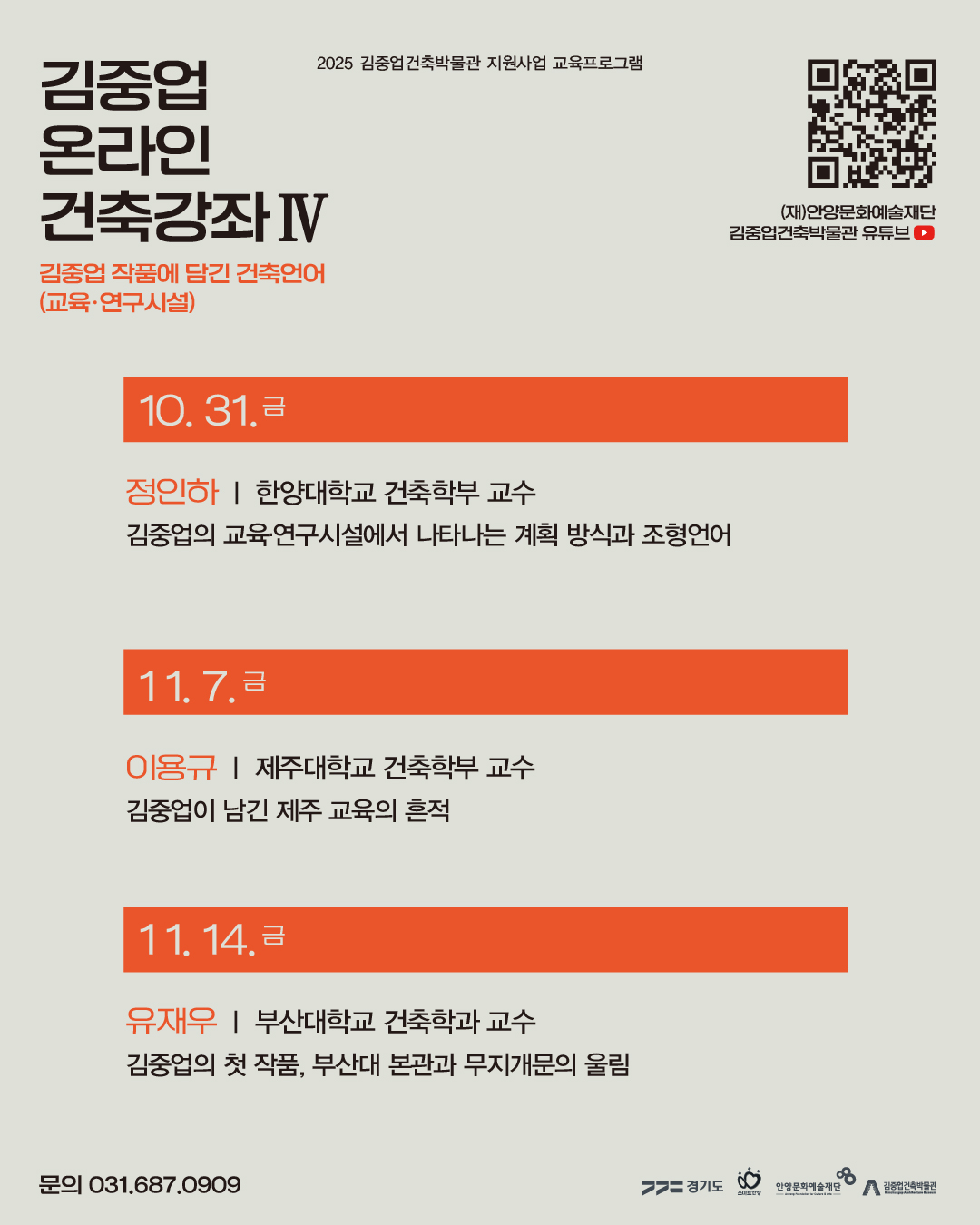 김중업건축박물관은 2025 경기도 박물관/미술관 지원사업의 일환으로 [김중업 온라인 건축강좌Ⅳ]를 진행한다. 10월 31일부터 11월 14일까지 매주 금요일 오후 5시에 순차적으로 공개되는 이번 교육은 '김중업 작품에 담긴 건축언어(교육·연구시설)'을 주제로 다양한 건축 관련 전문가들의 담론을 유튜브를 통해 공개한다.