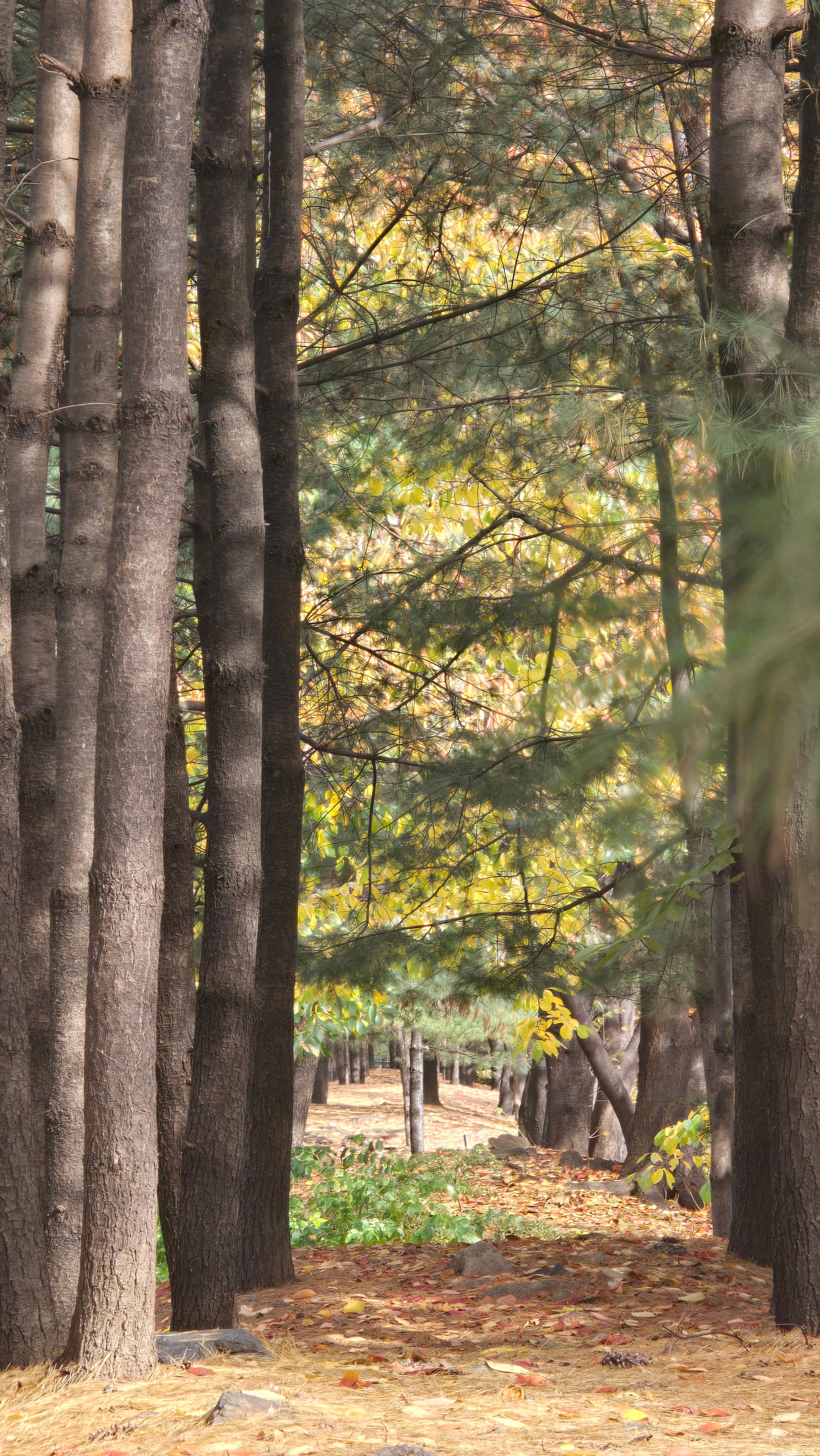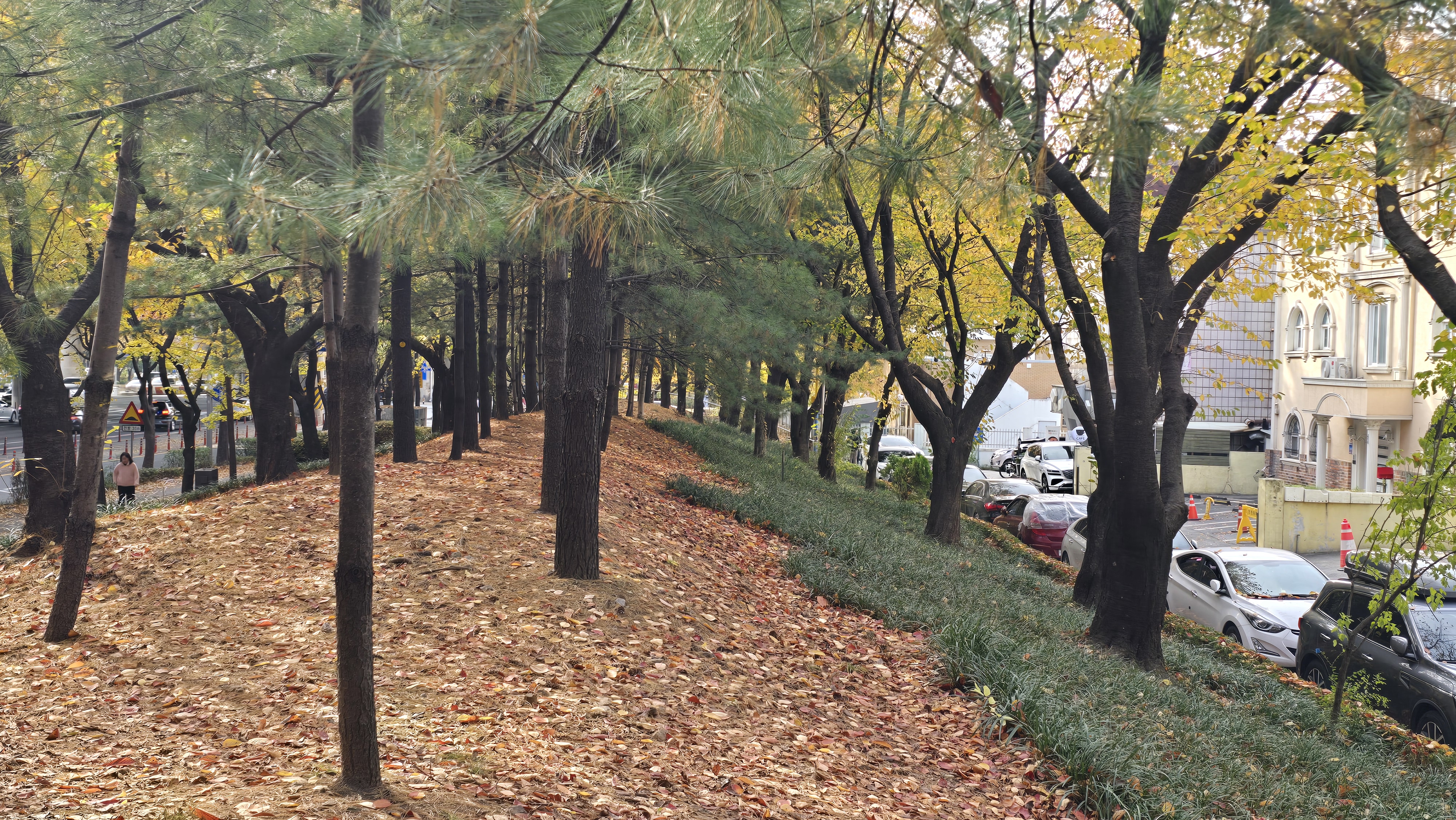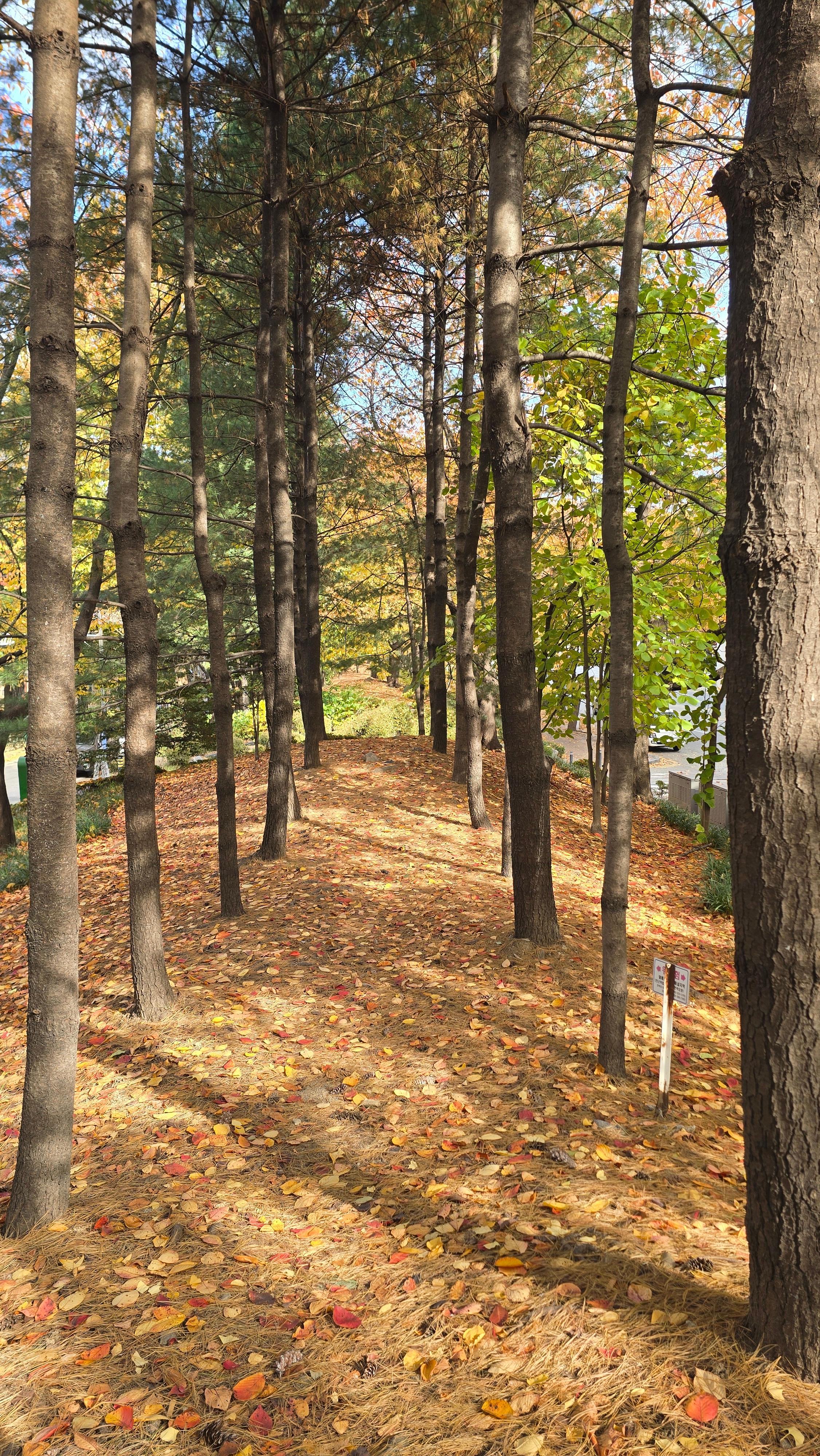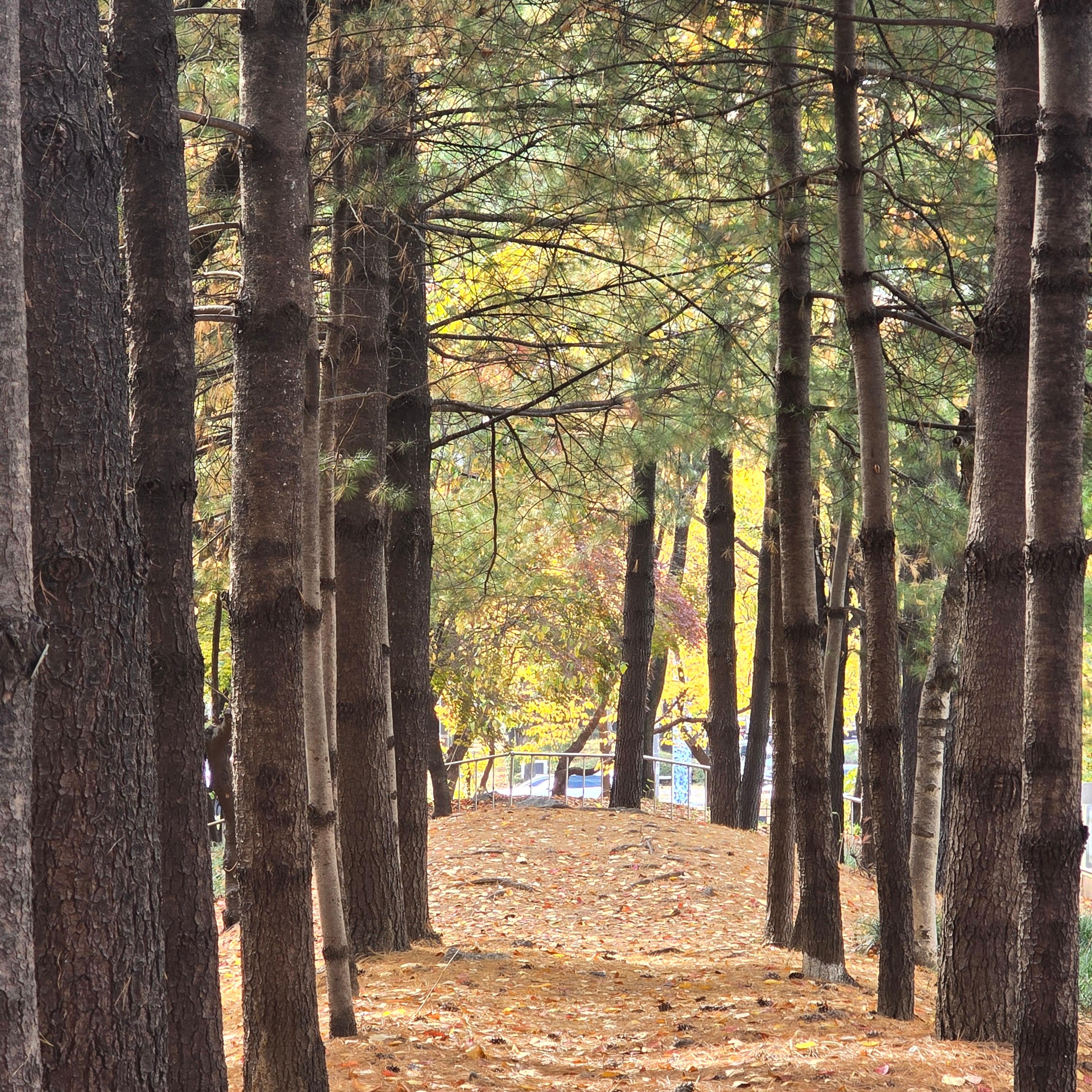 2025.11.11/ #도시기록 #안양 #잣나무숲길/ 안양 평촌 귀인동 자유공원시거리-농수산물도매시장사거리 신기대로 좌측의 인도옆 뚝방위 소나무 숲길은 아는 사람만이 걷는다. 이곳은 매미들이 짝짓기 히고 산란하는 곳으로 여름엔 시원한 바람과 함께 매미 우화 과정을 관찰하고 가을엔 낙업 밟으며 걷는 멋진길. 스트로브 잣나무 숲길이다.