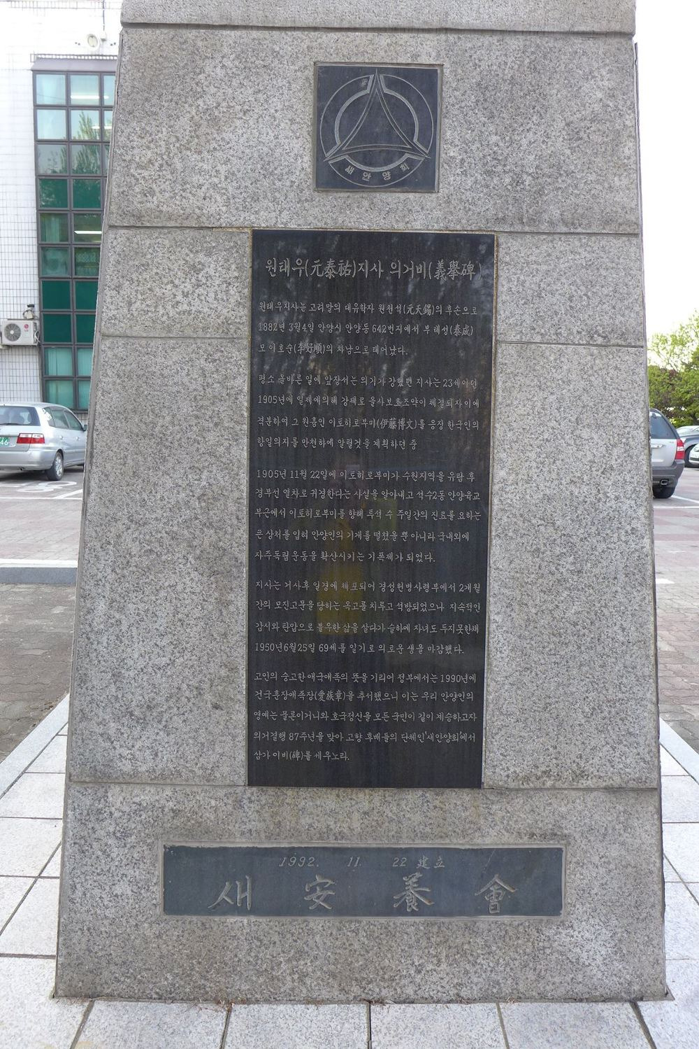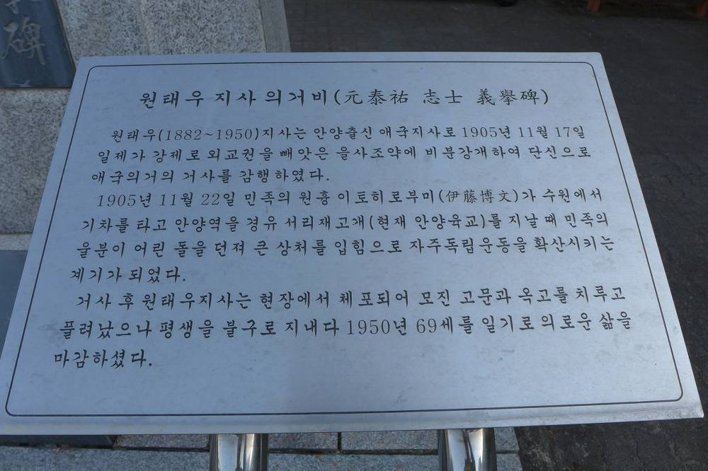 일본제국주의가 강제로 을사조악을 자행한지 5일후인 1905년 11월22일 안양 석수동에서 오직 구국의 일념으로 우리나라 침략의 원흉 이동박문에게 들을 던져 수주의 상해를 입히고 계속되는 민족의 저항운동을 볼러 일으키며 안중근의사의 의거와 3.1운동의 밑거름이 된 원태우의사의 의거비가 새안양회 최선용회장을 중심으로 기념비건립추진위원회가 구성된후 4백 여명의 전회원의 성금에 의해 학문과 교양을 같고 닦는 안양시립도서관 광장에서 지난 3일 오후4시 제막식이 거행했다.