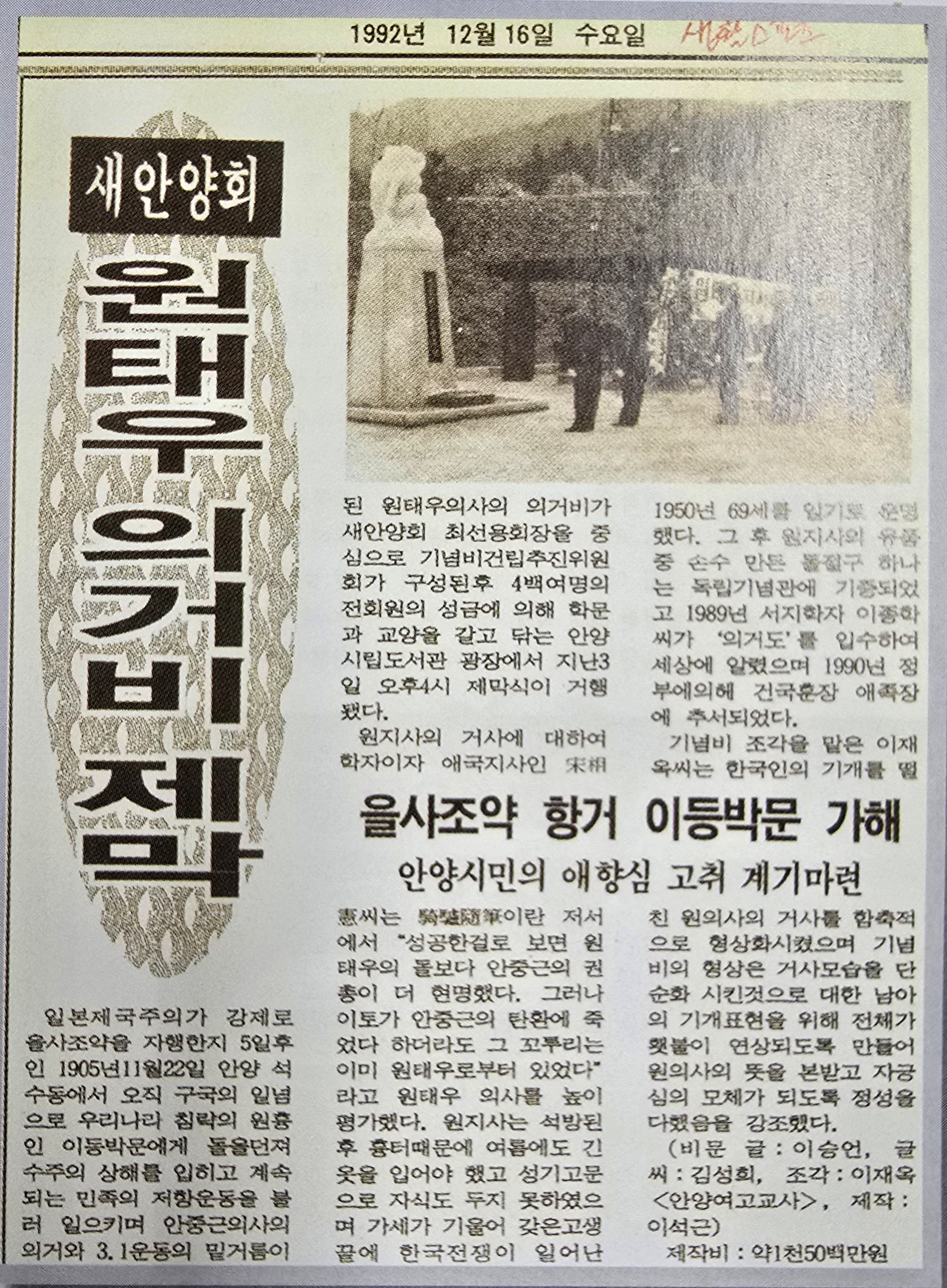 [20251116]새안양회 1992년 건립 원태우 의거비 자료 발굴