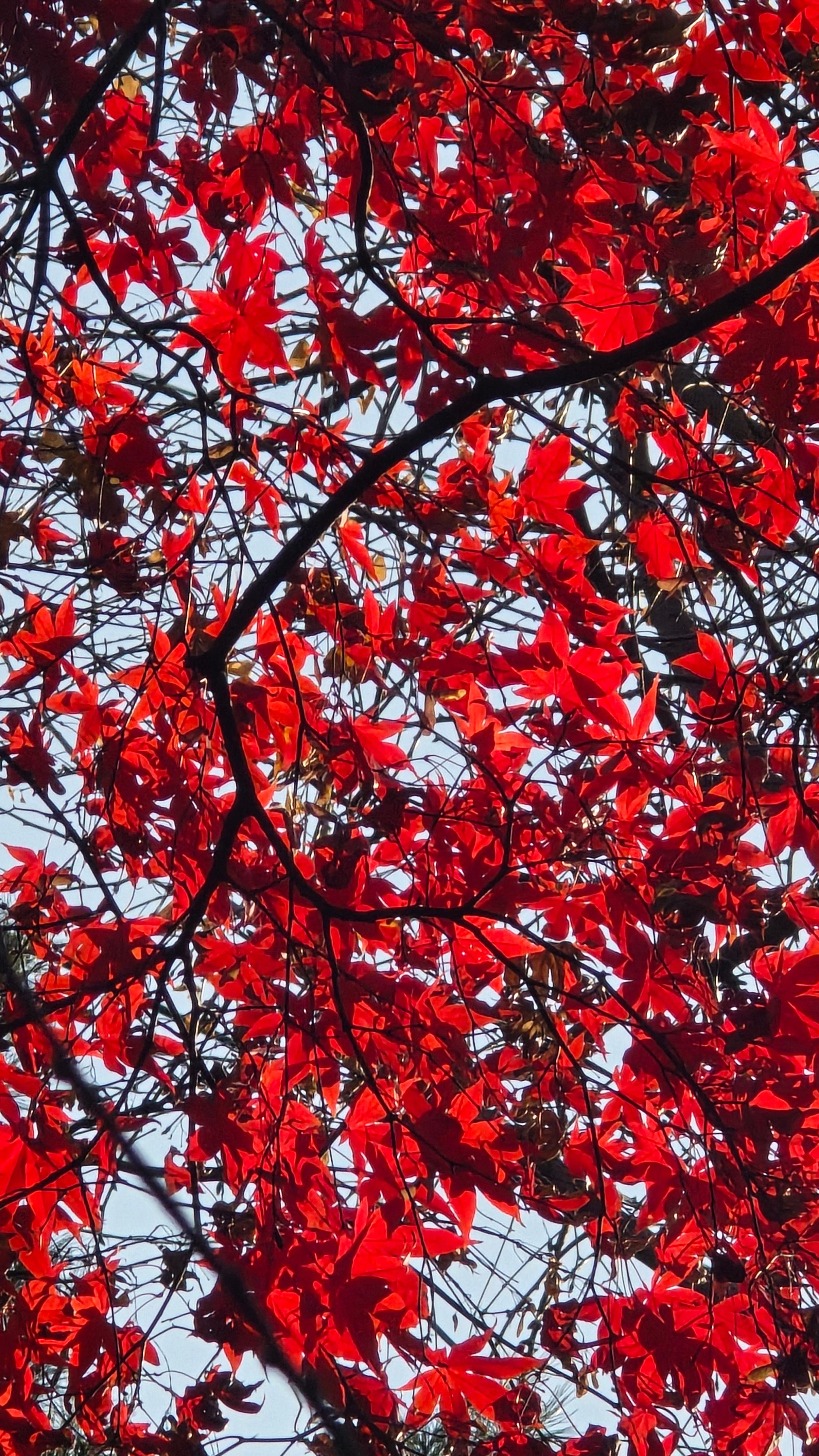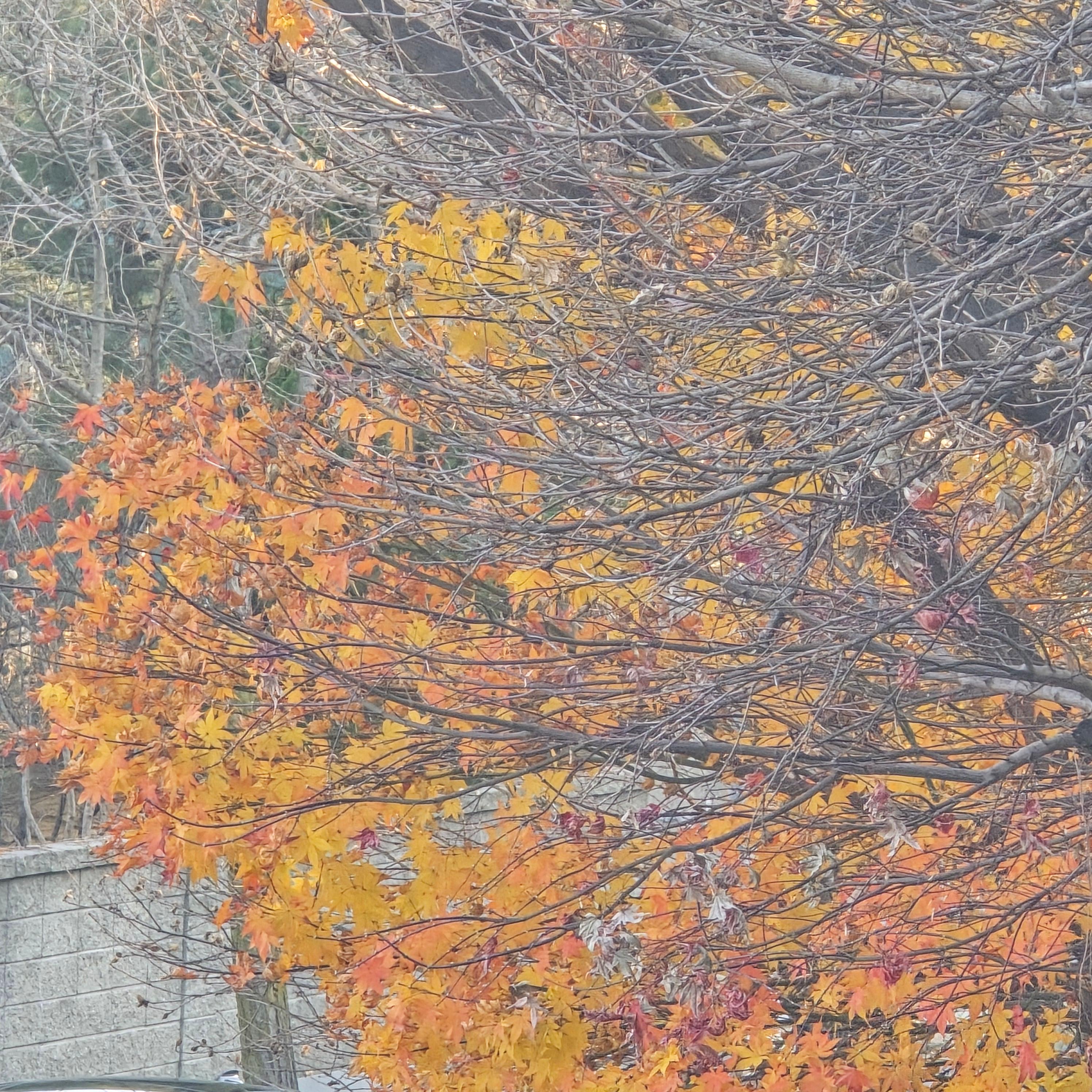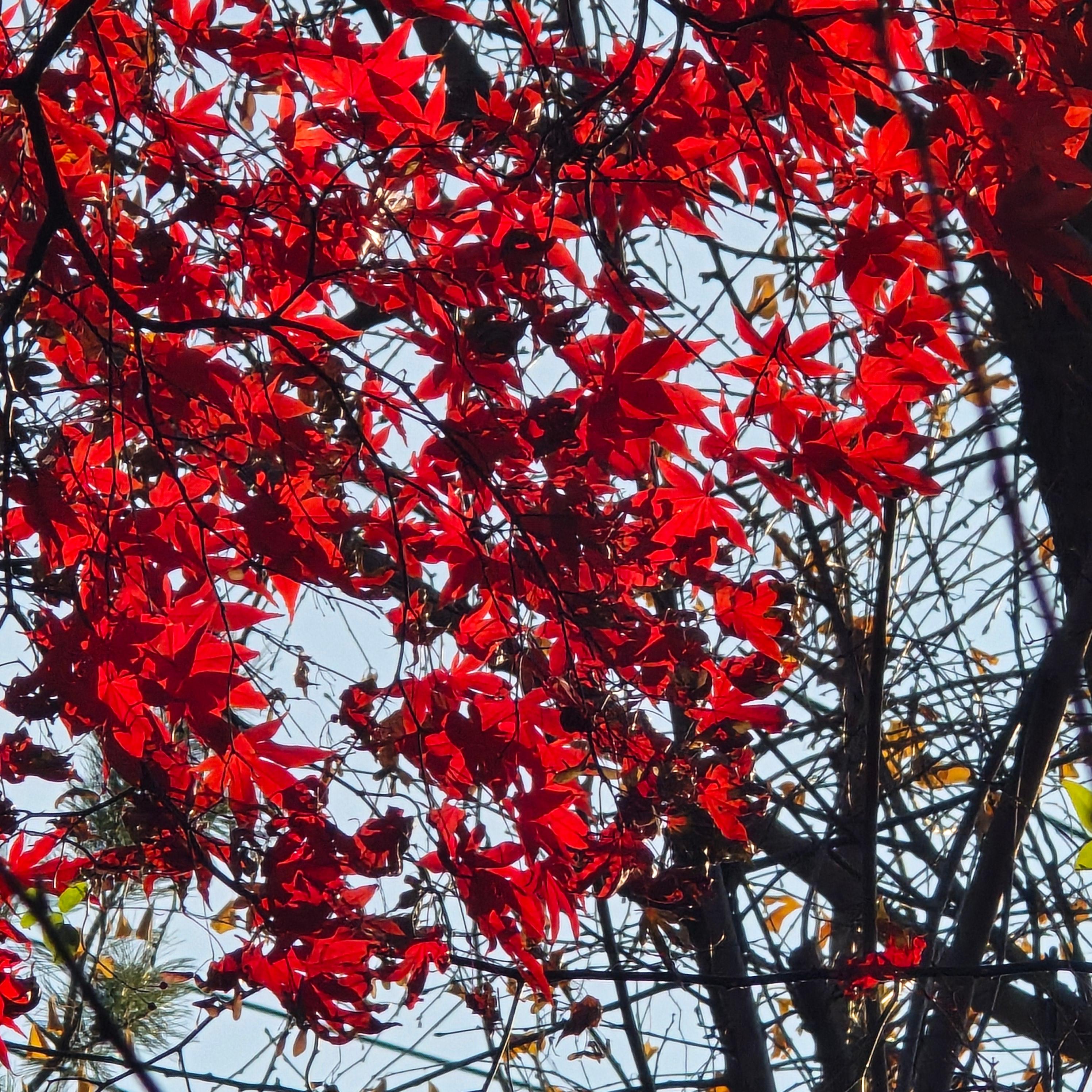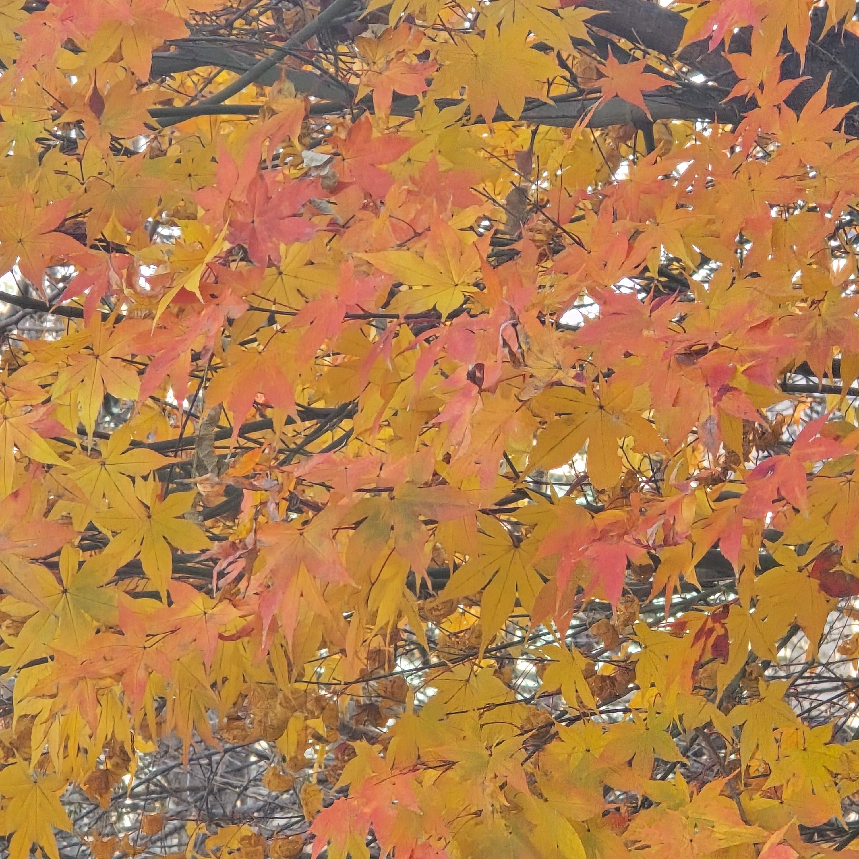 2025.12.02/ #도시기록 #안양 #단풍 #안양시립만안도서관/ 가을과 겨울 사이에 만안도서관 가는 오르막길 양쪽의 단풍나무가 불타는듯 하다.
