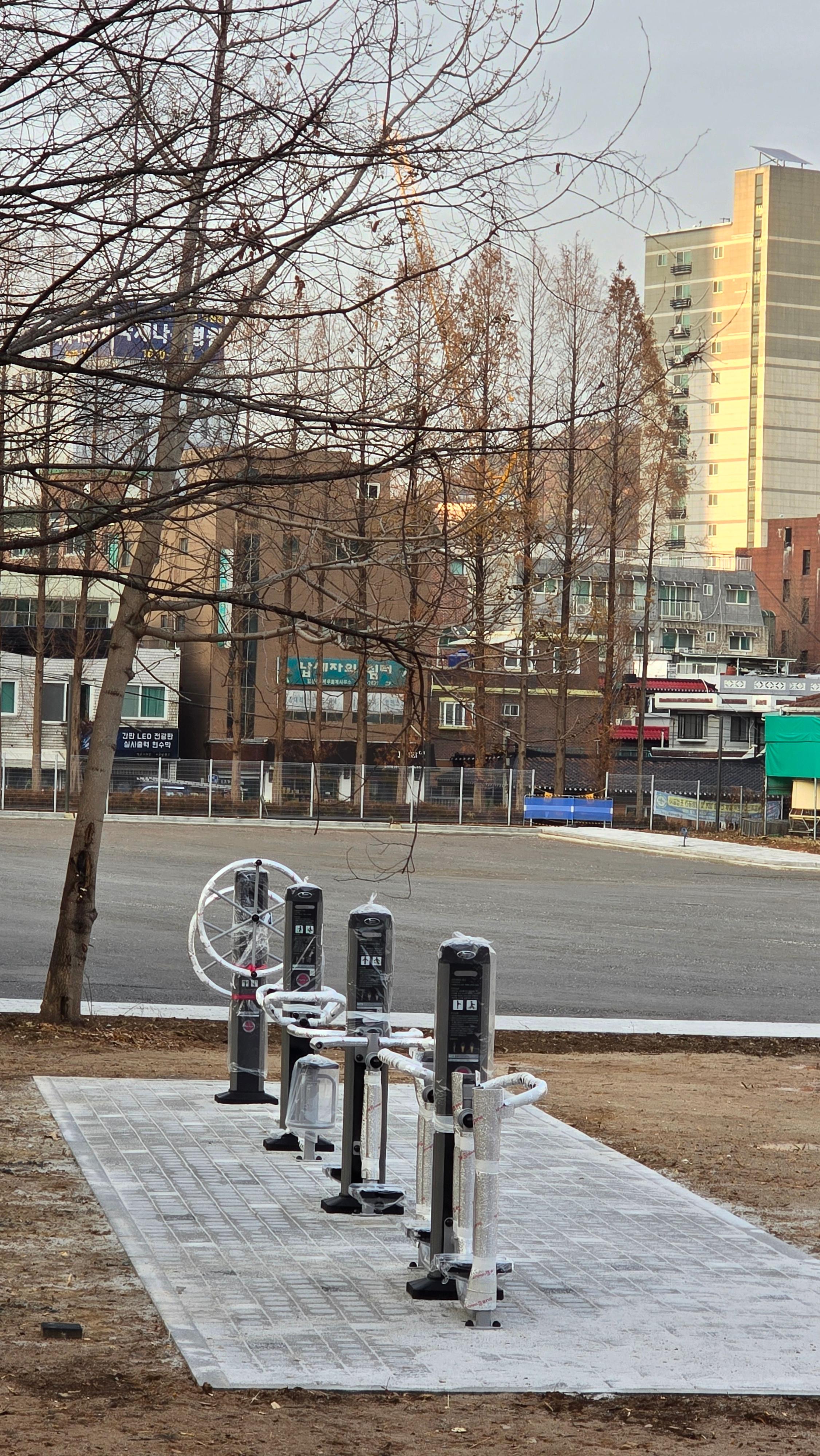 2025.12.12/ #도시기록 #안양 #엣검역원/ 안양6동 옛건역원 본관동 뒷쪽 미개방구역(안양세무서 방향)에 공영주차장(유료) 조성중이다. 주차장 진출입로는 소곡로 방향으로 차량 통행을 위해 인도와 차도 경계에 있던 메타쉐콰이어 서너 그루가 짤려졌다.