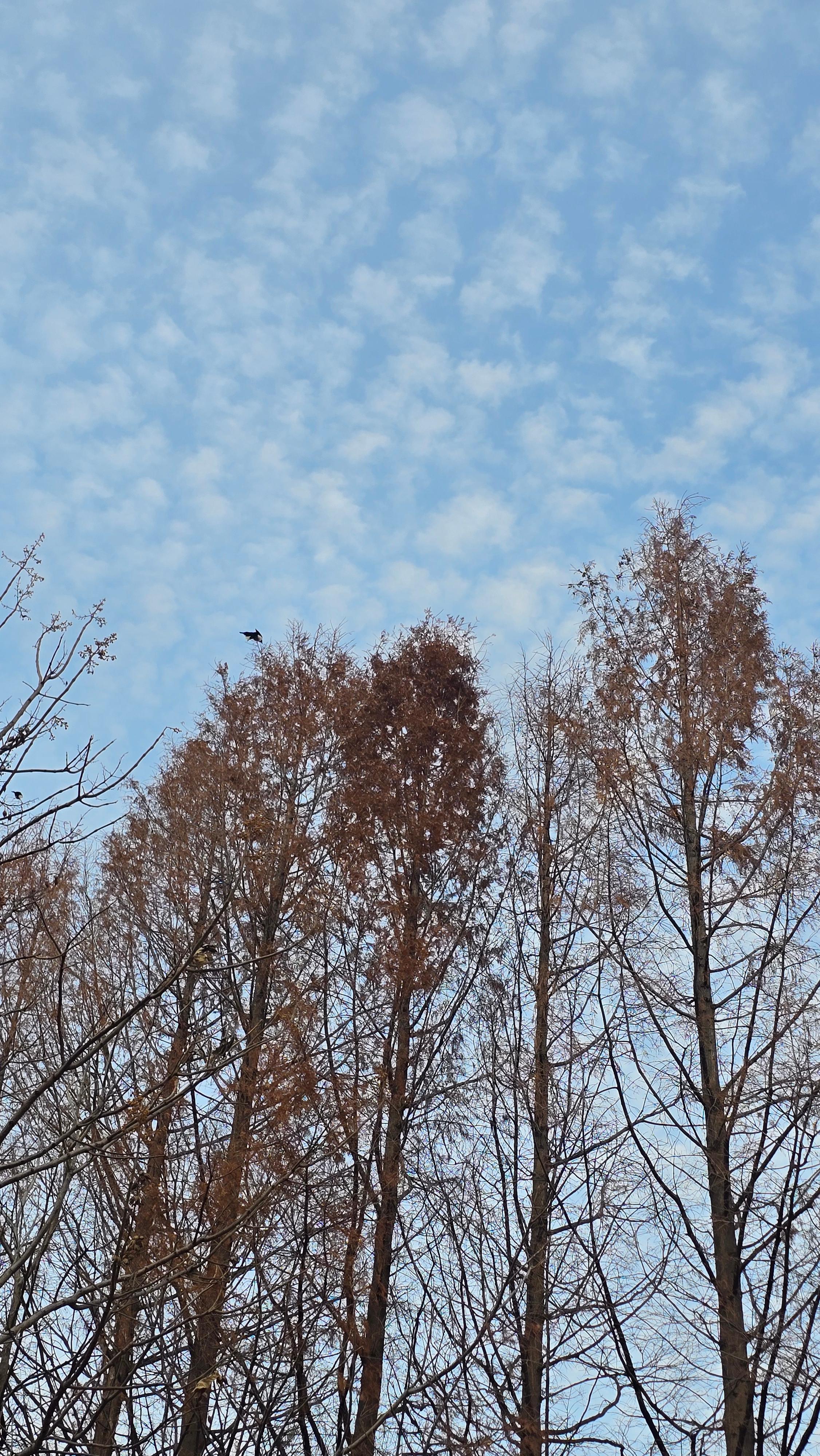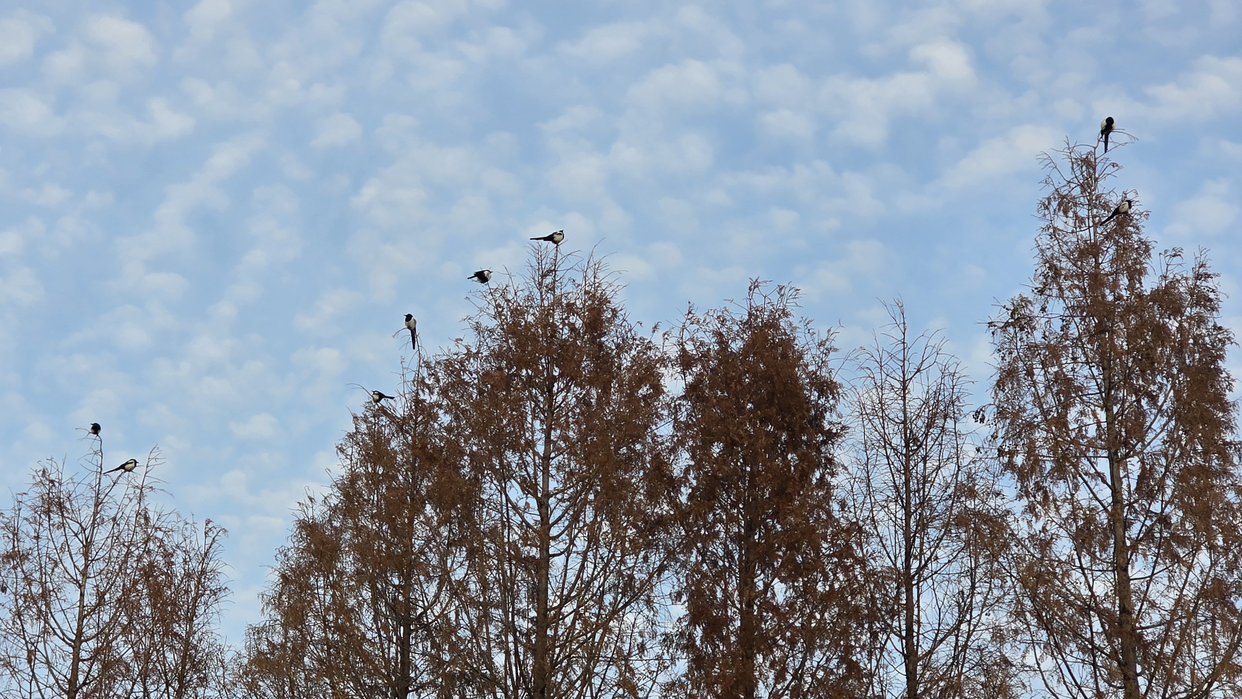 2025.12.112/ #도시기록 #안양 #까치 #케타쉐콰이어/ 안양6동 옛검역원 메타퀘콰이어 나무와 나무 꼭대기에 앉아 자태를 뽐내고 있는 까치들