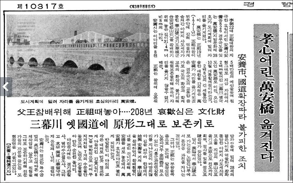 다리 이전(1880년)을 앞두고 보도한 당시 신문(중앙일보 1979.01.27일자)의 "도시계획으로 자리 옮기는 안양 『효성의 다리』…만안교" 기사를 보면 경기도가 이 다리를 옮기기로 한것은 ▲교통량증가로 원형보존이 어렵고 ▲다리밑 하천(안양천)일대가 침수지역이며 ▲도로확장으로 이전이 불가피하게 되었기 때문으로 만안교의 새 자리는 이곳에서 2백m떨어진 삼막천으로 구국도인 만안로에서 석수동을 이어 삼성주택 진입로와 닿는다. 경기도는 8천5백만원을 들여 10월안에 공사를 끝낼 계획이다고 기록돼 있다.