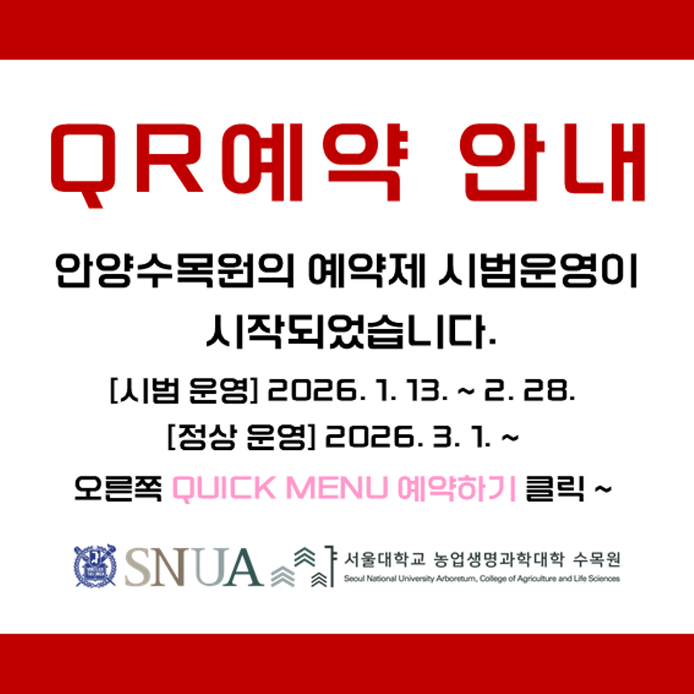 수목원 예약제(http://arbor.snu.ac.kr)는 2026년 1월 1일부터 2월 28일까지 시범 운영 중으로, 해당 기간에는 예약을 통한 큐알(QR) 코드 입장과 현장 입장이 가능하다. 시범 운영이 종료되는 3월 1일부터는 예약 없이 수목원에 입장할 수 없다.