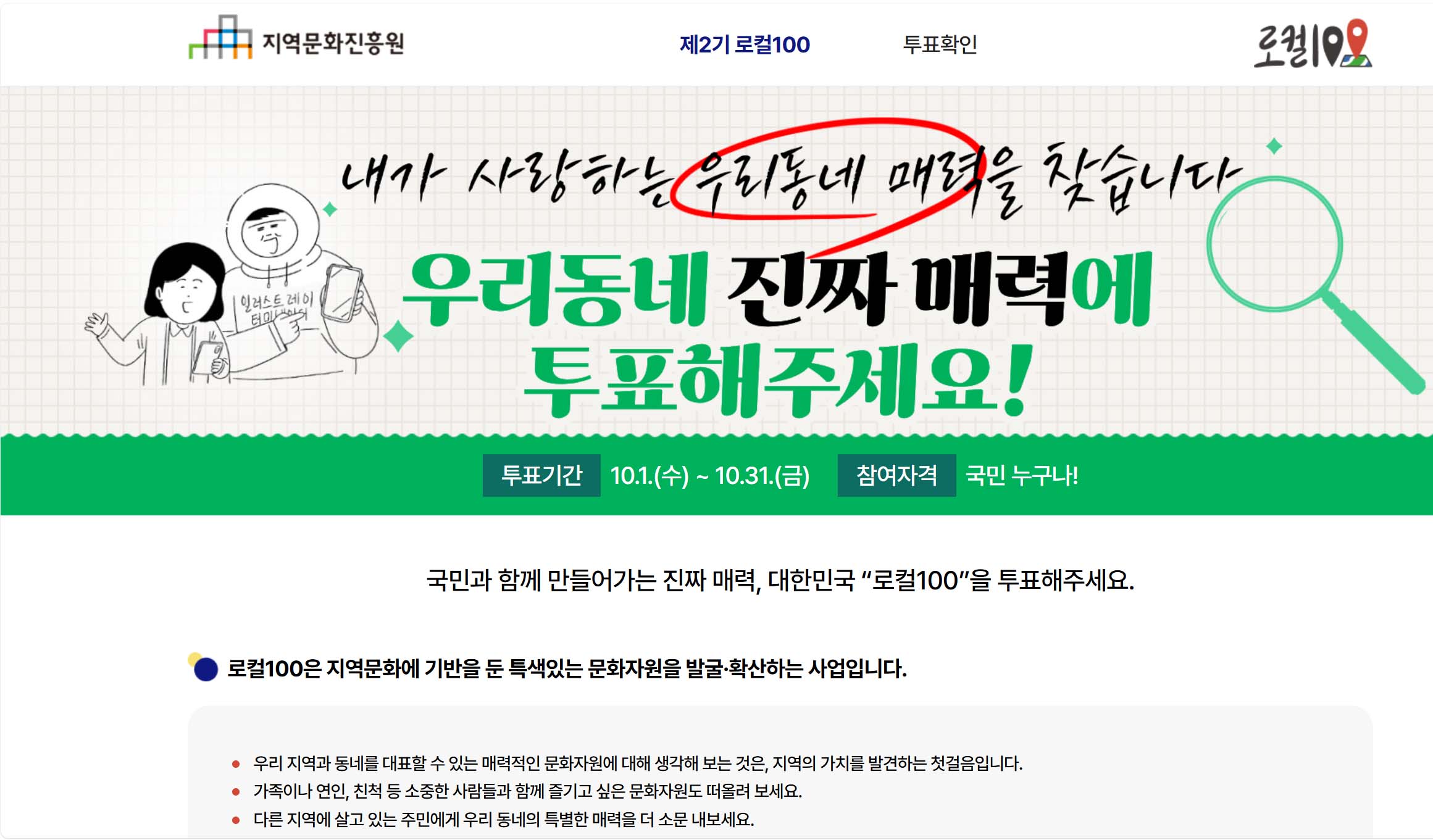 '로컬100'은 문화체육관광부가 지역을 대표하는 우수한 문화자원 100개를 선정해 대국민 홍보를 지원하고, 국민의 문화 향유 기회를 확대하며 해당 지역의 생활인구를 늘리기 위해 추진하는 사업이다.