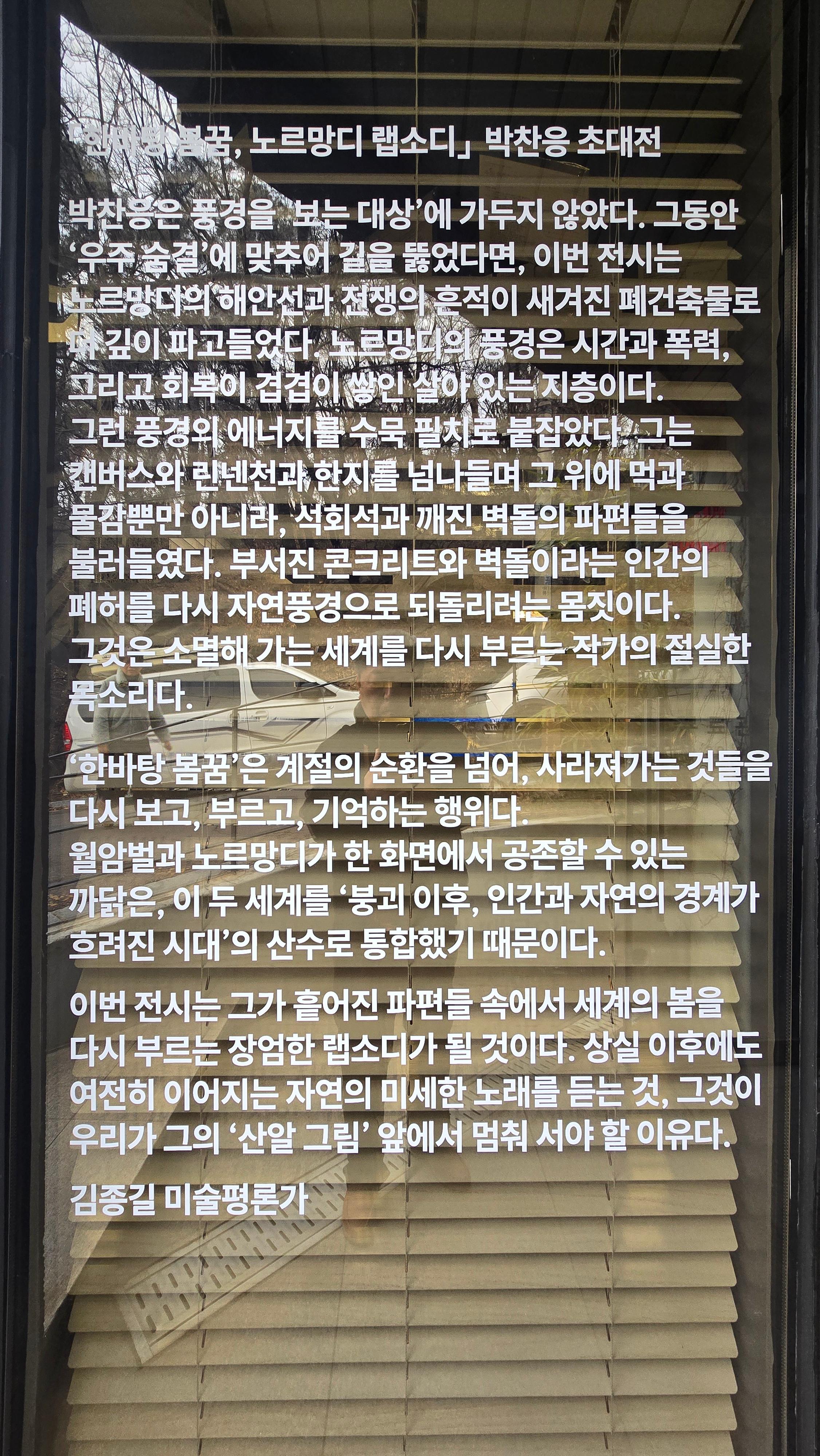 박찬응은 풍경을 ‘보는 대상’에 가두지 않았다. 그동안 ‘우주 숨결’에 맞추어 길(道)을 뚫었다면, 이번 전시는 노르망디의 해안선과 전쟁의 흔적이 새겨진 폐건축물로 더 깊이 파고들었다. 노르망디의 풍경은 시간과 폭력, 그리고 회복이 겹겹이 쌓인 살아 있는 지층이다. 그런 풍경의 에너지를 수묵 필치로 붙잡았다.