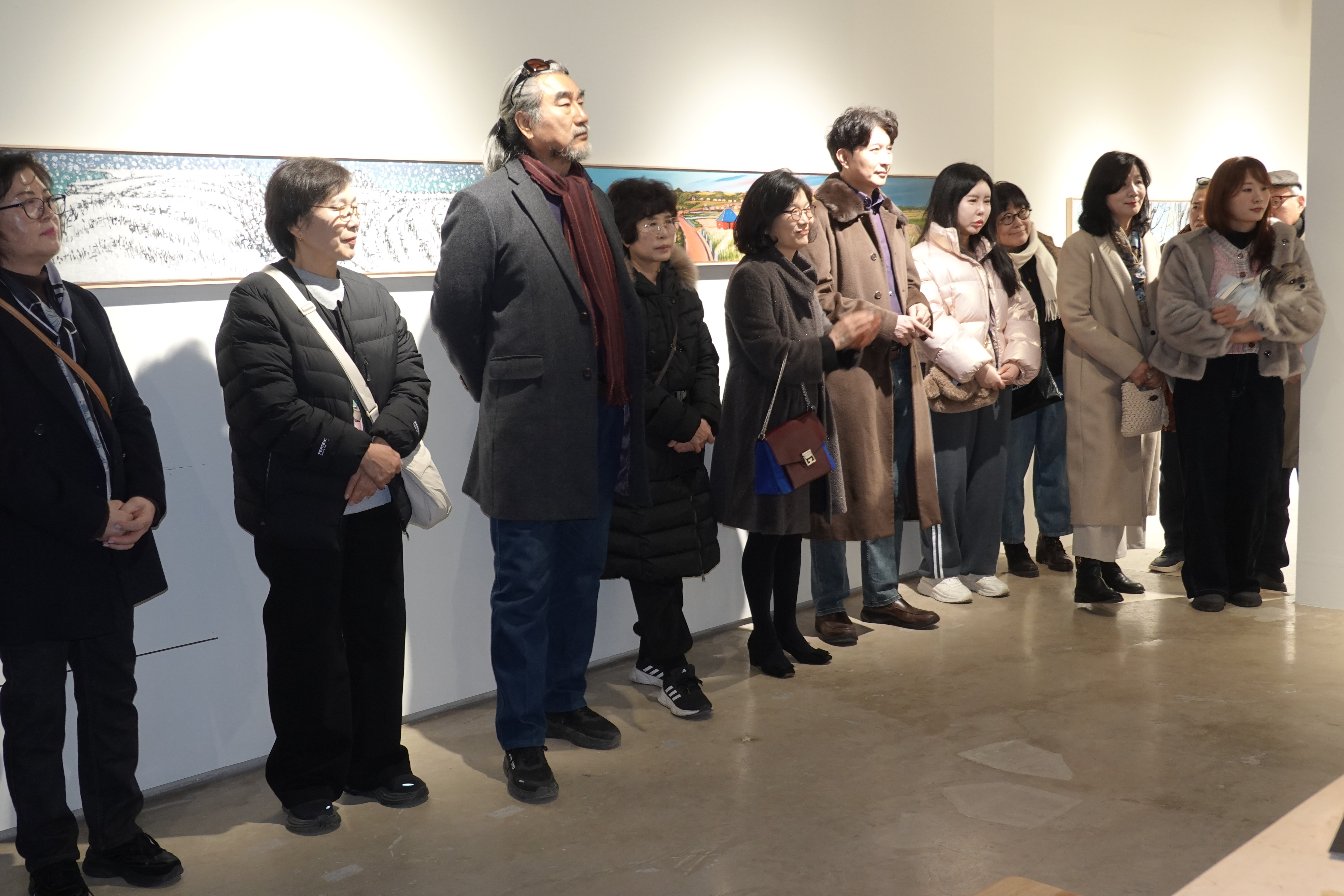 전시작 중에는 한국의 ‘월암벌’과 프랑스의 ‘노르망디’가 한 화면에서 공존하는 작품들이 눈에 띈다. 이질적인 두 세계가 하나의 화폭에 담길 수 있는 이유는, 작가가 이를 ‘인간과 자연의 경계가 흐려진 시대’의 통합된 산수로 바라보기 때문이다. 작가는 낮힘(下心)의 자세로 붓의 ‘산숨(生氣)’을 일깨우며, 상실 이후에도 이어지는 자연의 미세한 노래를 관객에게 전달한다.