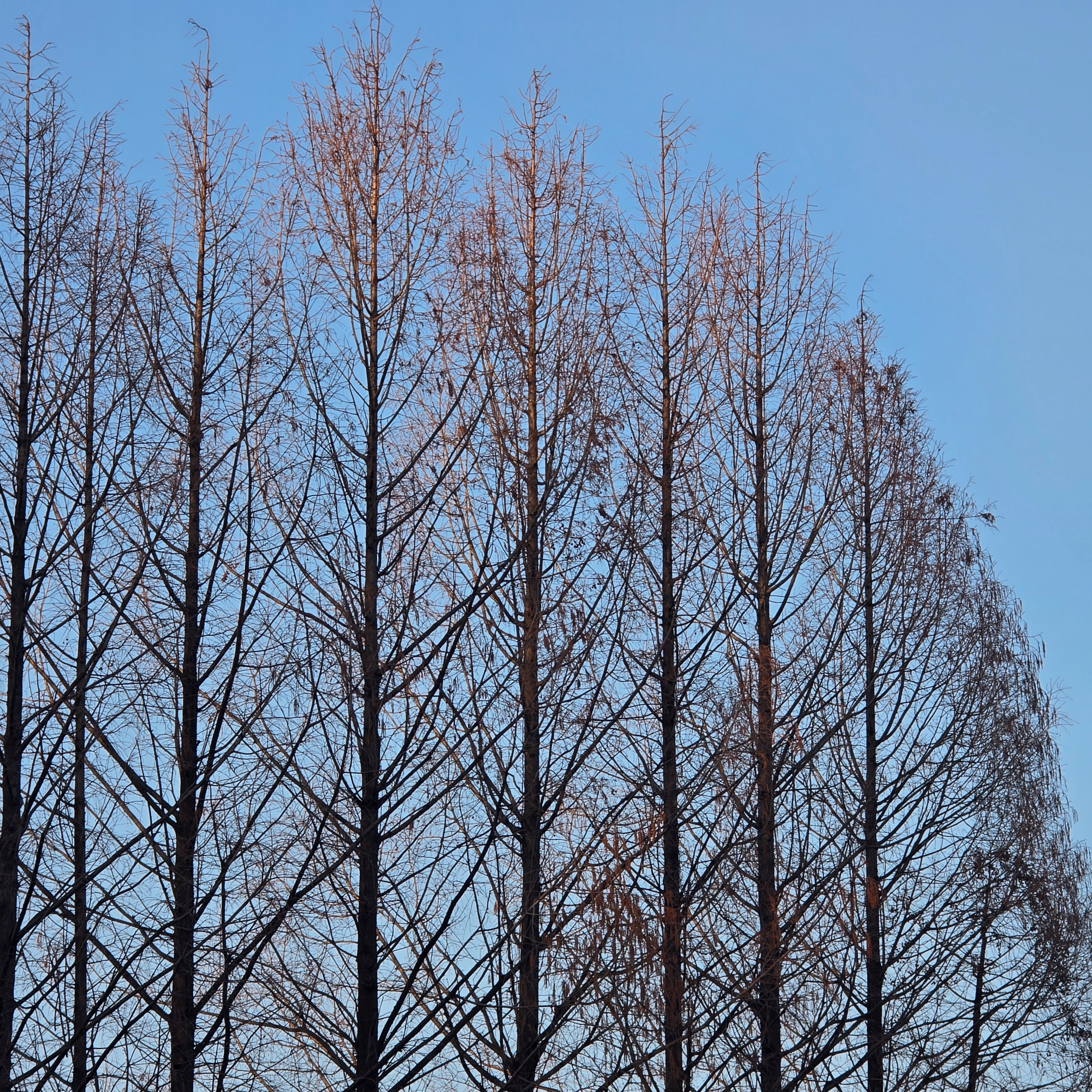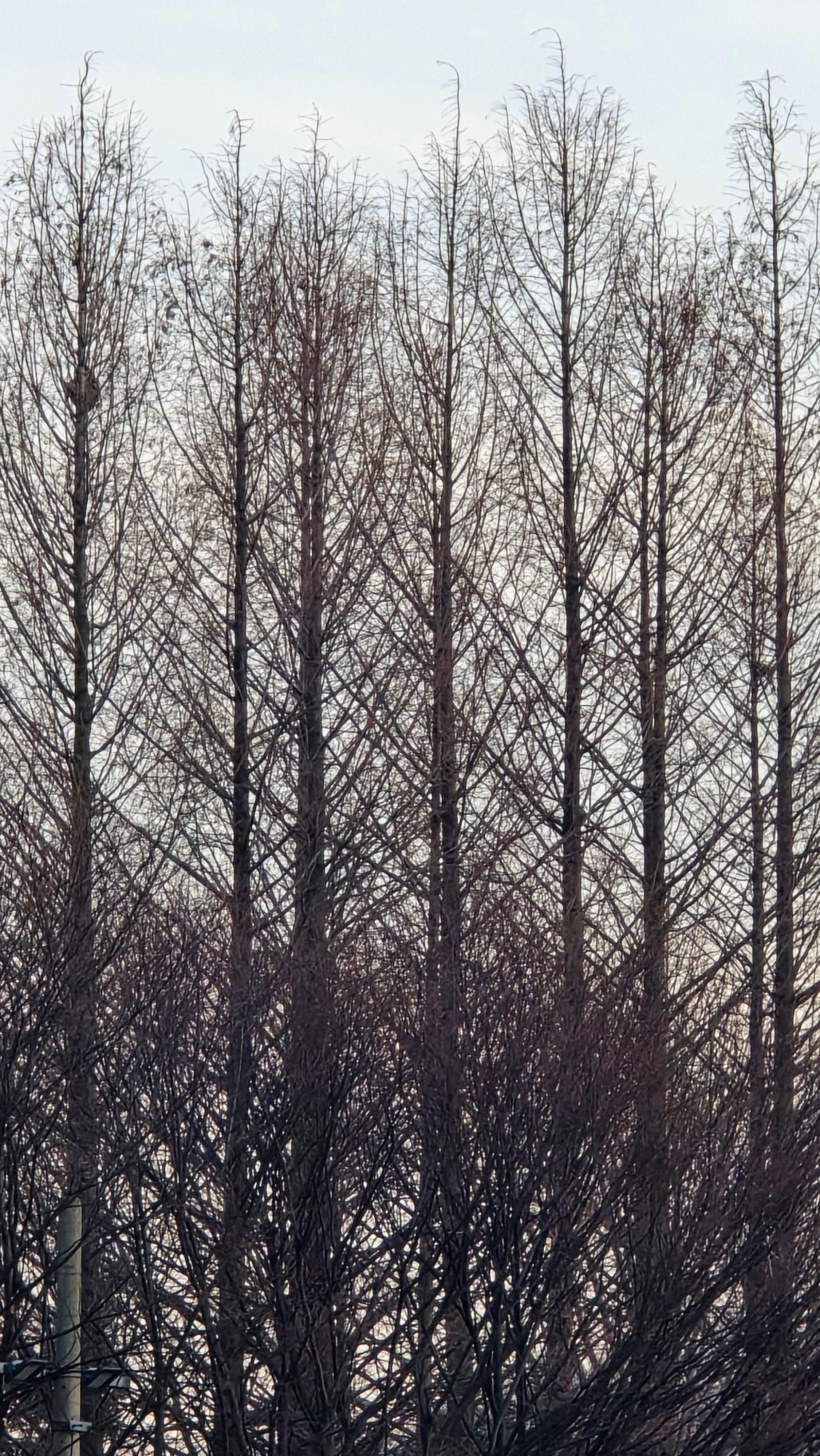 2026.02.16/ #도시기록 #안양 #메타쉐콰이어 #까치집/ 안양6동에는 중앙정부 공공기관들이 있었다, 주변 도로 가로수와 건물 경계에 메타쉨하이;어 나무들이 심어졌는데 마각및 재개발과정에서 대부분 베어져 없어지고 옛검역원 담장과 건물 경계에 일부 남아있으며 까치들의 놀이터이자 산란 장소인 둥지가 있다.