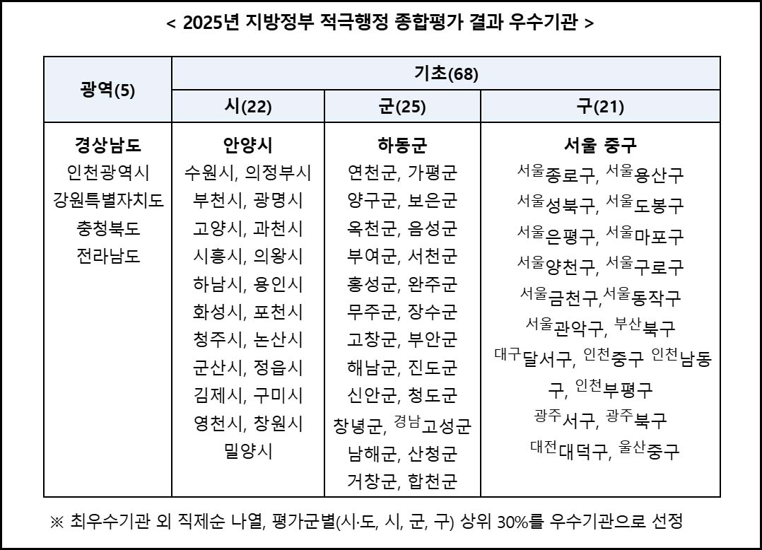 행정안전부는 광역시도 17개를 포함, 총 243개 지방정부를 대상으로 실시한 '2025년 지방정부 적극행정 종합평가' 결과를 24일 발표했다.