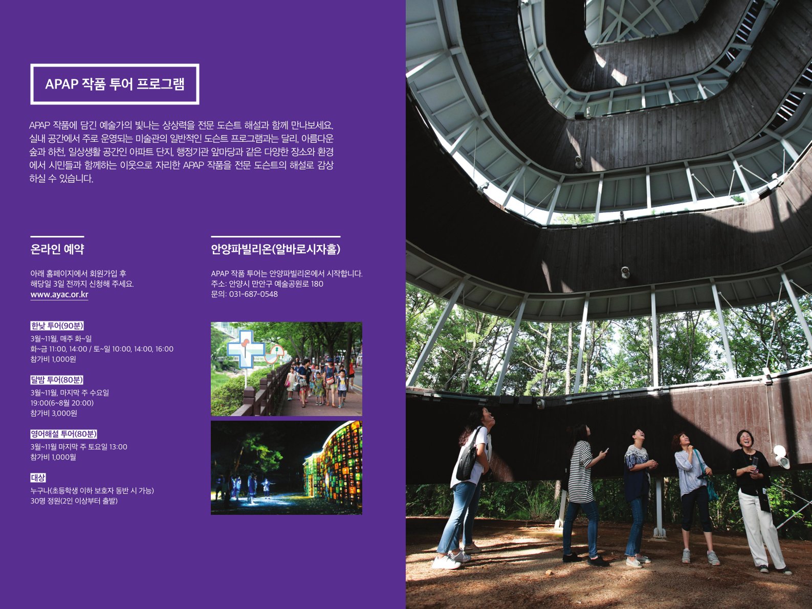 안양공공예술프로젝트(APAP: Anyang Public Art Project)는 3년마다 열리는 국내 하나뿐인 공공예술 트리엔날레입니다. 안양의 지형·문화·역사 등에서 영감을 얻은 세계적인 작가들이 안양예술공원을 중심으로 안양시 곳곳에서 미술·조각·건축·영상·디자인·퍼포먼스 등 다양한 공공예술 작품을 선보이며, 시민들이 일상에서 예술을 누리고 즐길 수 있도록 도시 자체를 하나의 갤러리로 만드는 프로젝트입니다
