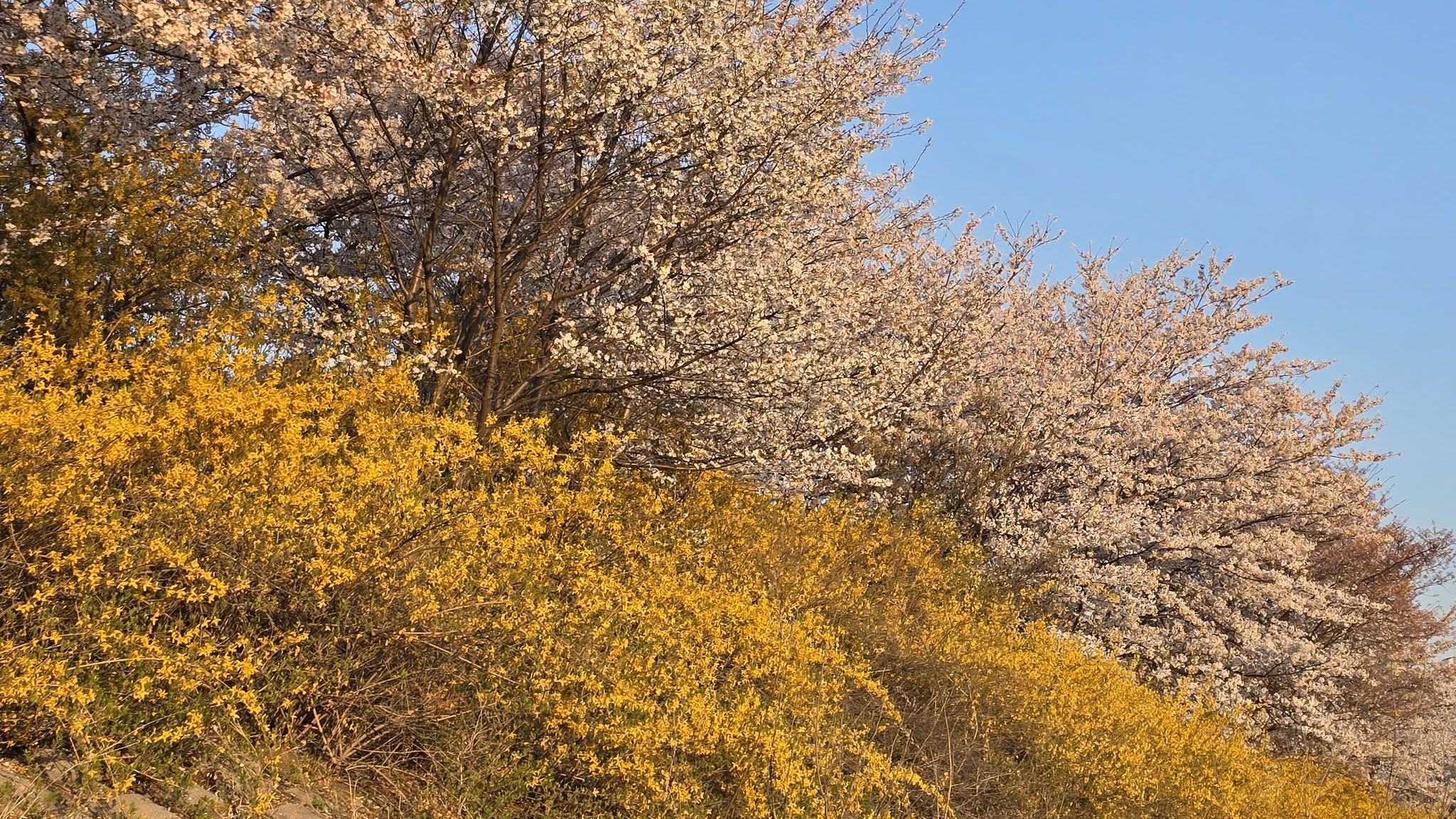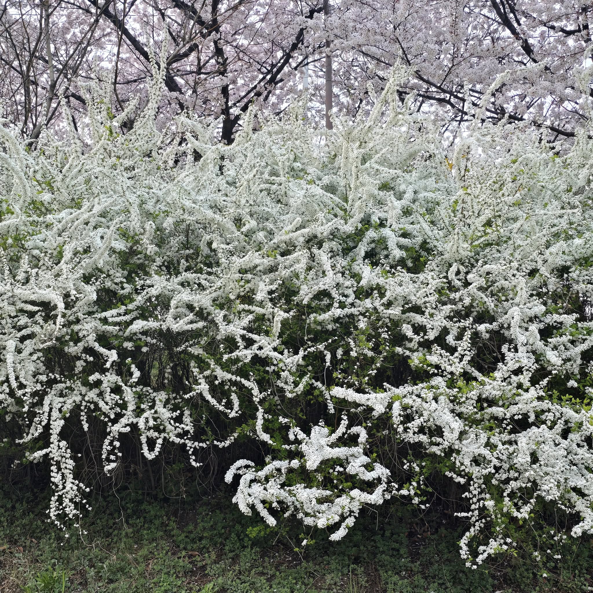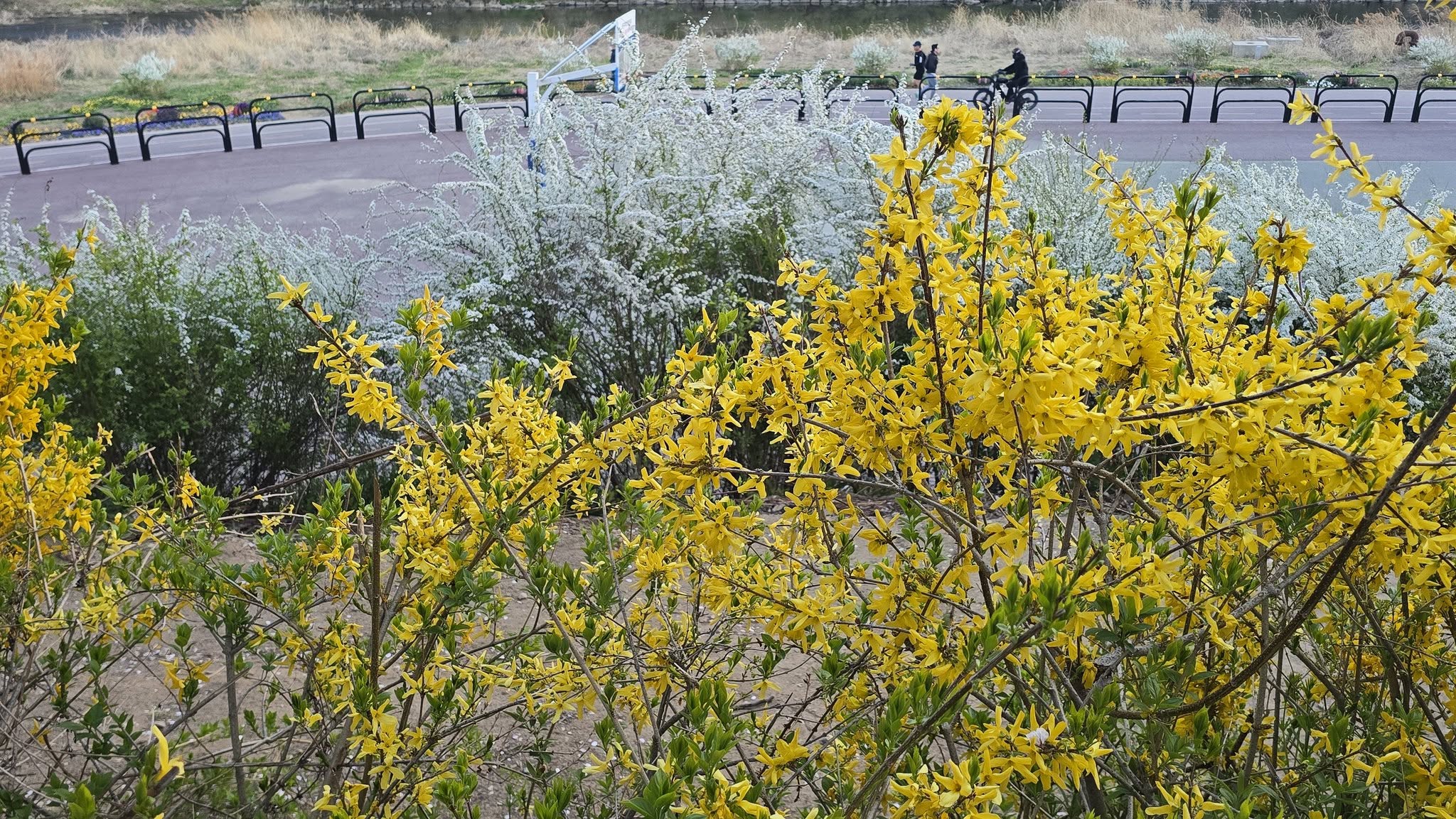 4월 5일부터 피기 시작한 벚꽃은 4월 7일경 만개했다. 8일 안양 충훈벚꽃길에 나가보니 은백색 벚꽃은 물론 노란 개나리, 하얀 조팝꽃까지 시차를 두고 피던 꽃들이 만개하여 그야말로 꽃천지다. 내일(9일)부터는 비가 온다니 멋진 구경은 오늘이 마지막이 아닐까.