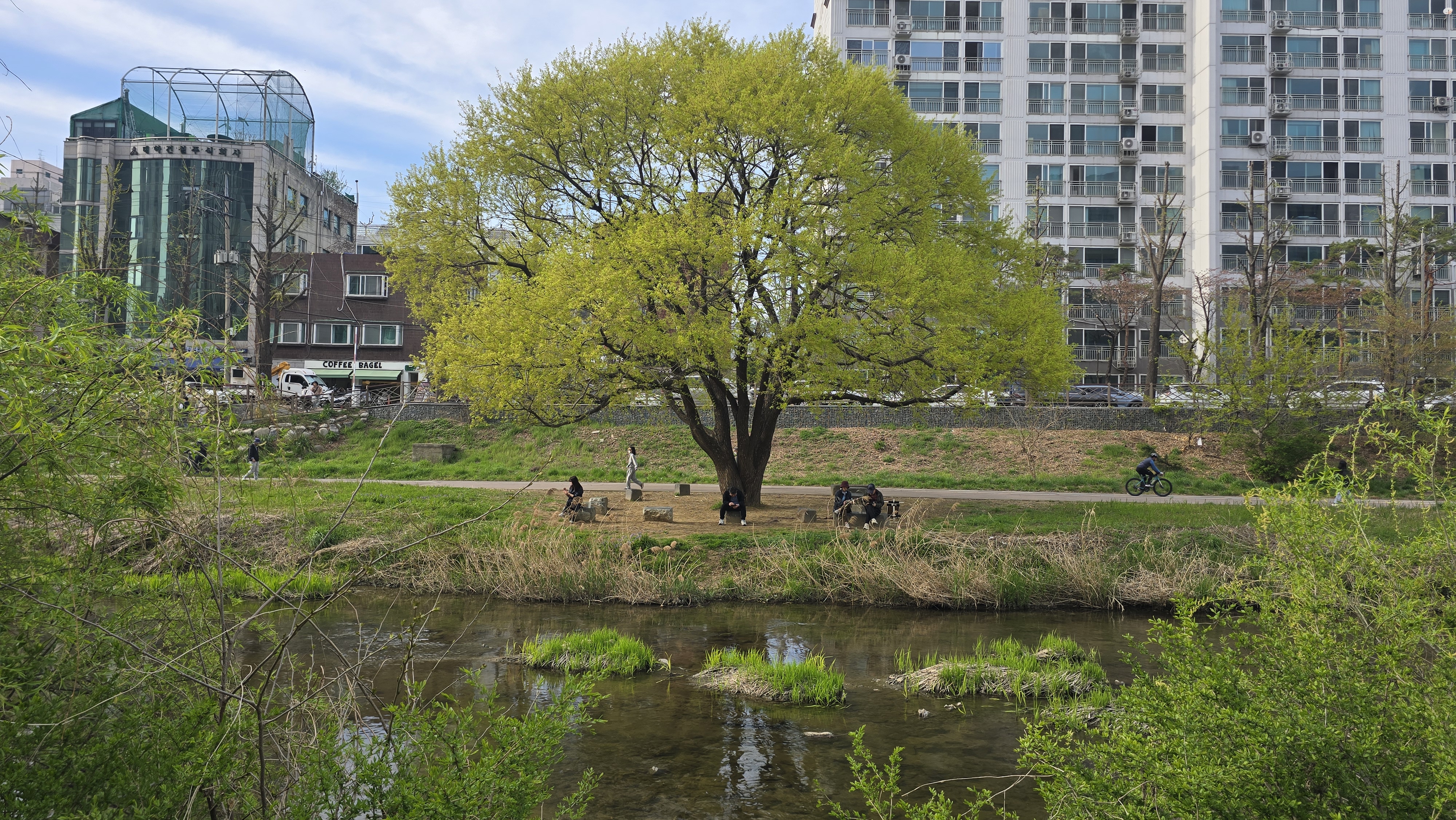 지금은 무더위에 시원한 나무 그늘을 만들어 천변길을 오가는 시민과 두바퀴 자전거 이용자뿐 아니라 주변 주민들까지 나와 쉬는 공간이 되고 생김새도 멋져 학의천에서 으뜸으로 꼽는 명소가 되었다.