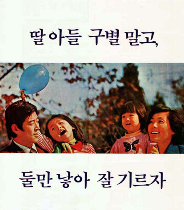 ‘덮어 놓고 낳다 보면 거지꼴도 못 면한다’(1960년대), ‘아들, 딸 구별 말고 둘만 낳아 잘 기르자’(1970년대), ‘낳을 생각하기 전에 키울 생각 먼저 하자’ ‘하나 낳아 젊게 살고 좁은 땅 넓게 살자’ ‘잘 키운 딸 하나, 열 아들 부럽지 않다’ ‘사랑으로 낳은 자식, 아들·딸로 판단 말자’(1980년대), 나중에는 ‘무서운 핵폭발, 더 무서운 인구폭발’ 등과 같은 위협적인 구호까지 등장했다.