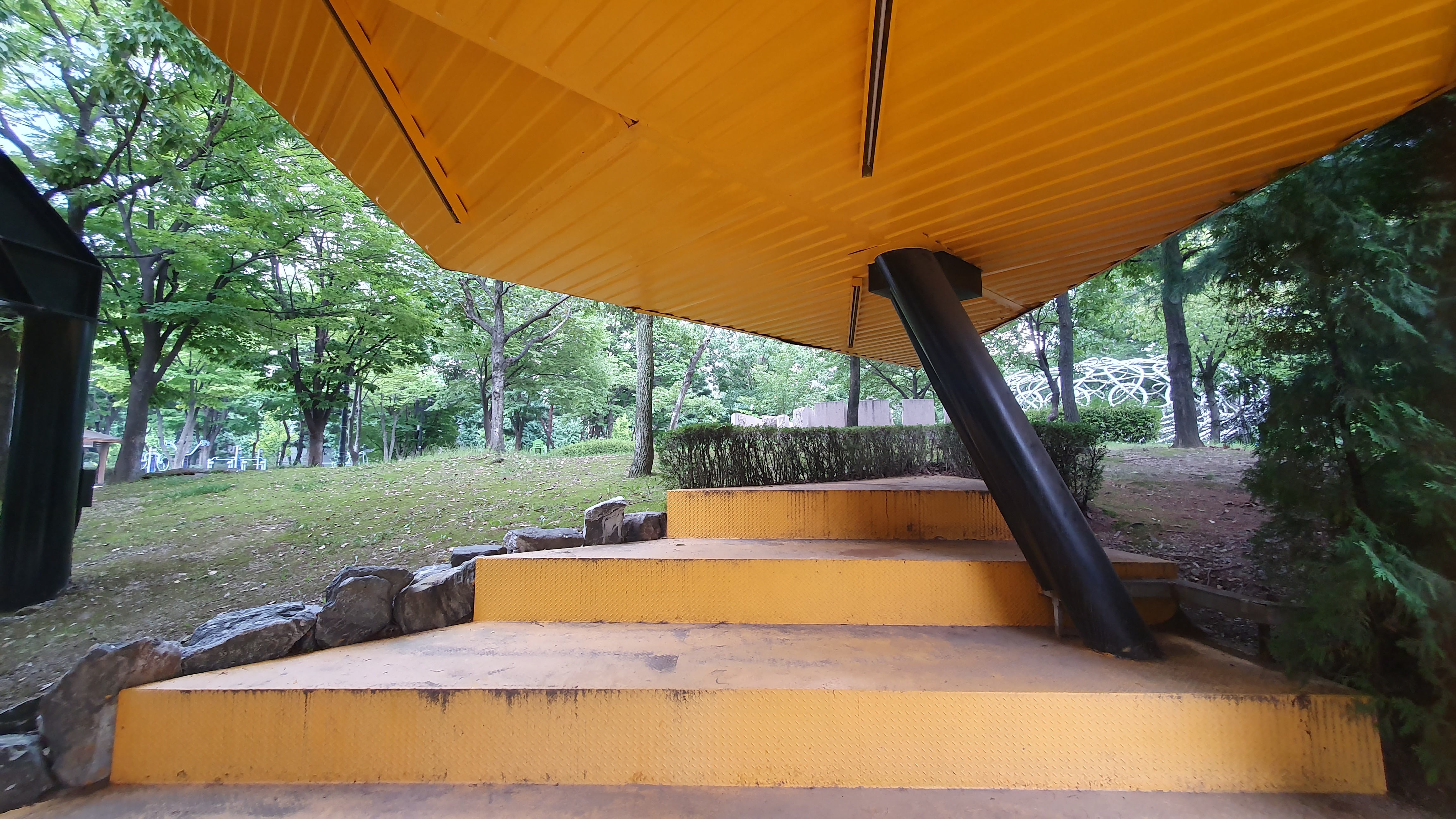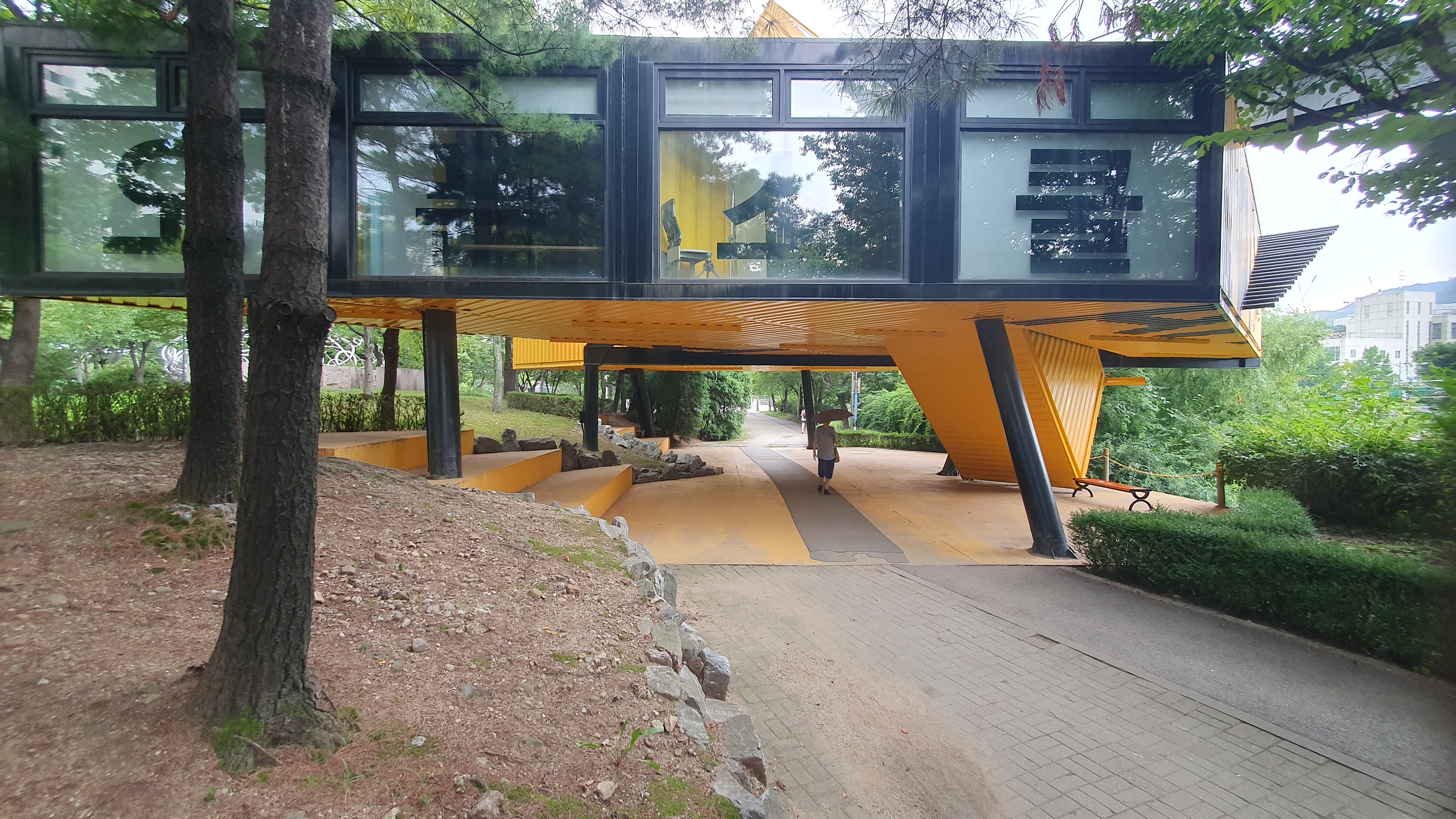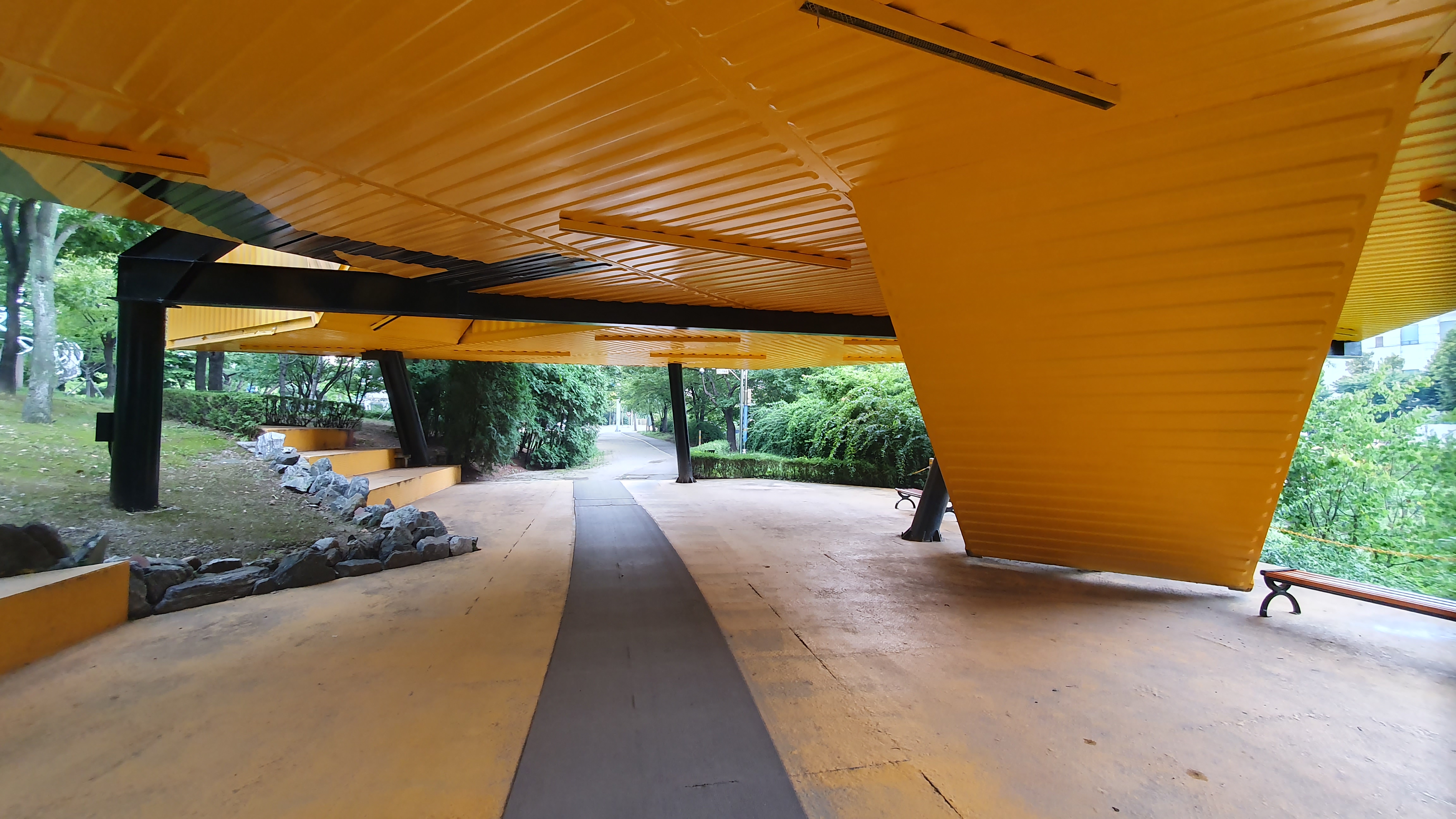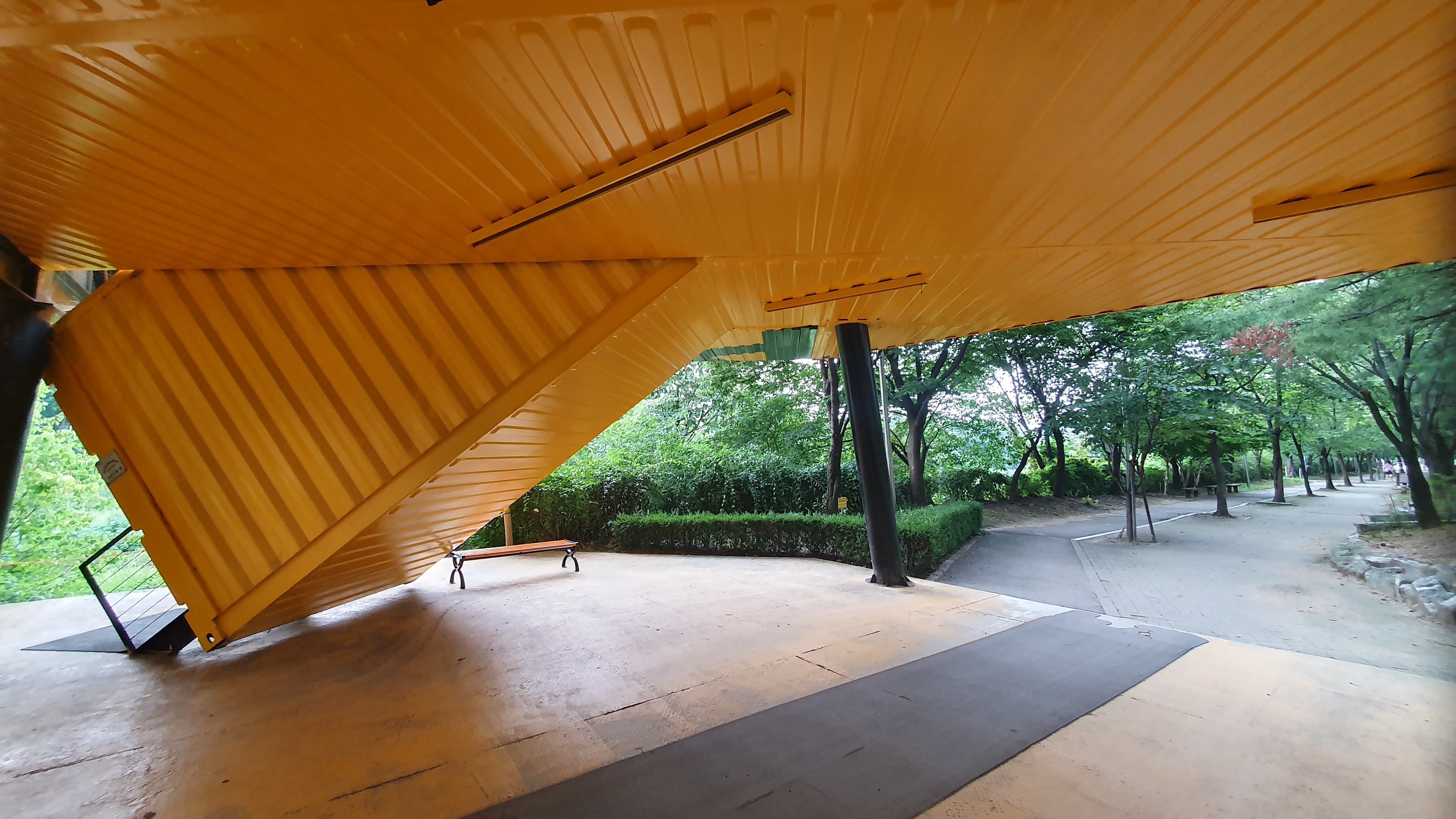 2023,08,06/ #도시기록 #안양 #apap #오픈스쿨 #공공예술 #내비산교 #학운공원B구역/ 안양 학운공원 동쪽 B구역 내비산교 옆에 있는 시설물. 2010년 개최된 제3회 안양공공예술프로젝트(apap)에서 영구작품으로 설치된 오픈스쿨. 뉴욕을 중심으로 활동하고 있는 롯-텍(Lot-Ek)이 설계한 작품으로 건축면적이 238㎡에 달하는 이 구조물은 노란색 컨테이너 8개가 화살표 모양으로 조합돼 있는 필로피 구조로 1층을 공중으로 뛰어 산책로를 확보했고, 실내는 강연과 전시가 가능하도록 설계돼 있다. 2011년 미국 뉴욕건축가협회 주최로 뉴욕에서 열린'2011년 디자인 어워드'에서 치열한 경쟁끝에 건축부문 수상작으로 선정될 만큼 국제적으로도 유명해진 작품이나 제대로 활용을 못한채 마치 버려진듯한 공간으로 전락해 안타깝다.