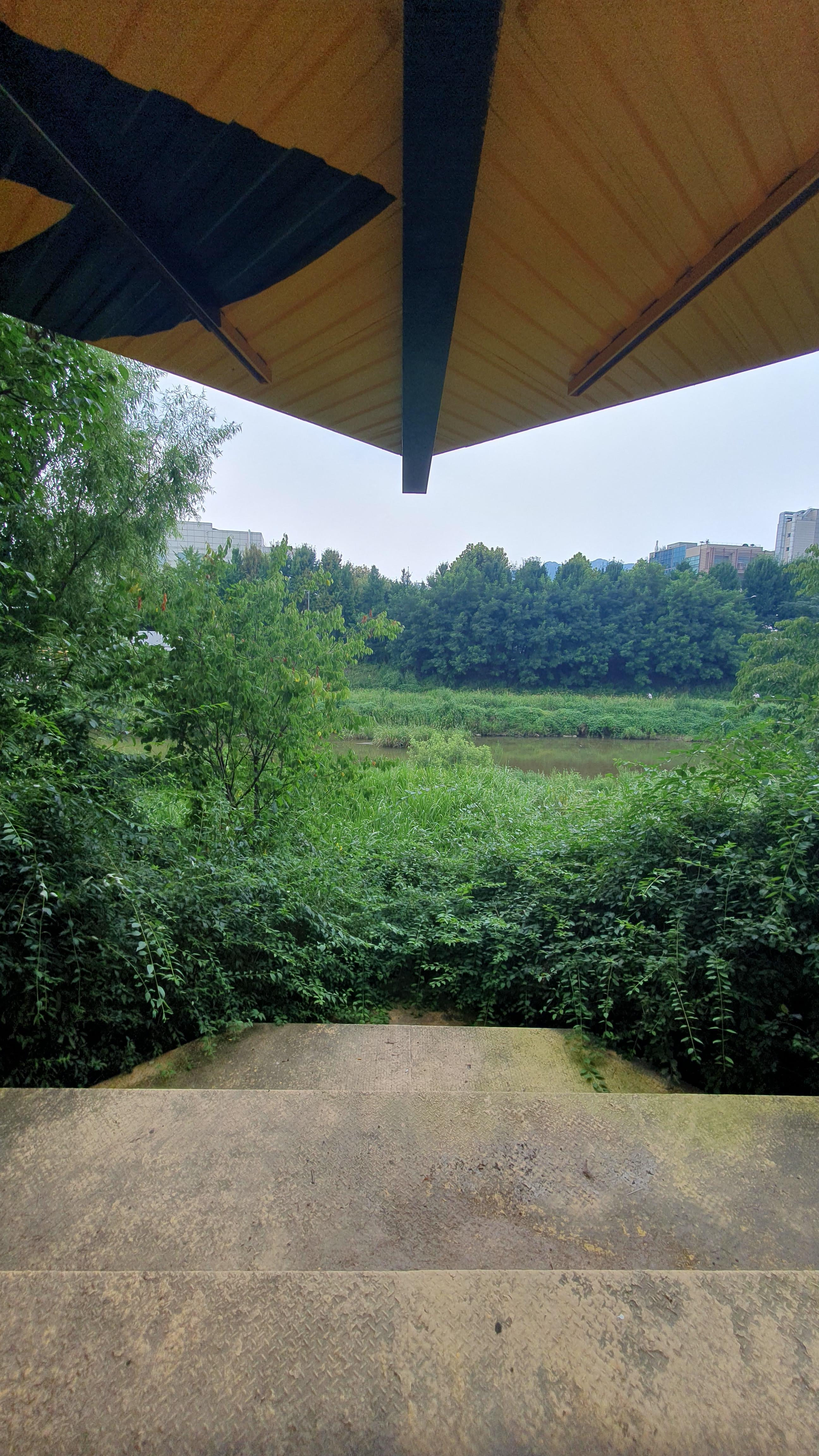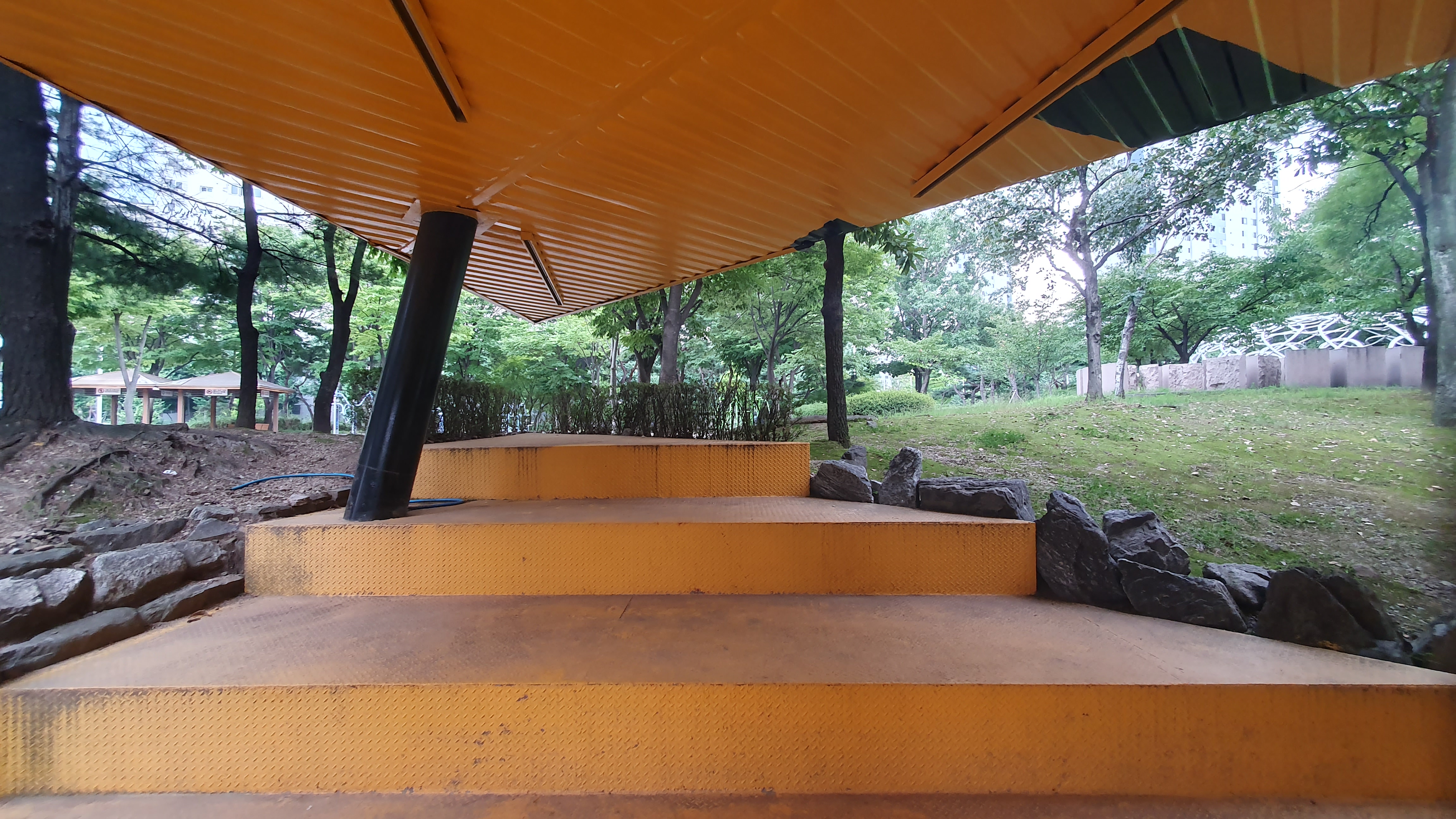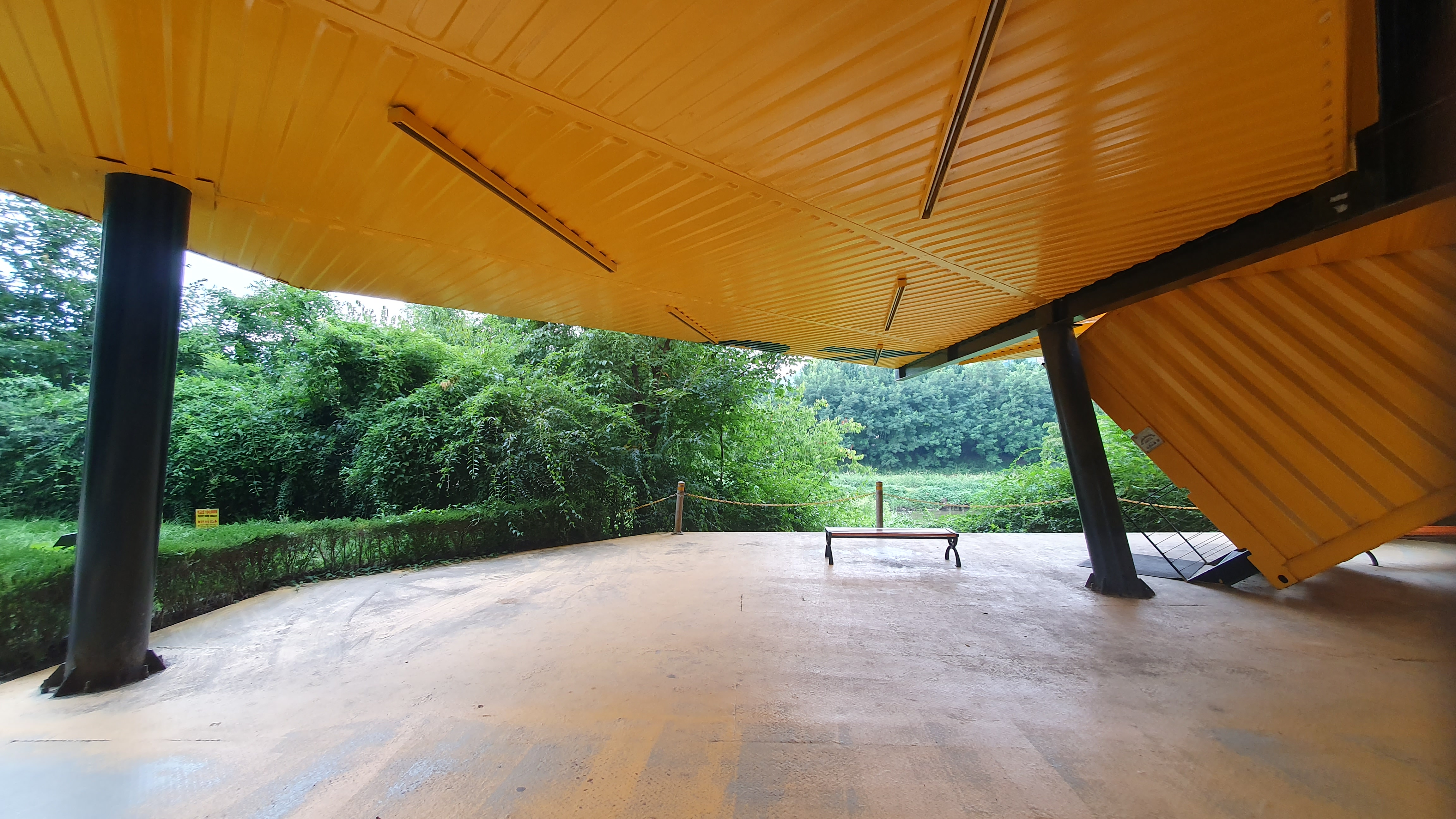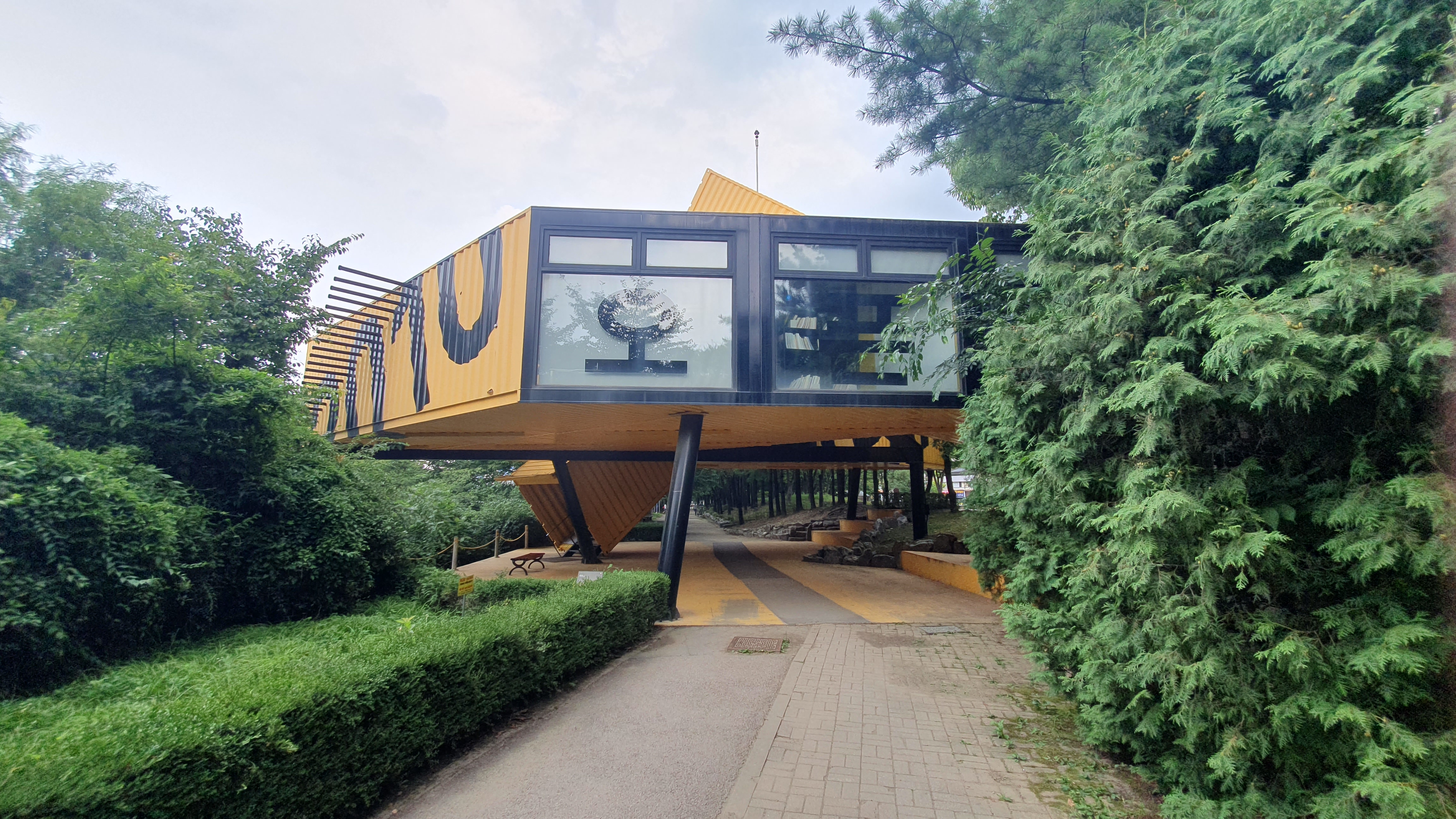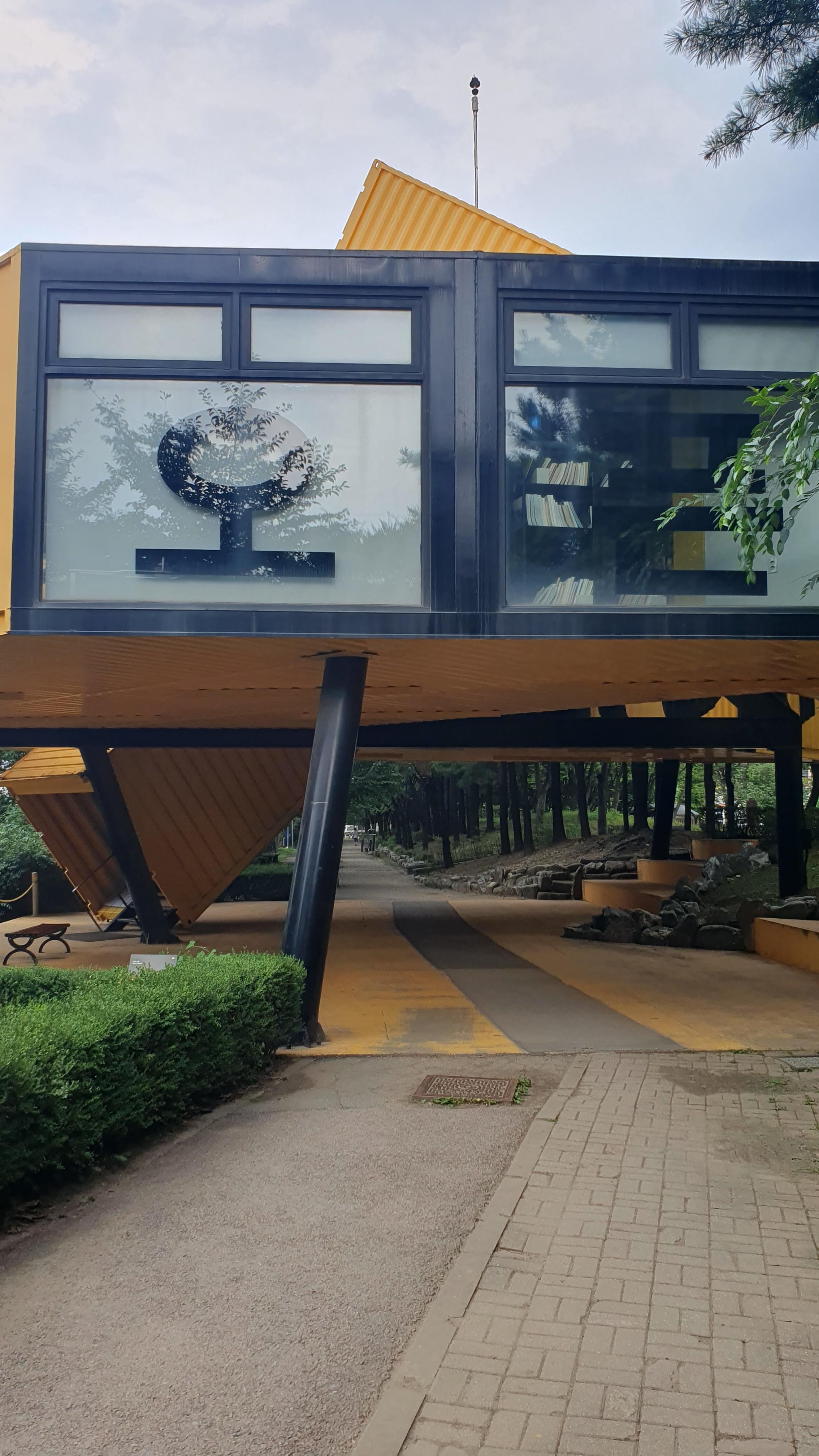 2023,08,06/ #도시기록 #안양 #apap #오픈스쿨 #공공예술 #내비산교 #학운공원B구역/ 안양 학운공원 동쪽 B구역 내비산교 옆에 있는 시설물. 2010년 개최된 제3회 안양공공예술프로젝트(apap)에서 영구작품으로 설치된 오픈스쿨. 뉴욕을 중심으로 활동하고 있는 롯-텍(Lot-Ek)이 설계한 작품으로 건축면적이 238㎡에 달하는 이 구조물은 노란색 컨테이너 8개가 화살표 모양으로 조합돼 있는 필로피 구조로 1층을 공중으로 뛰어 산책로를 확보했고, 실내는 강연과 전시가 가능하도록 설계돼 있다. 2011년 미국 뉴욕건축가협회 주최로 뉴욕에서 열린'2011년 디자인 어워드'에서 치열한 경쟁끝에 건축부문 수상작으로 선정될 만큼 국제적으로도 유명해진 작품이나 제대로 활용을 못한채 마치 버려진듯한 공간으로 전락해 안타깝다.