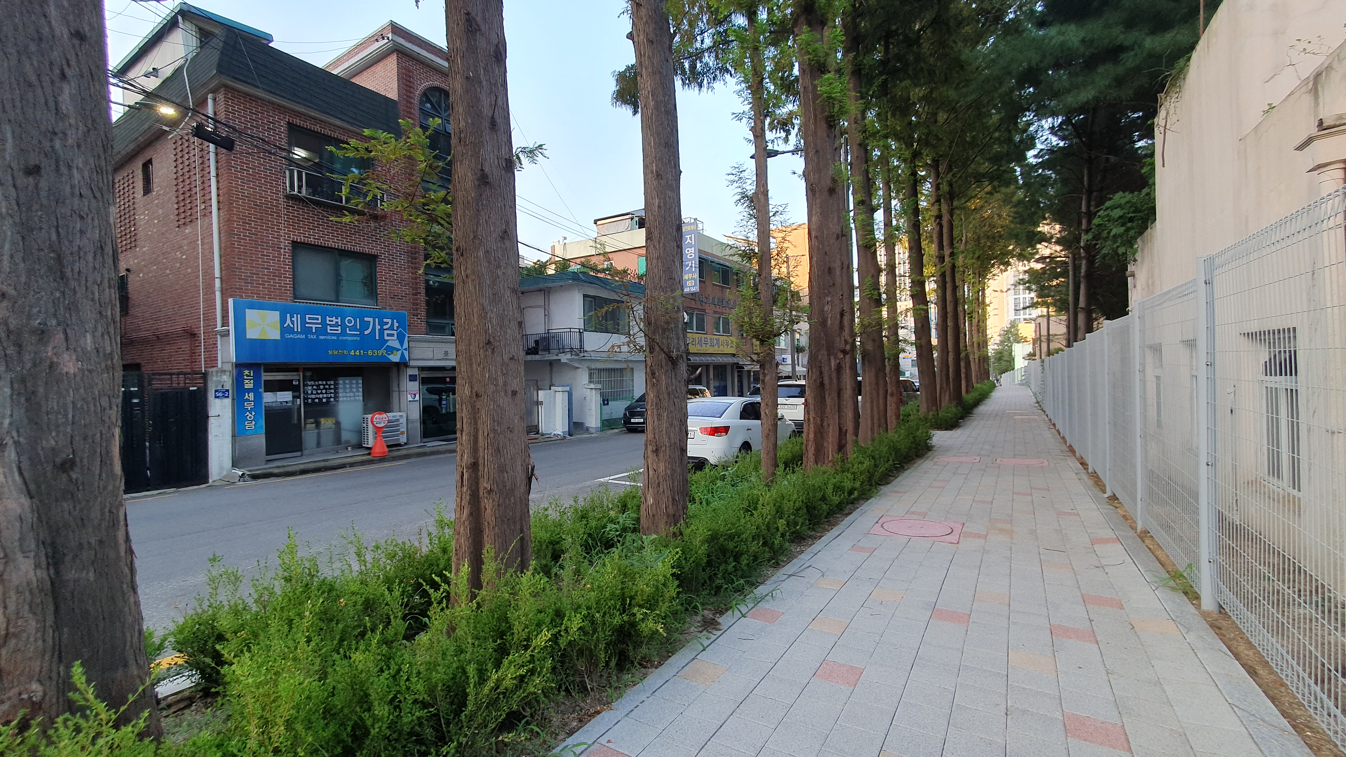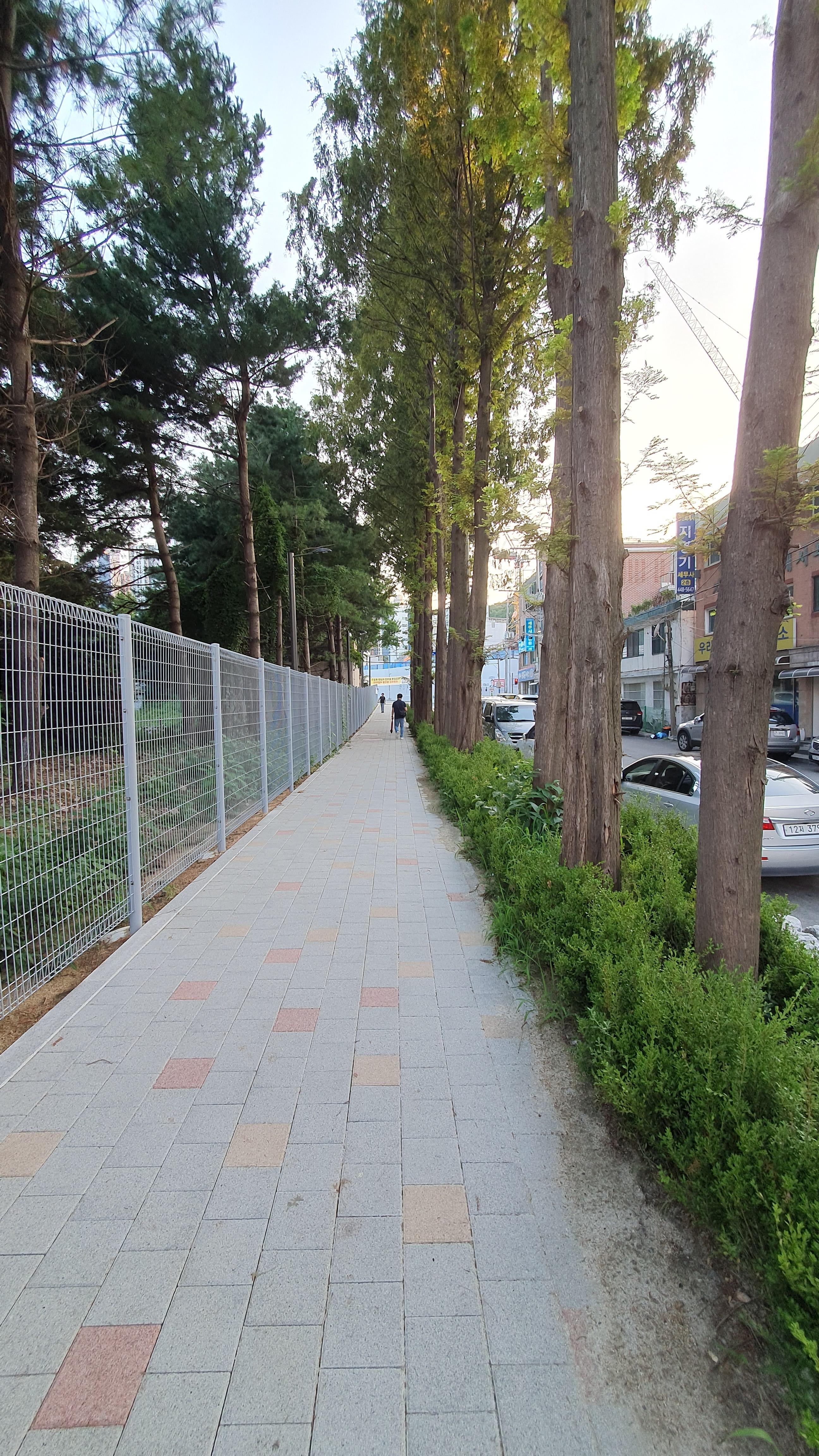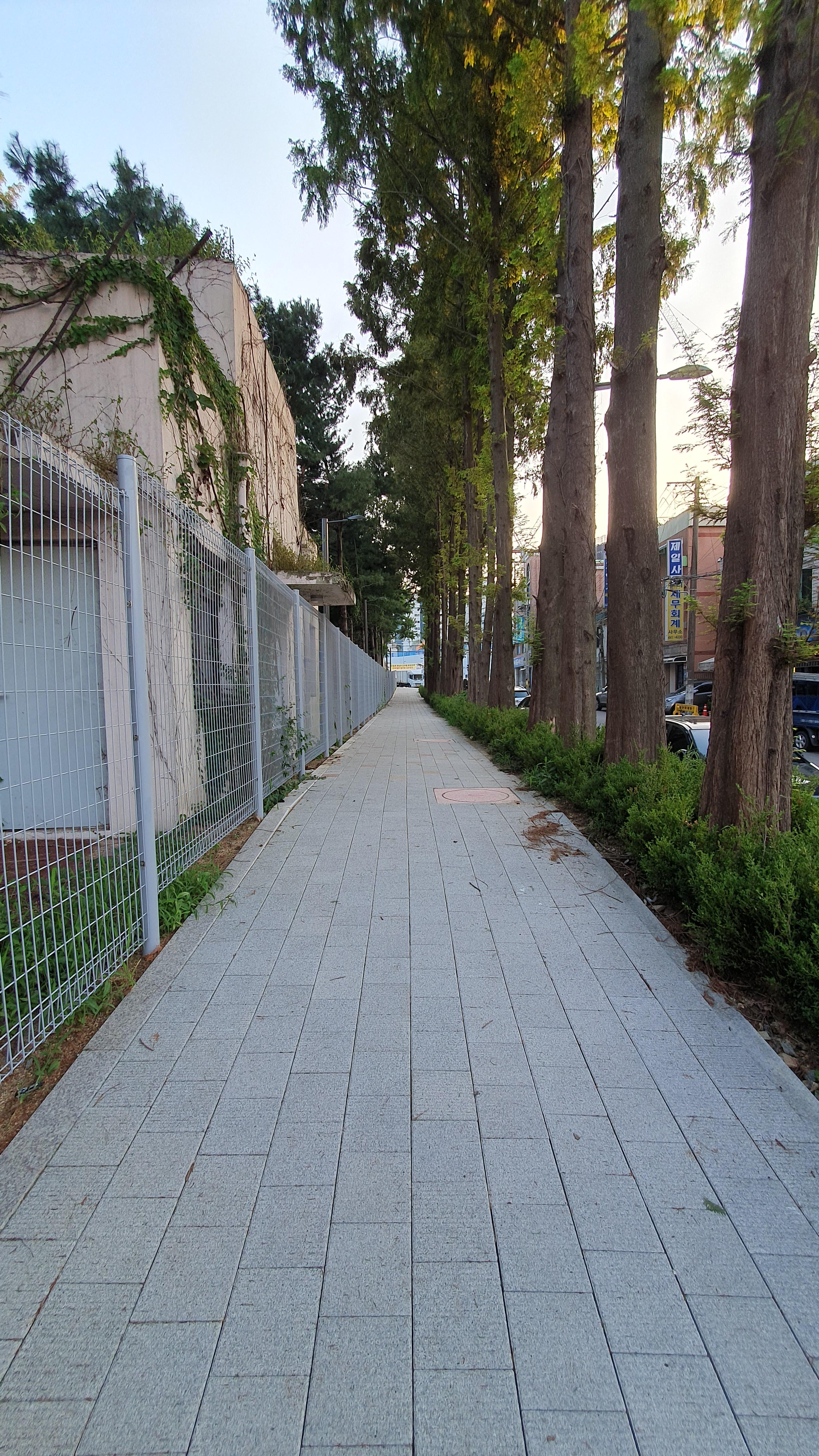 2023.08.25/ #도시기록 #안양 #안양6동 #소곡로 #인도 #통학로/ 안양6동 소곡로에서 만난 풍경. 소곡로 남쪽 옛검역원 북쪽 담장을 부지 안쪽으로 셋백시켜 조성한 보행로(인도). 생겨 소곡자이아파트 등 안양6동에서 안양초교로. 중앙로 도로 버스정류장에서 신성중.고교로 통학하는 학생들이 안전하고 편리하게 걸어다닐수 있게됐다. 안양세무서 끝자락에서 중앙로(은혜와진리교회 남쪽사거리)와 연결되는 이 도로는 소곡천을 복개하여 만든 길로 길폭이 좁아 인도가 없었다. 안양시는 검역원 담장을 허물고 부지 안쪽으로 보행로를 만들었다. 담장을 허문 일부 구간에는 기존에 심어져있던 메타쉐콰이어 가로수가 자라고 있어 나무숲 그늘이 생겨 땡볕 여름철 그늘 사이로 쾌적하게 다닐 수 있는 걷고싶은 길로 탄생했다.