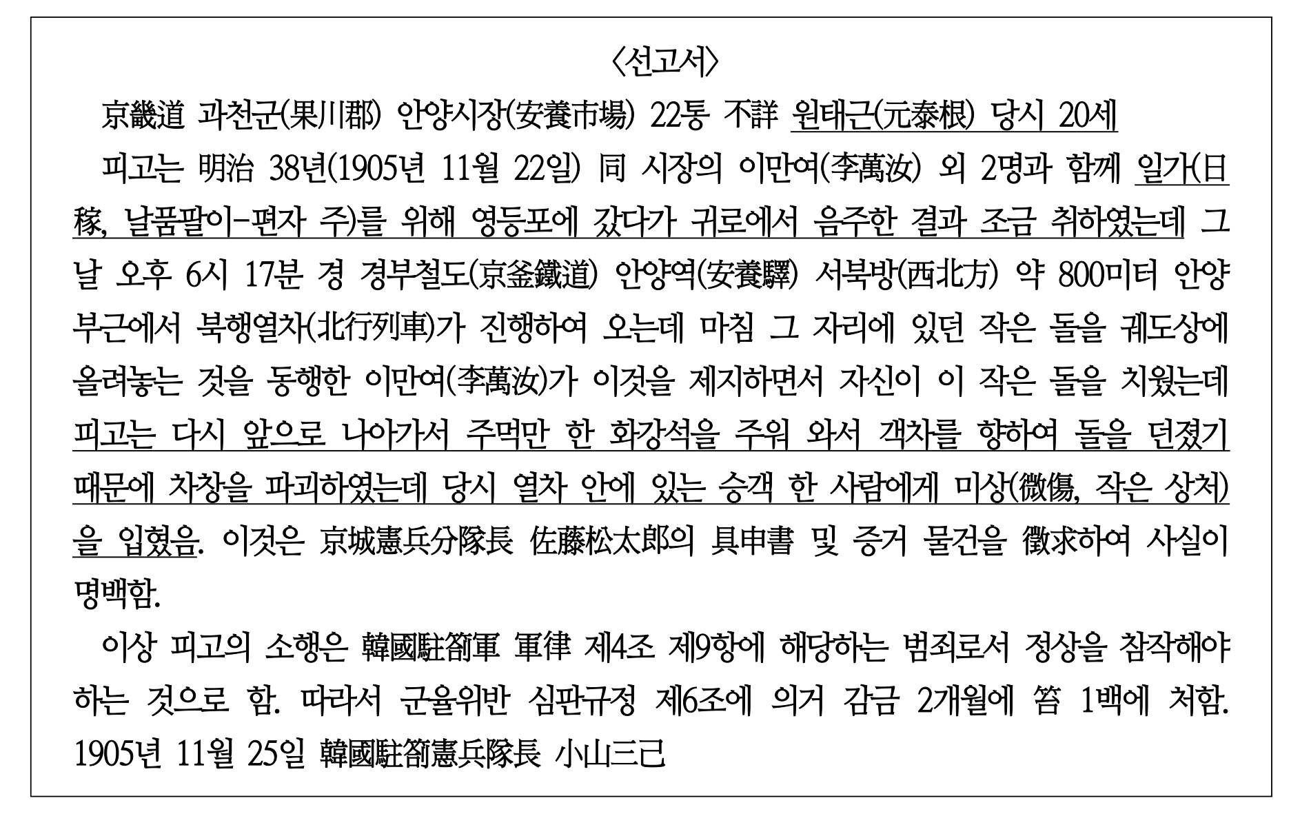 11월 22일 저녁 안양역에 일어난 사건을 처음 보도한 위의 ‘돌멩이가 어떻게 왔는가’라는 기사에서는 ‘홀연’ 돌멩이가 날아왔을 뿐 누가, 왜 던졌는지를 전혀 알 수 없다. 또한 돌멩이가 날아와 차창이 깨지고 부서져 이토 히로부미가 상처를 입었다고 보도했지만, 얼마나 심한 상처를 당했는지, 돌을 던진 범인이 혼자인지 아니면 여럿인지, 범인을 어떻게 했는지는 밝히지 않고 있다. 누가 거사를 일으켰는지 신문보도에서는 알 수 없다. 다만 거사 직후 6일 만인 1905년 11월 25일 한국주차헌병대장(韓國駐箚憲兵隊長)인 고야마 미키(小山三己)가 작성한 <선고서>를 통해 당시 상황의 일부를 알 수 있다.7) 돌멩이를 던진 범인을 붙잡아 조사한 후 어떻게 처리했는지를 밝힌 보고서이므로 전문을 소개해본다